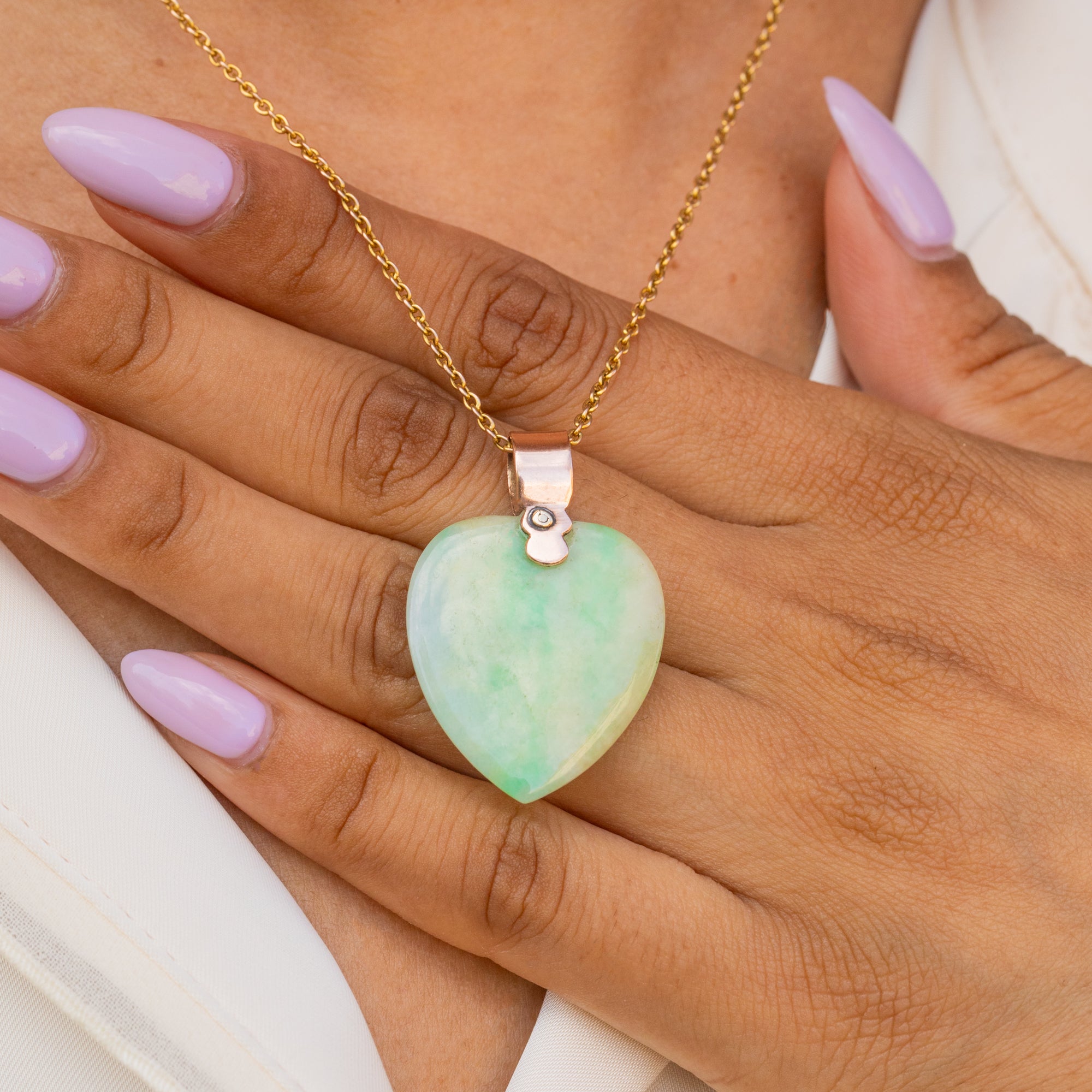 This antique 9ct Gold Jade heart pendant is heavenly! The smooth cut of Jade flaunts mint green hues marbling through her core, with ripples of fern across her surface.