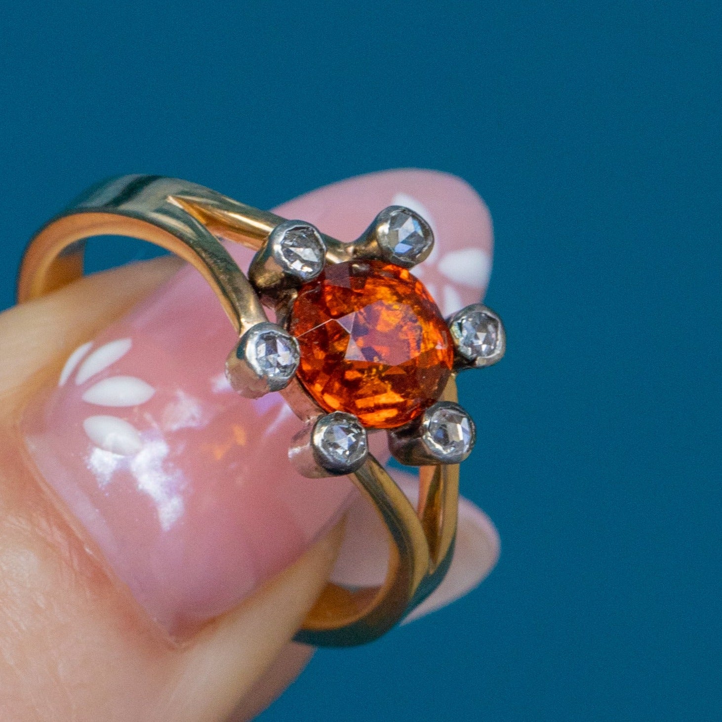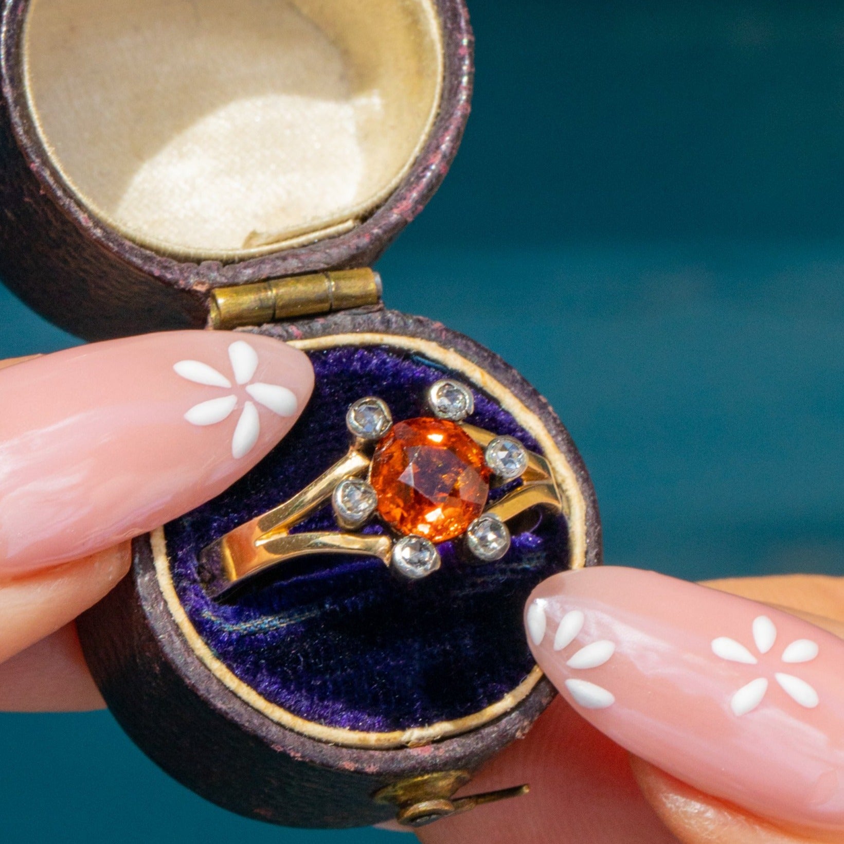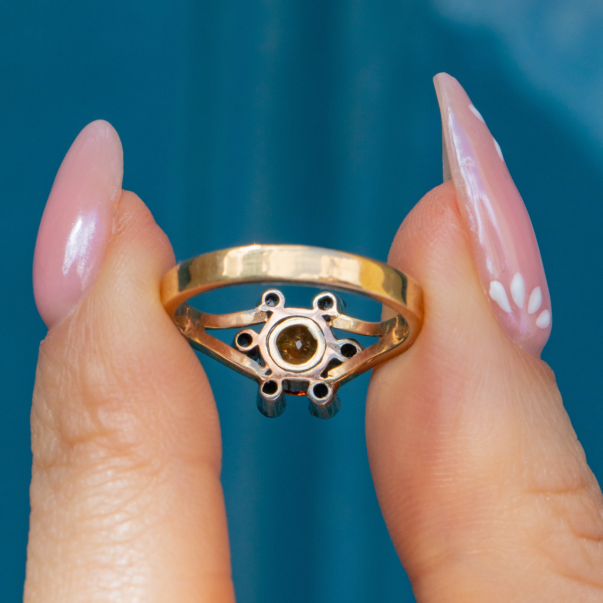 We adore this antique 9ct Gold Madeira Citrine Diamond ring! The ring band has been made from 9ct Yellow Gold splitting at the shoulders to meet a sumptuous Madeira Citrine and rose-cut Diamond cluster.