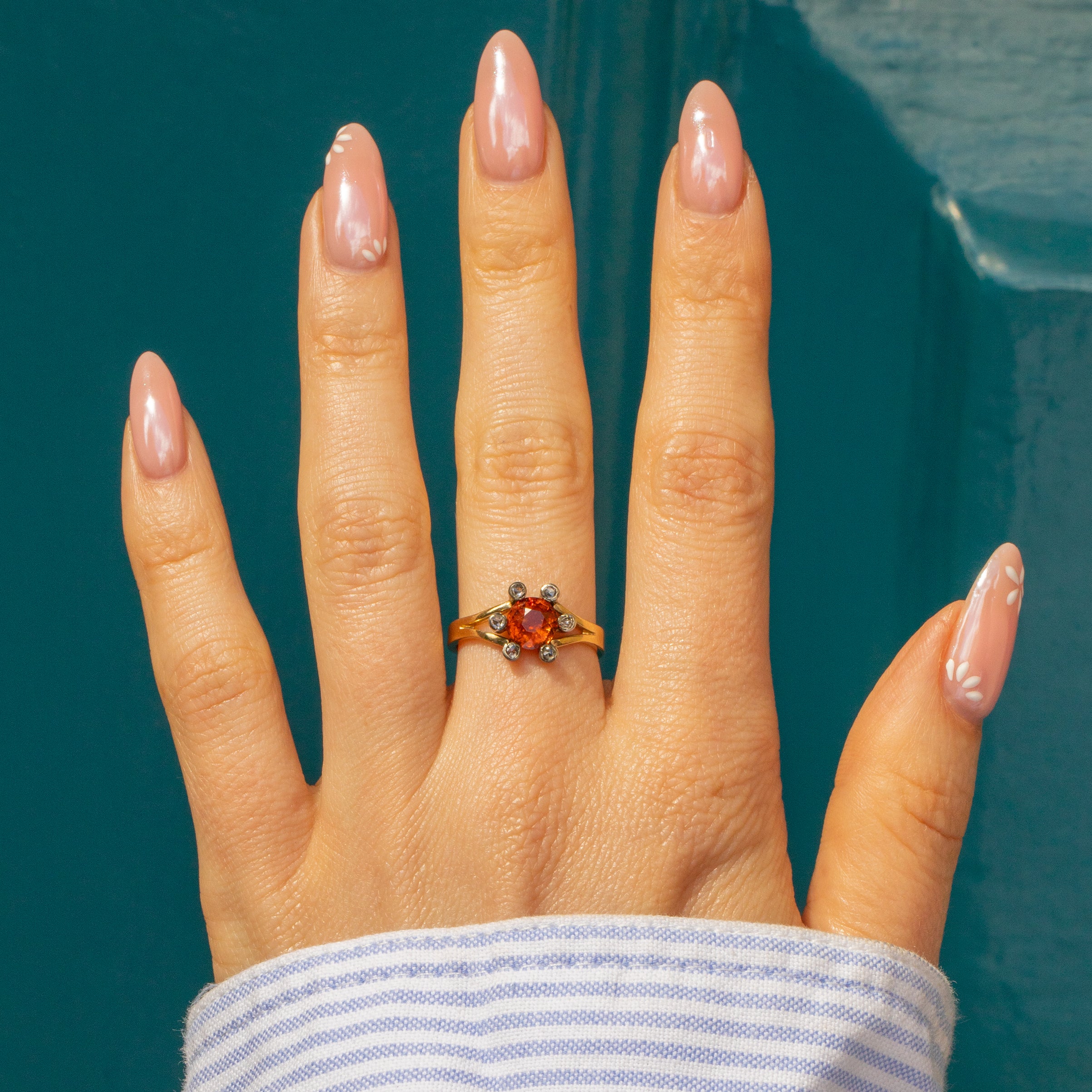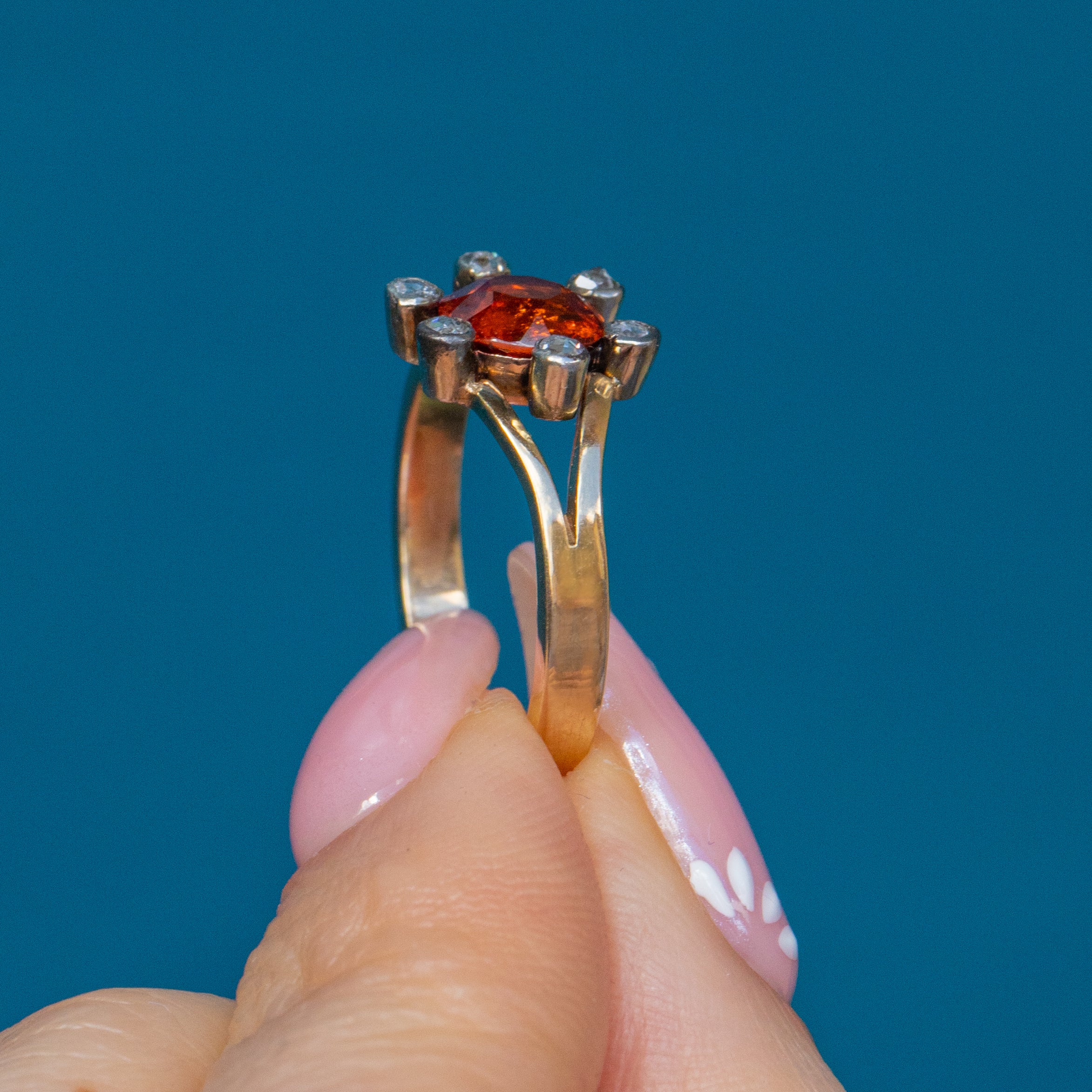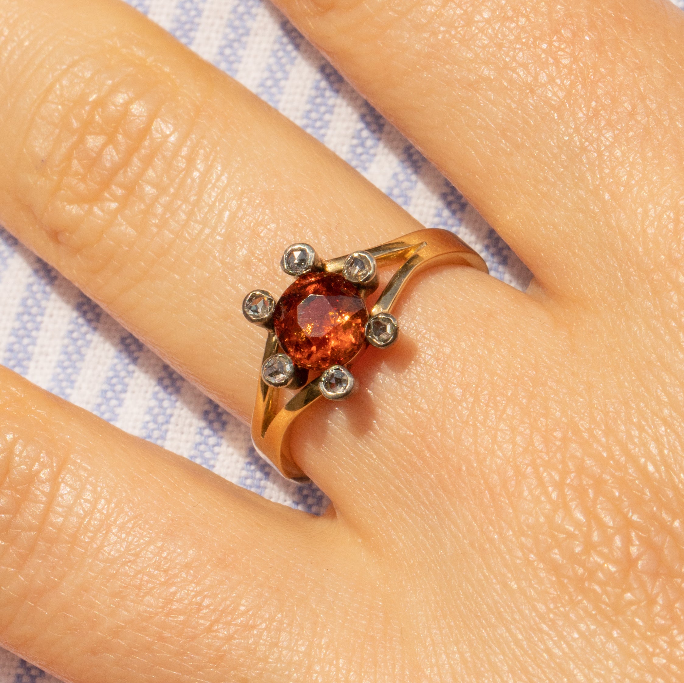 We adore this antique 9ct Gold Madeira Citrine Diamond ring! The ring band has been made from 9ct Yellow Gold splitting at the shoulders to meet a sumptuous Madeira Citrine and rose-cut Diamond cluster.