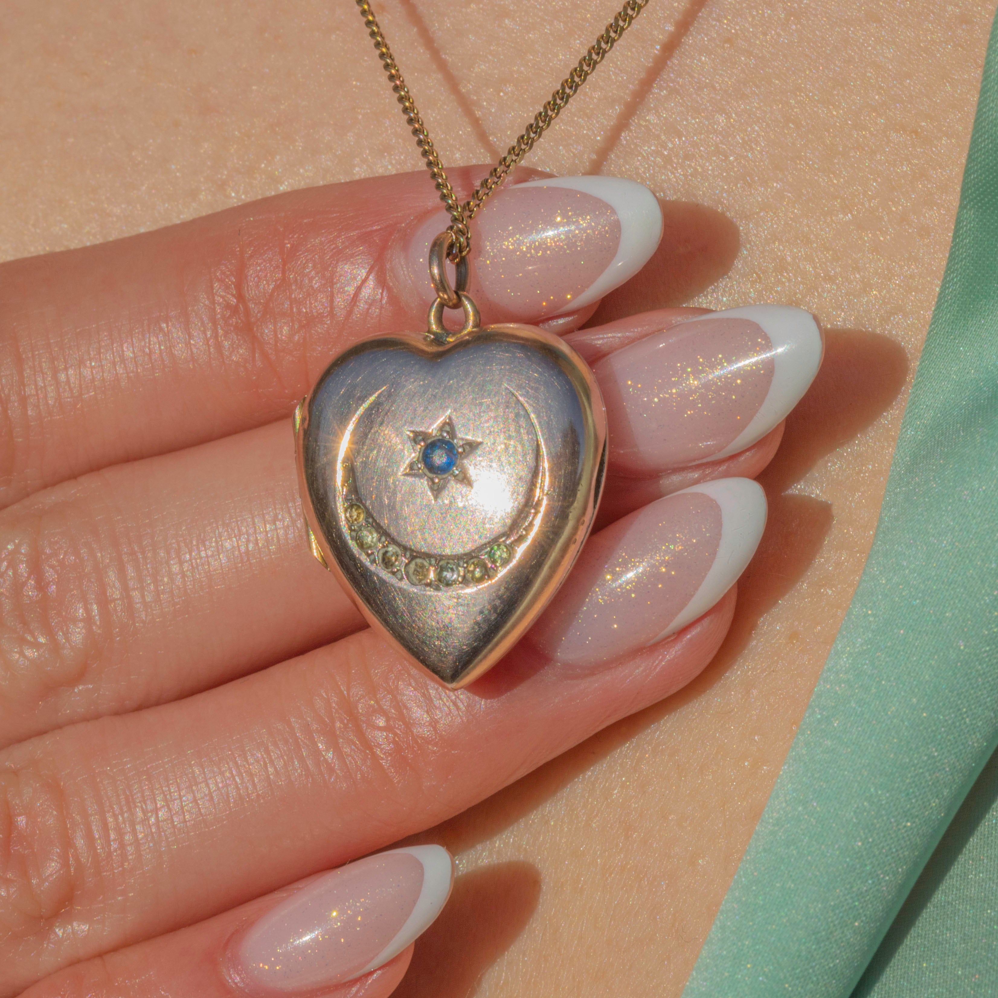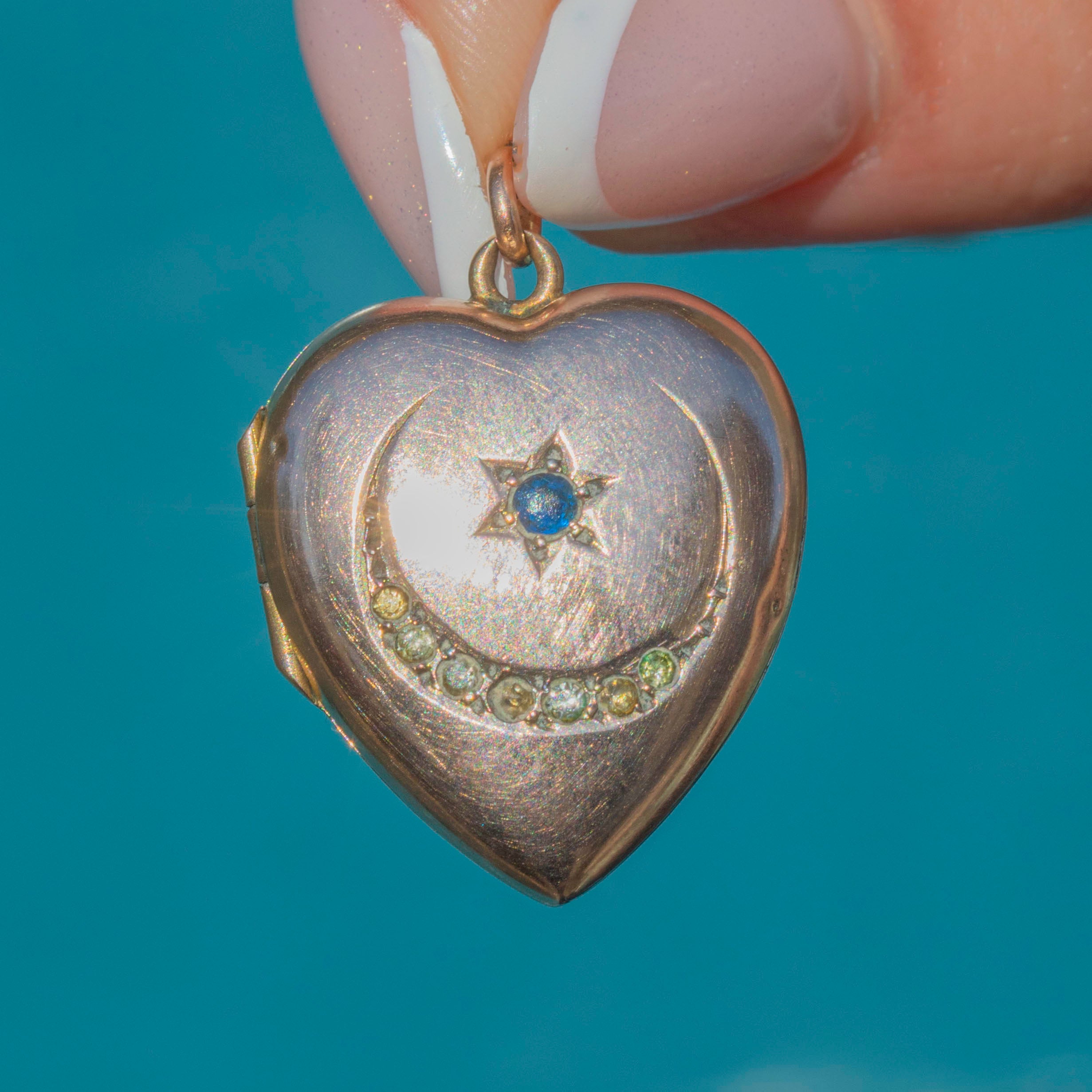 A sweet antique 9ct Gold moon & Stars blue Paste heart locket! This late Victorian locket is oh-so romantic, and we always love a celestial touch.