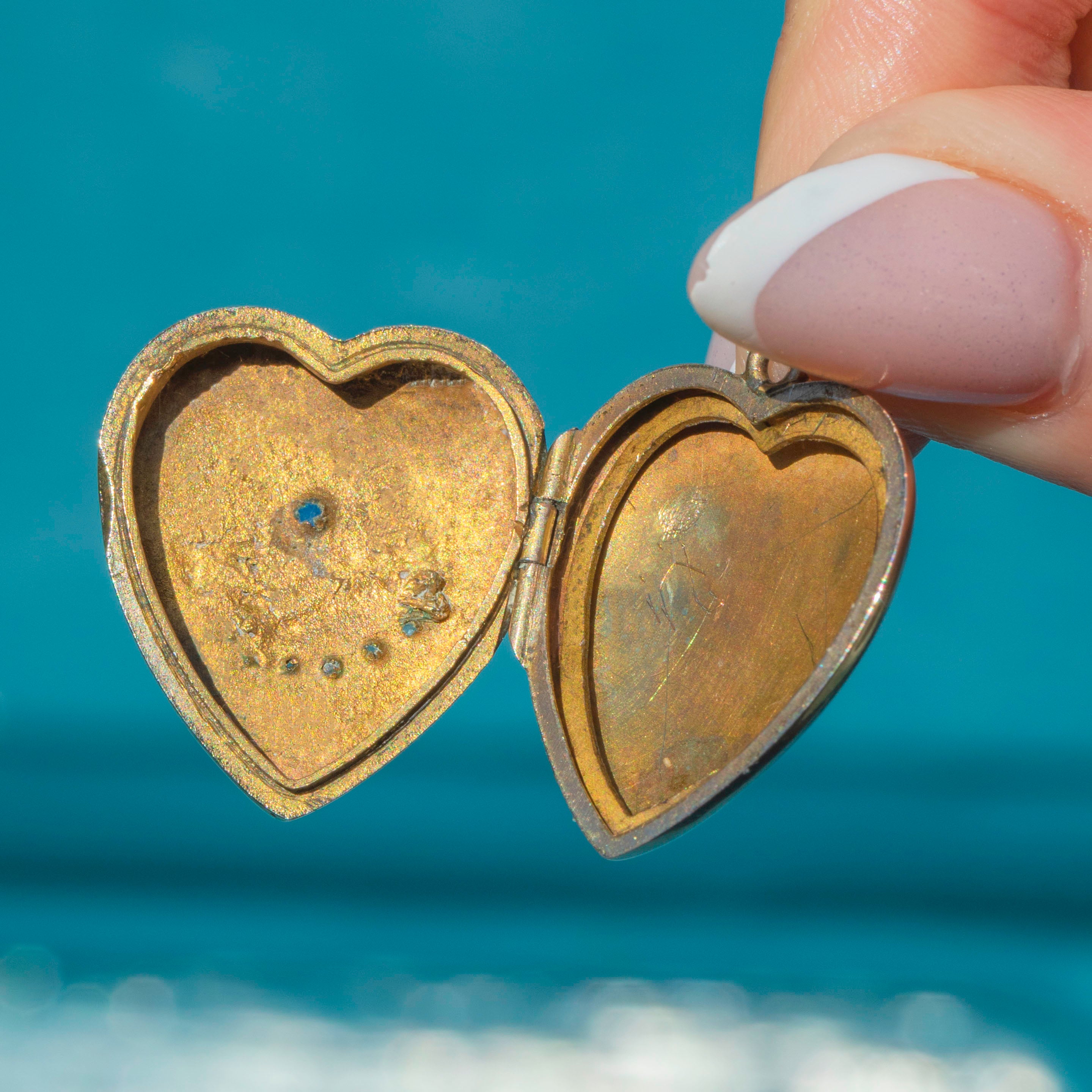 GOOD. This antique 9ct Gold moon & stars blue Paste heart locket is in good condition. The locket has kept its shape well, and the motif on the front has remained intact with all Paste gems accounted for. There is one ding noticeable as you open the locket, near the lip, but looking front on this isn't obvious. The inside of the locket has some surface wear to note, commensurate with age, but this can be concealed with your photos. There is some wear to the hasp, from where it has so lovingly been worn throughout the years, but you can wear this piece with your favourite chain for years more!