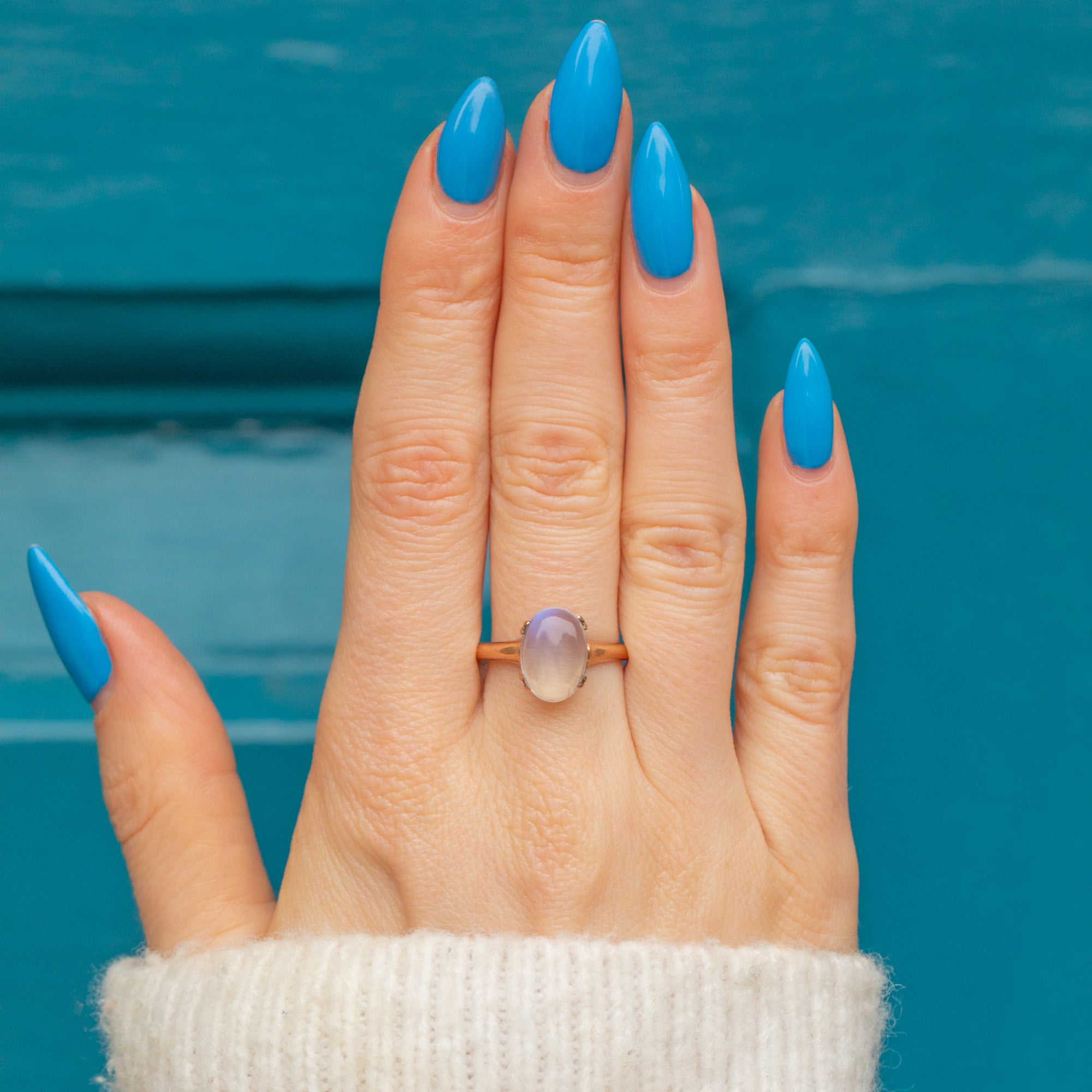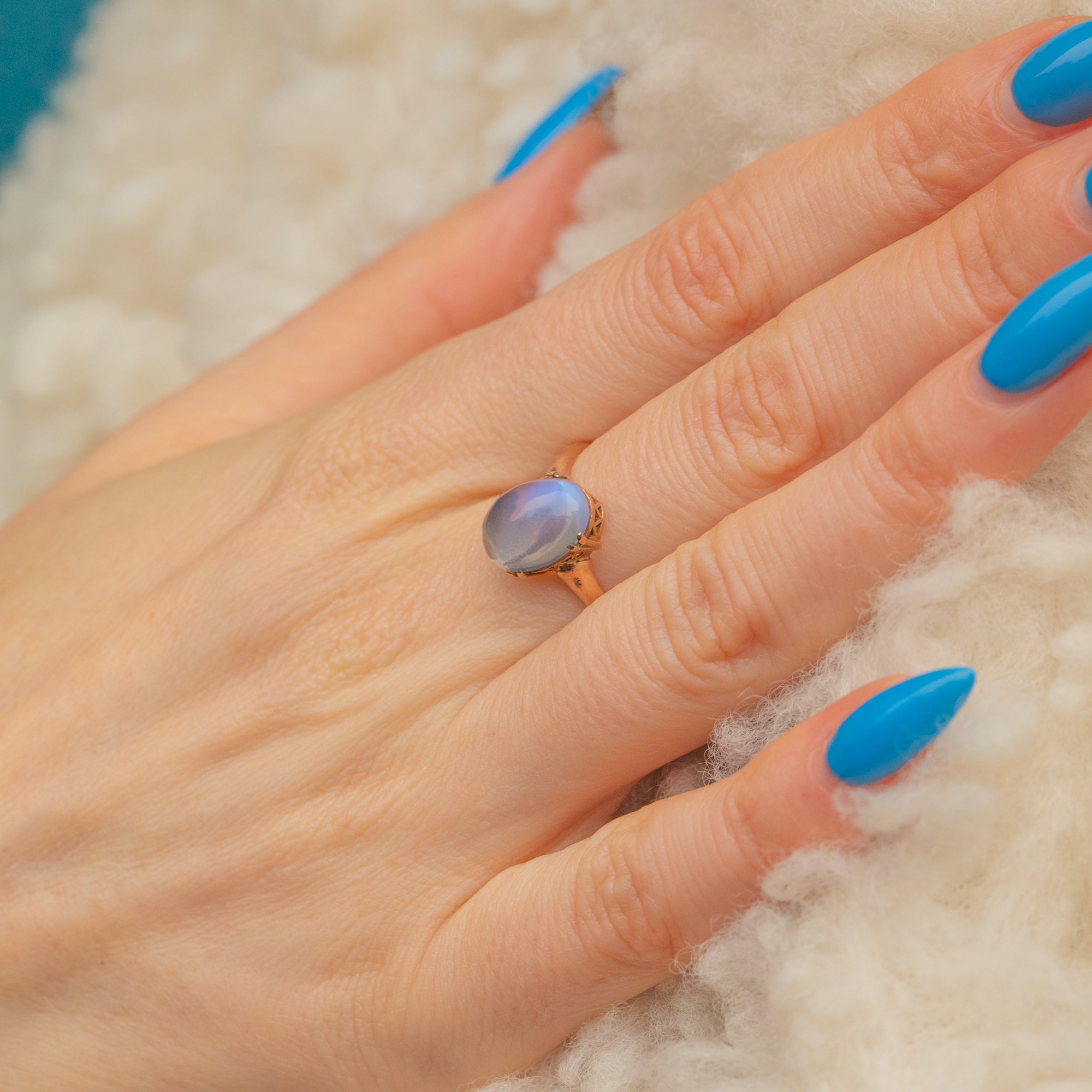 Displayed comfortably within her claw settings, this antique Moonstone ring features a gorgeous gallery and looks magnificent against the warmth of her 9ct Gold band. A stone associated with balance and relaxation, this Moonstone solitaire ring will bring a wave of calm to its wearer!