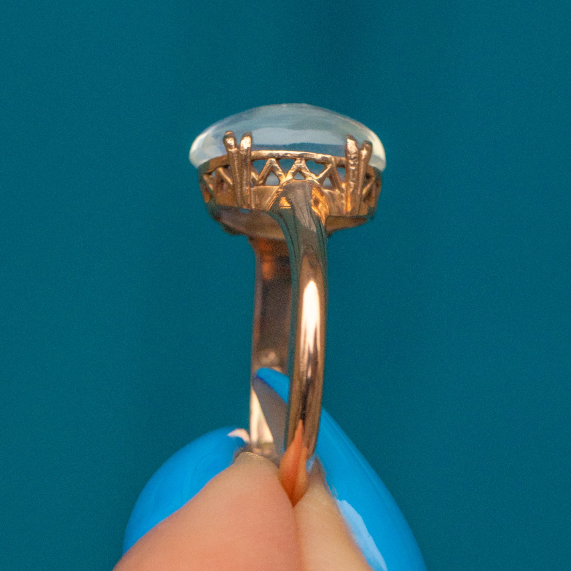 A majestic antique 9ct Gold Moonstone cabochon ring to add to your stack! Be transfixed by her soft iridescent lustre that billows across the smooth 2.70ct Moonstone cabochon; this Victorian ring is one to be admired.