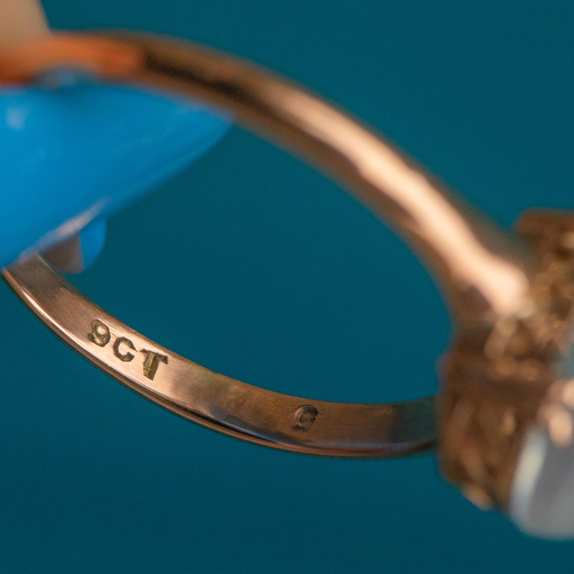 EXCELLENT. This antique 9ct Gold Moonstone cabochon ring is in wonderful condition. Her Moonstone is radiant, with some minor surface wear only noticeable under a jeweller's loupe. She sits securely within her 9ct Gold claw settings and band, which is free from any visible signs of wear. In brilliant condition, she is a must have!