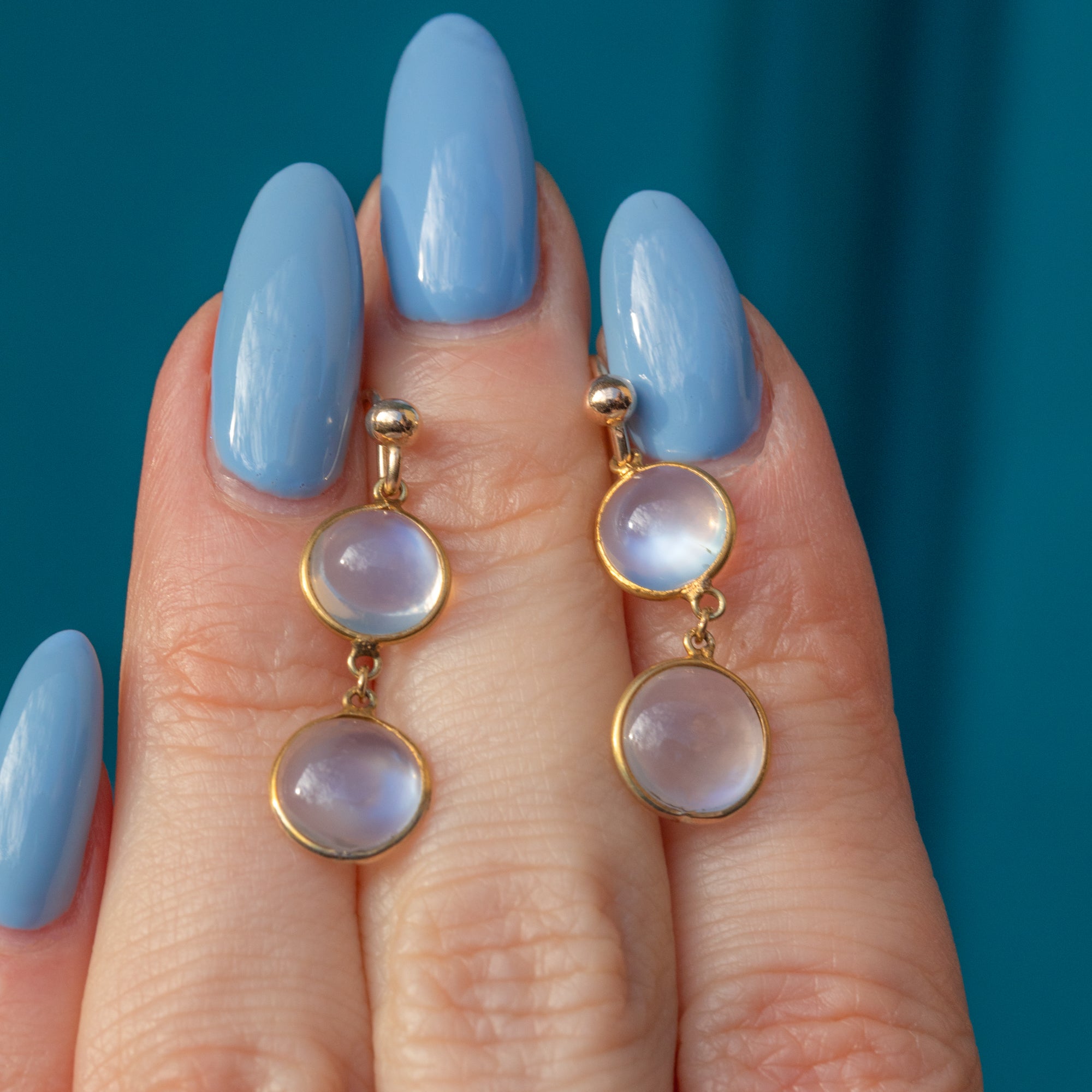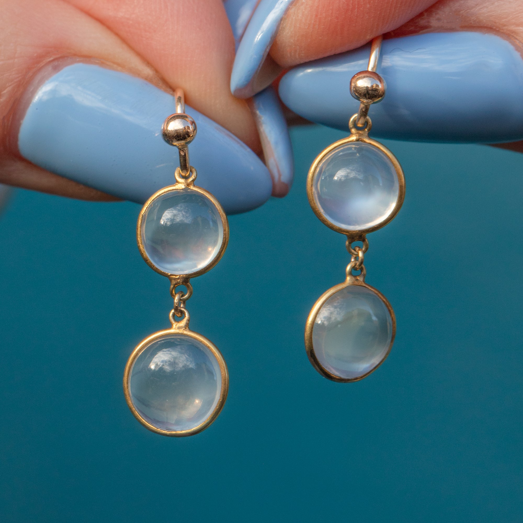 EXCELLENT. These antique 9ct Gold moonstone drop earrings are in excellent condition. Each Moonstone sits securely within her bezel and is free from any scuffs or scratches.