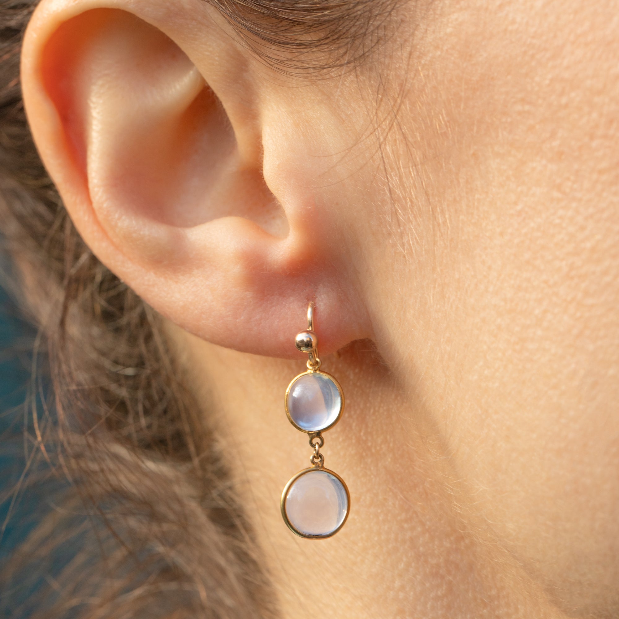 Crafted from 9ct Gold, each antique drop earring features two plump Moonstone cabochons, billowing in the light with an ethereal magic. The Moonstones are complemented by warm 9ct Gold bezels and dance effortlessly as they suspend from your lobes.