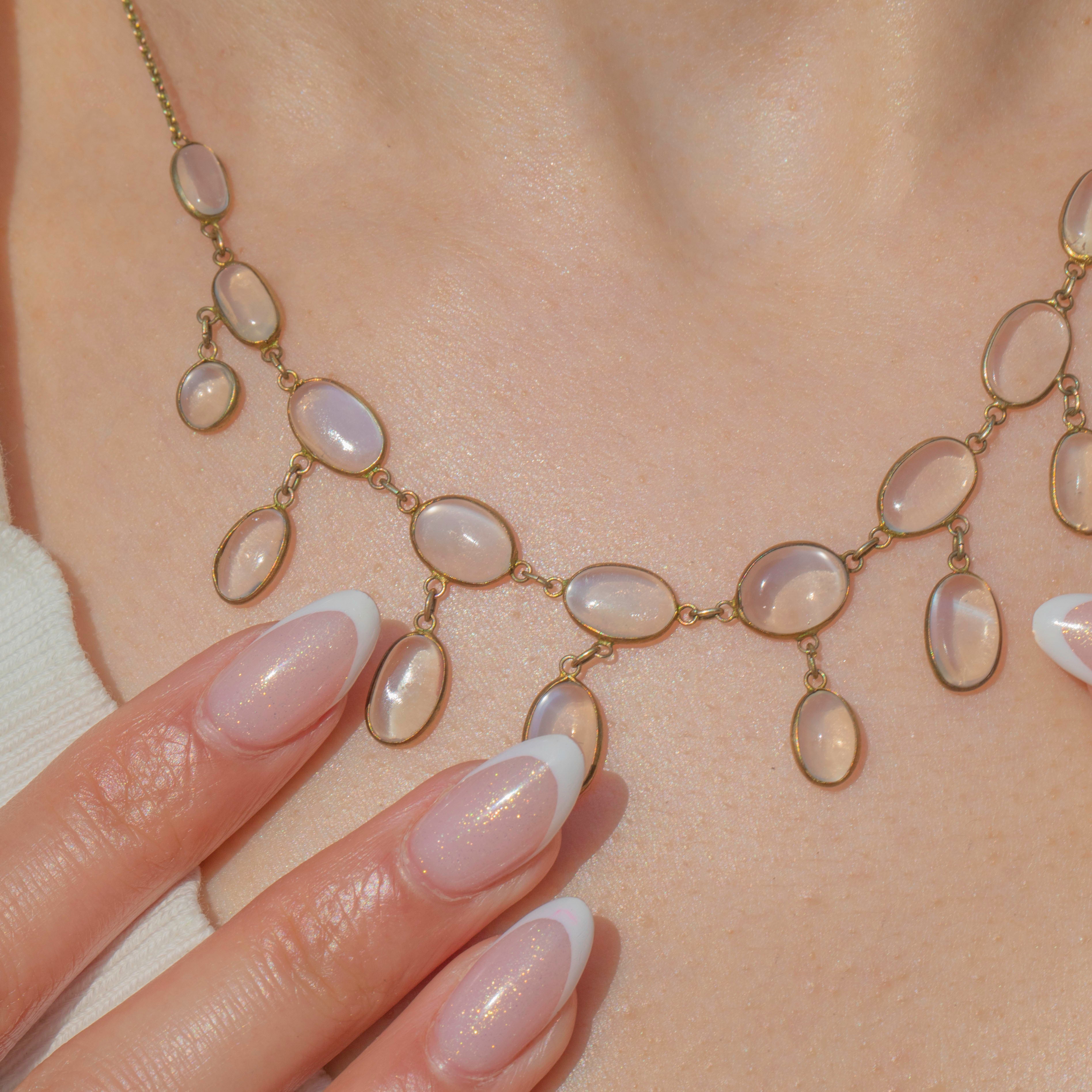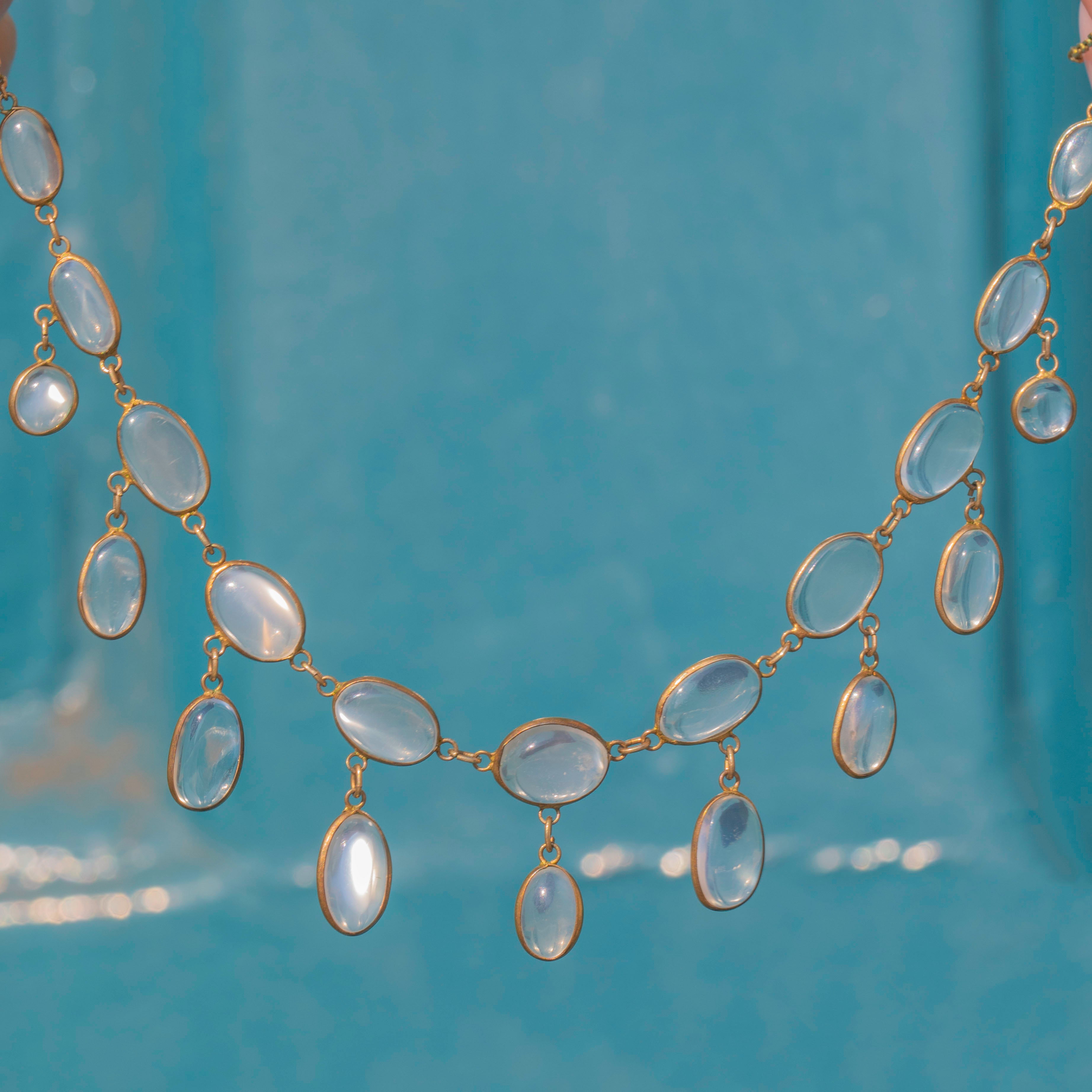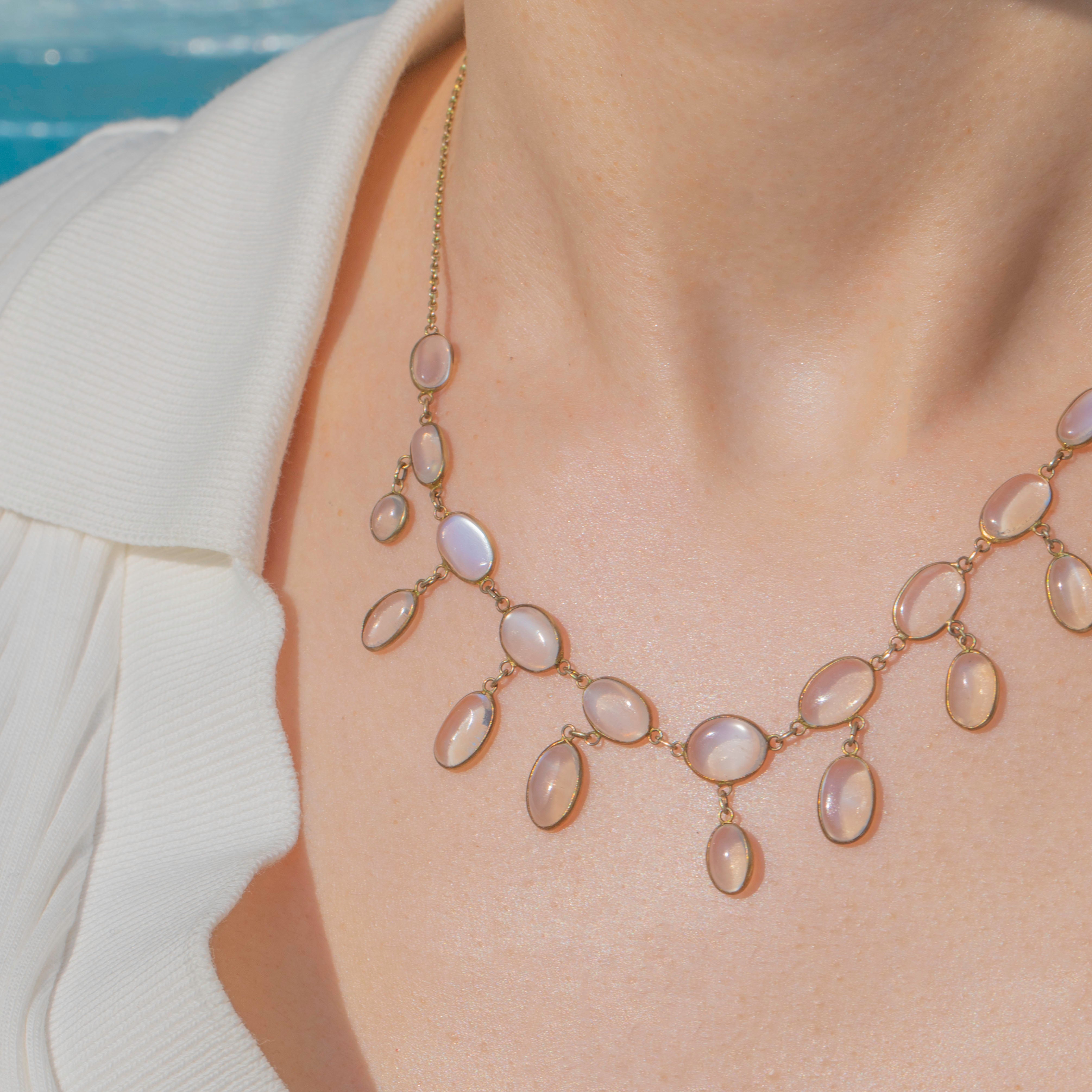 Boasting twenty iridescent Moonstones, this Victorian fringe necklace billows effortlessly in the light, with each gemstone boasting a silvery adularescence.