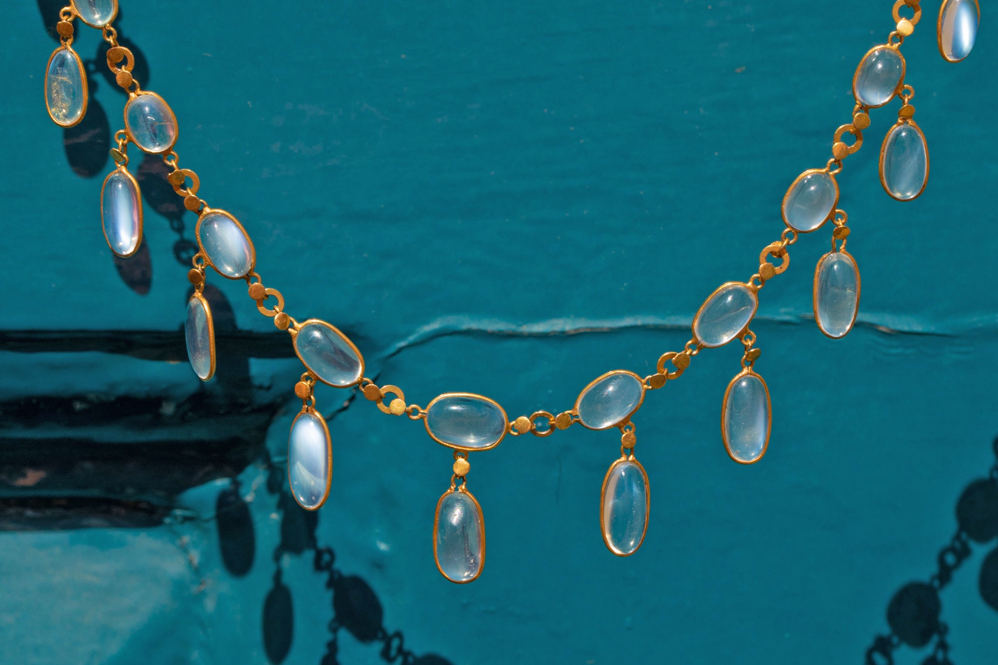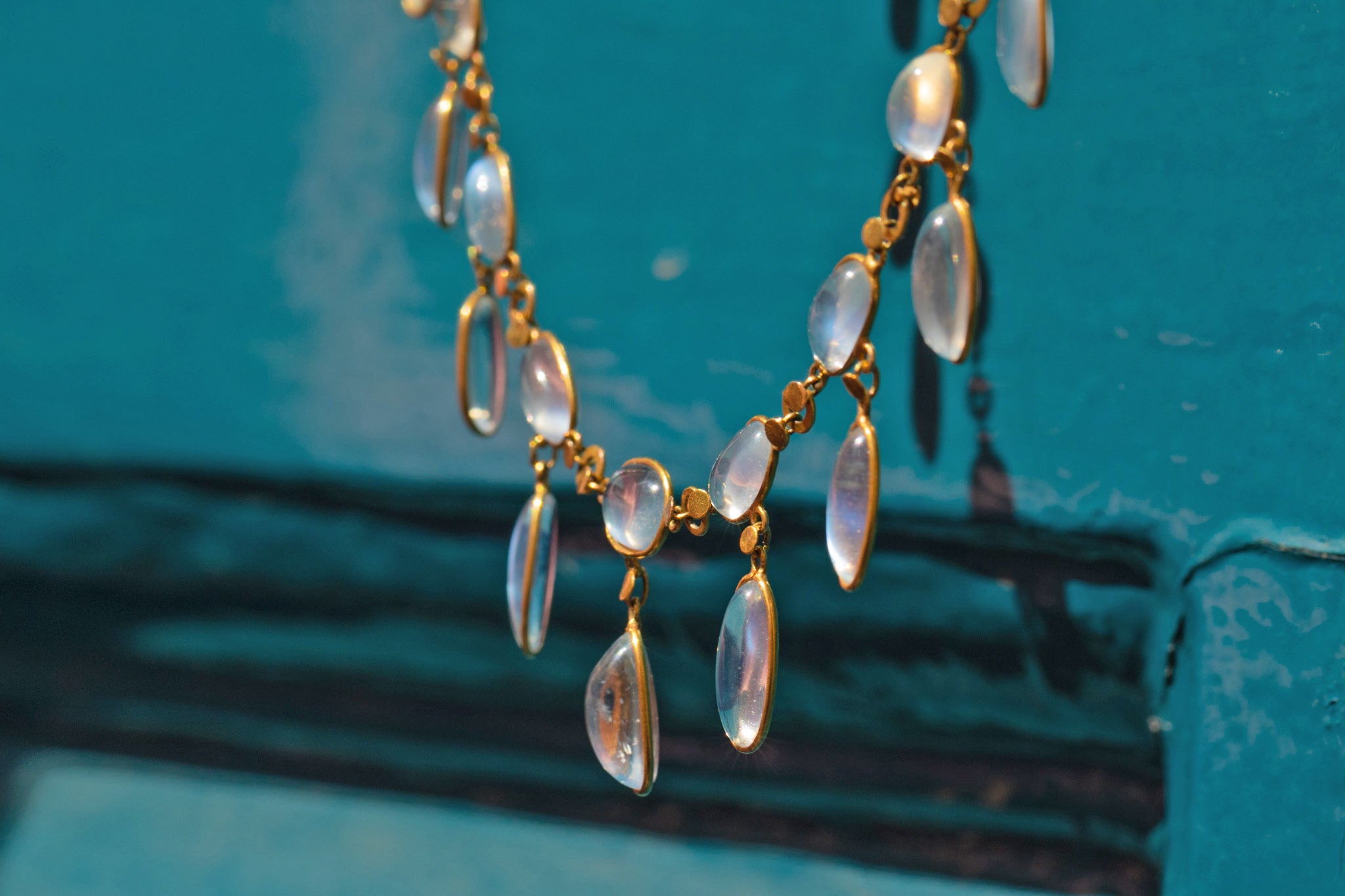 A regal antique 9ct Gold Moonstone fringe necklace fit for the jewellery box of a princess! This exquisite Victorian necklace boasts 24.40ct of luminous Moonstones encased in 9ct Gold, displayed within a bright and buttery 9ct Gold fancy link chain.