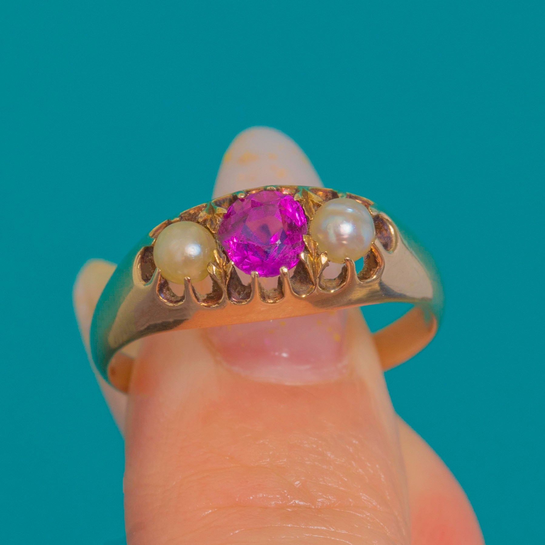 EXCELLENT: The Ruby is bright with crisp facets and no noticeable chips or abrasions; the Pearls are secure with natural surface characteristics typical for age. The Gold collets, gallery and tapered shank are in excellent order with only light surface wear and a gentle antique patina. No obvious signs of repair or resizing are present; any faint internal colour change to the shank is not conclusive of a previous size alteration.