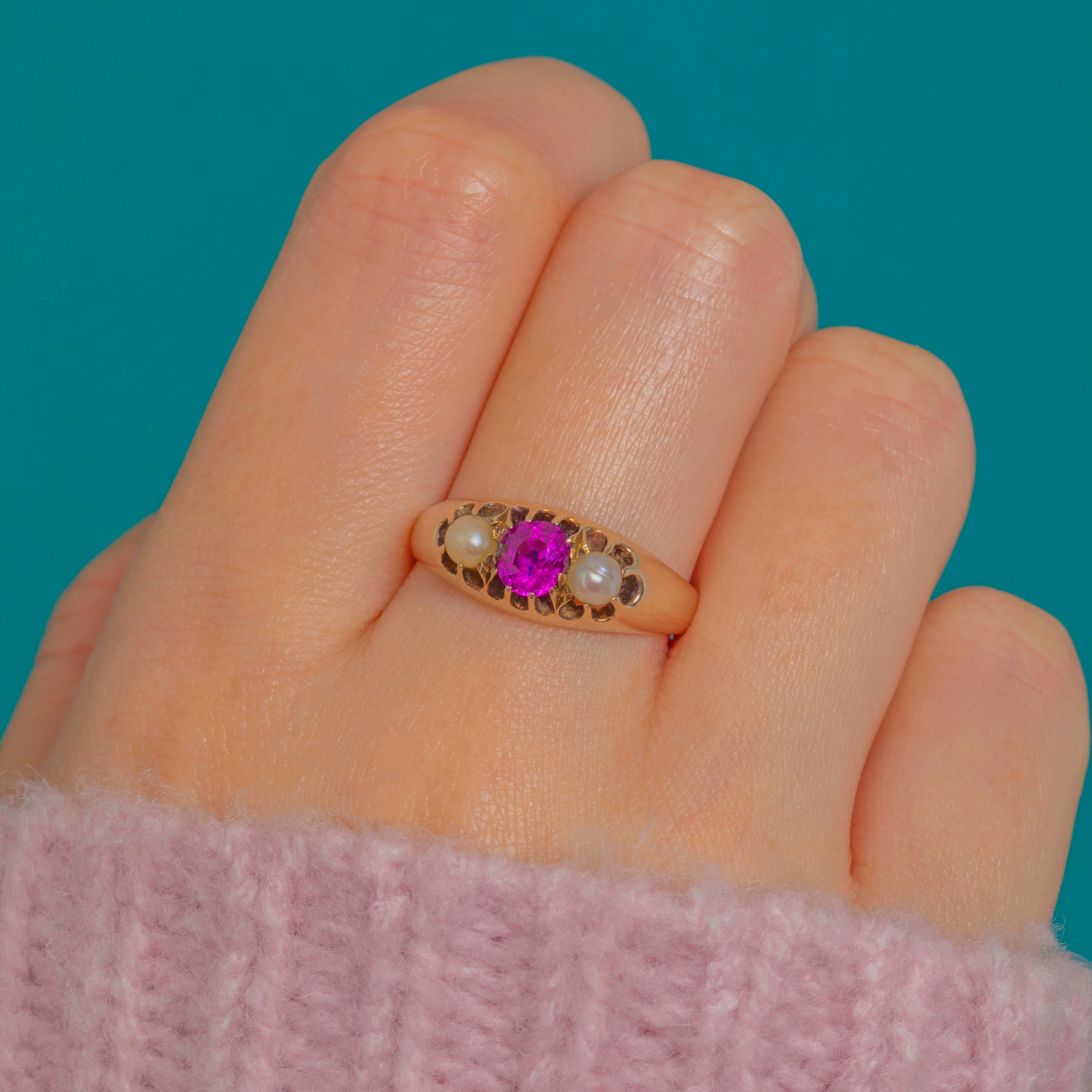 A delicate Victorian trilogy ring crafted in warm 9ct Gold, set with a vivid Natural Ruby between creamy Pearls. The centre Ruby glows a lively pinkish-red, secured in a scalloped closed-back collet that’s complemented by a pierced gallery for a touch of antique lacework charm.