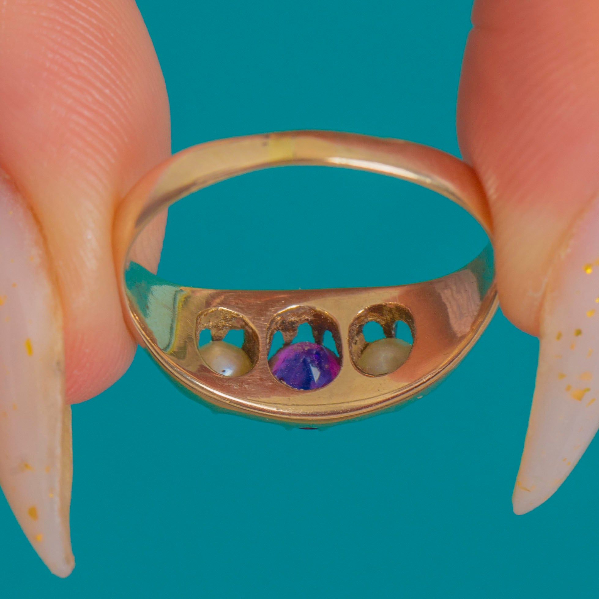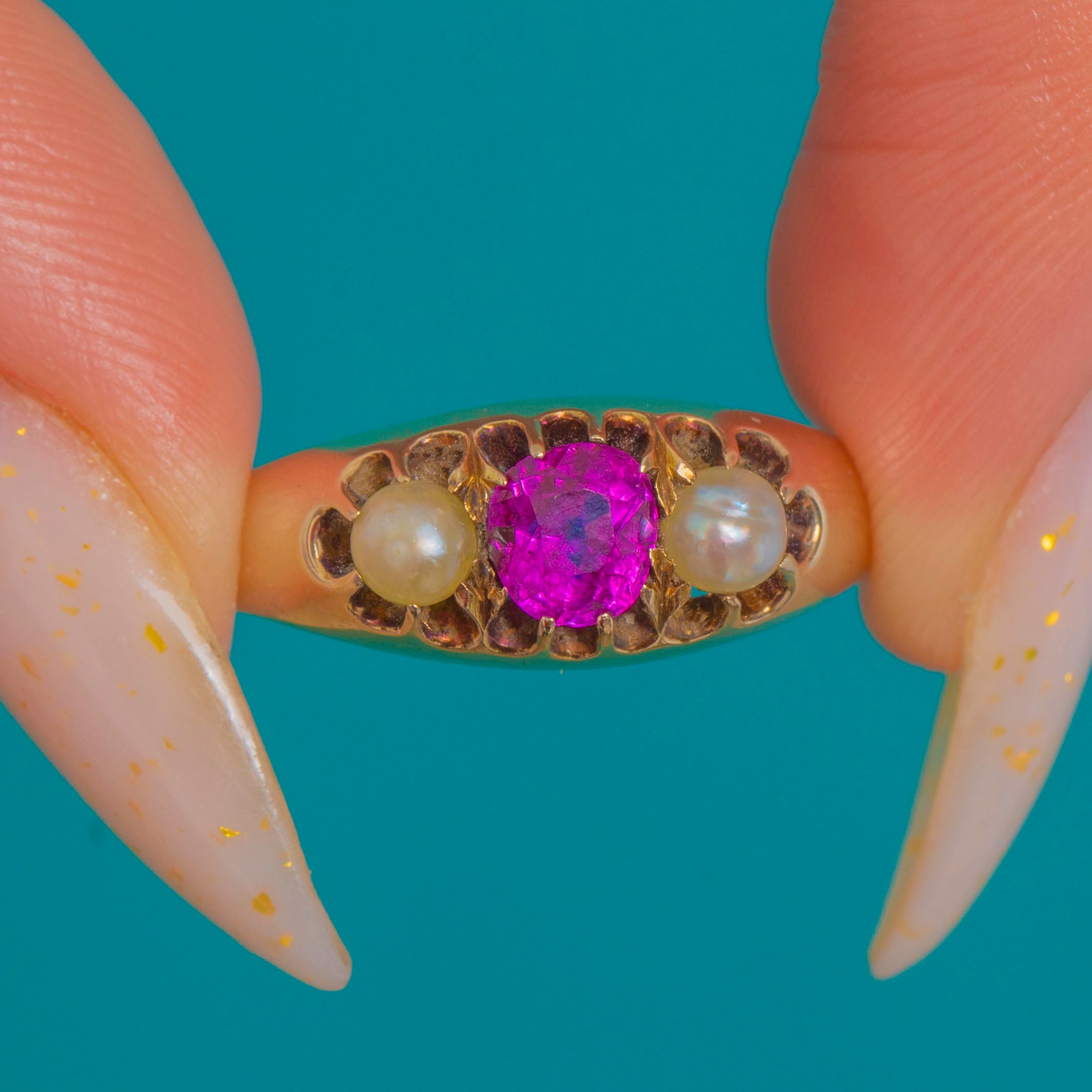 Low-profile and dainty, this romantic three-stone design offers effortless wear while its soft patina tells a century-old story. A timeless Victorian favourite, the Ruby and Pearl pairing brings elegance and a whisper of sentiment to every day.