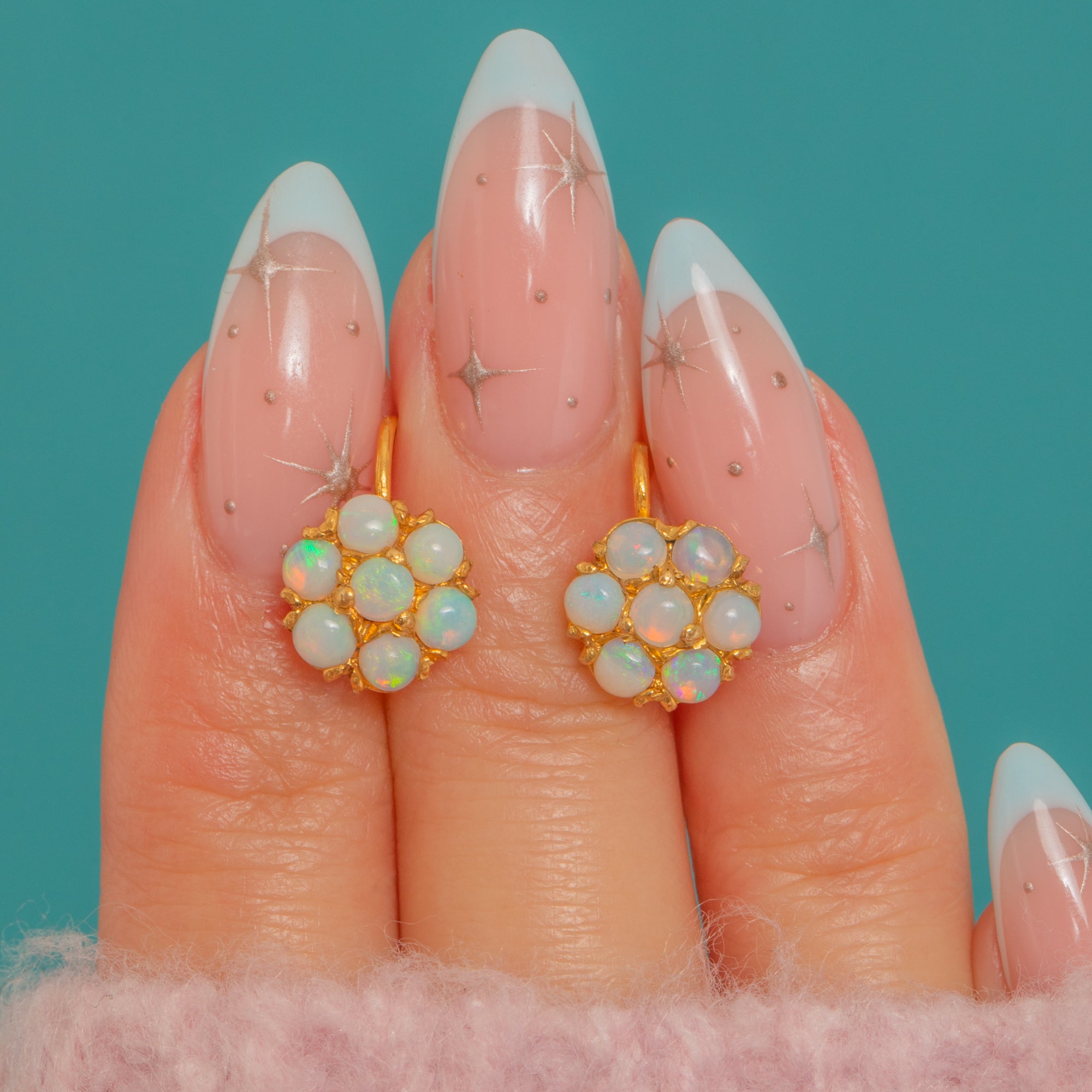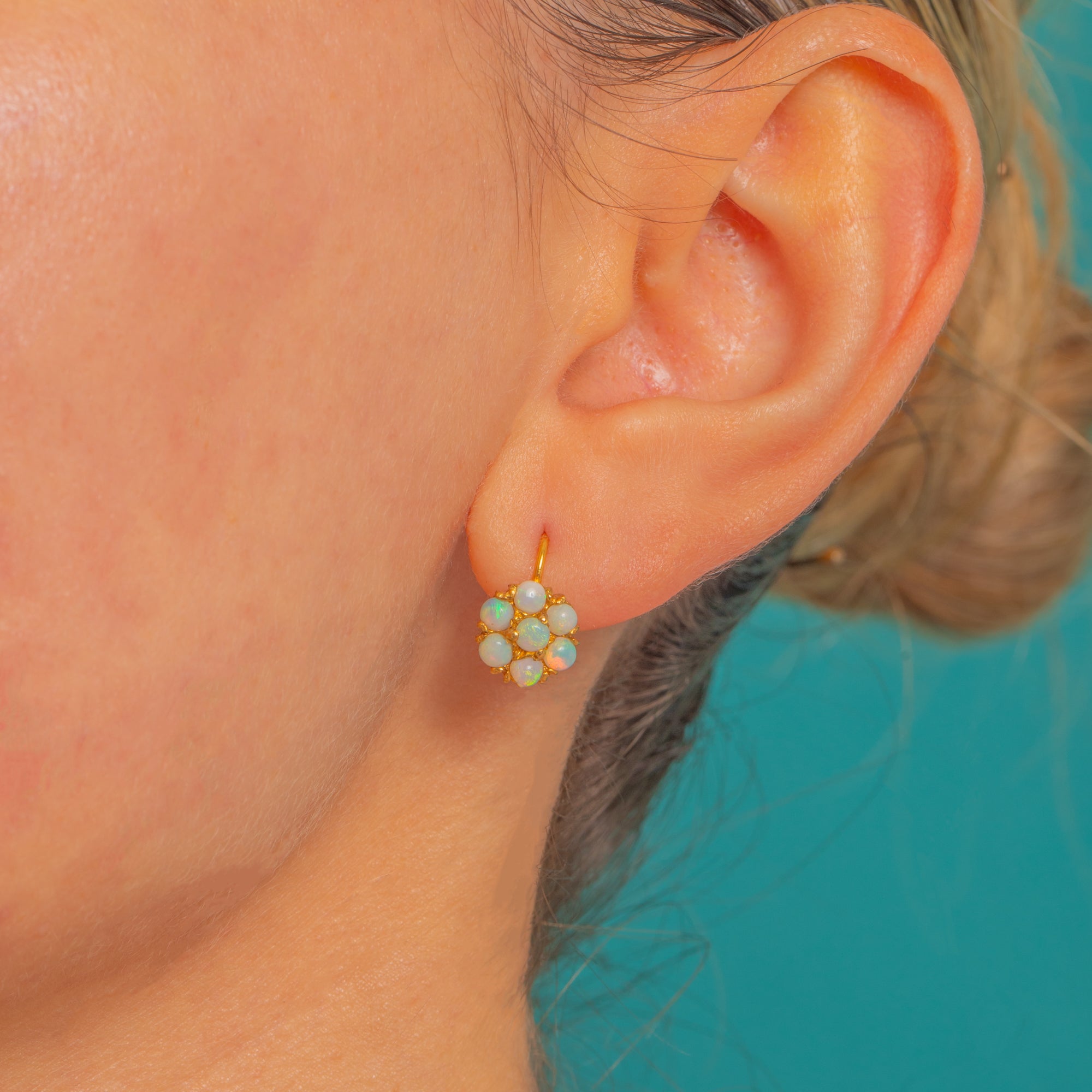 These charming Edwardian drop earrings capture the era’s romantic sensibility in glowing 9ct Gold. Each petite daisy cluster is formed of round Opal cabochons nestled in scalloped claw settings, their milky translucence igniting with pastel confetti-like flashes of green, blue and orange. The clusters suspend from simple shepherd-hook fittings for an effortlessly feminine silhouette.