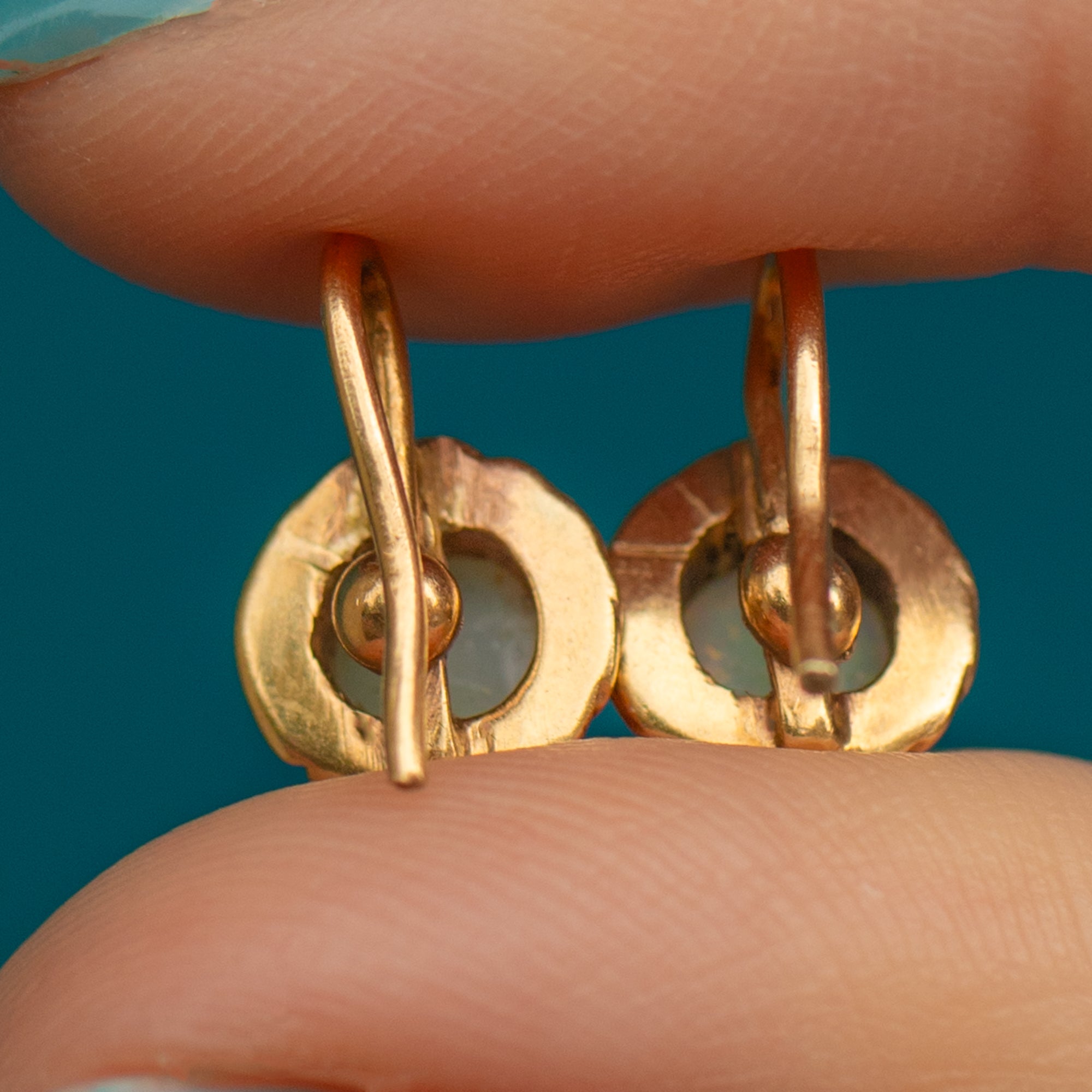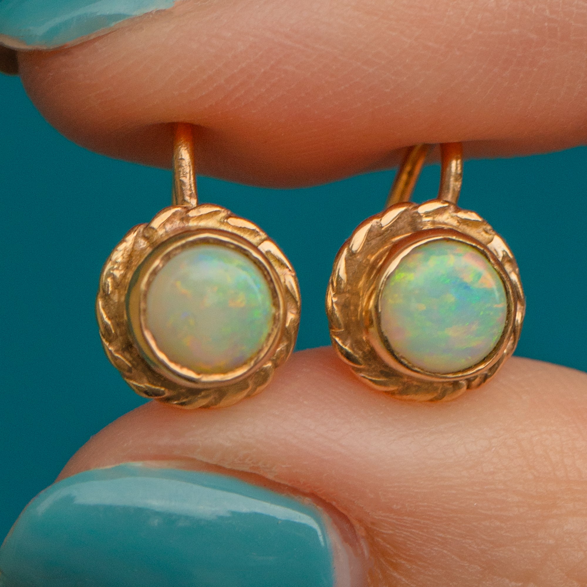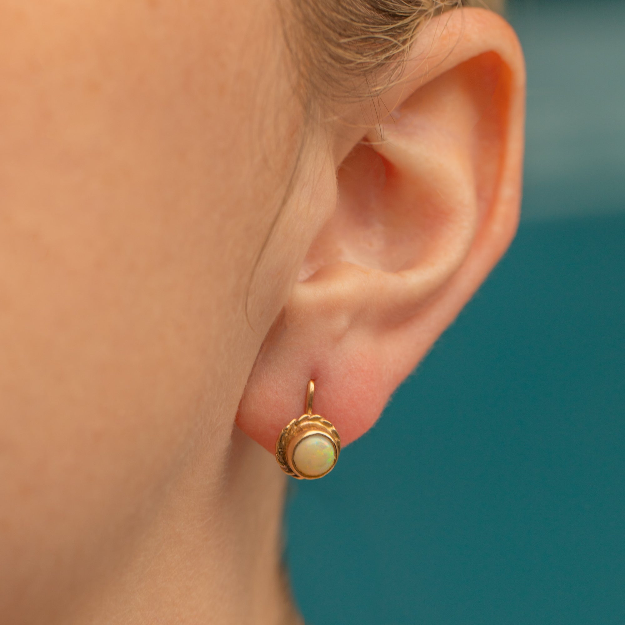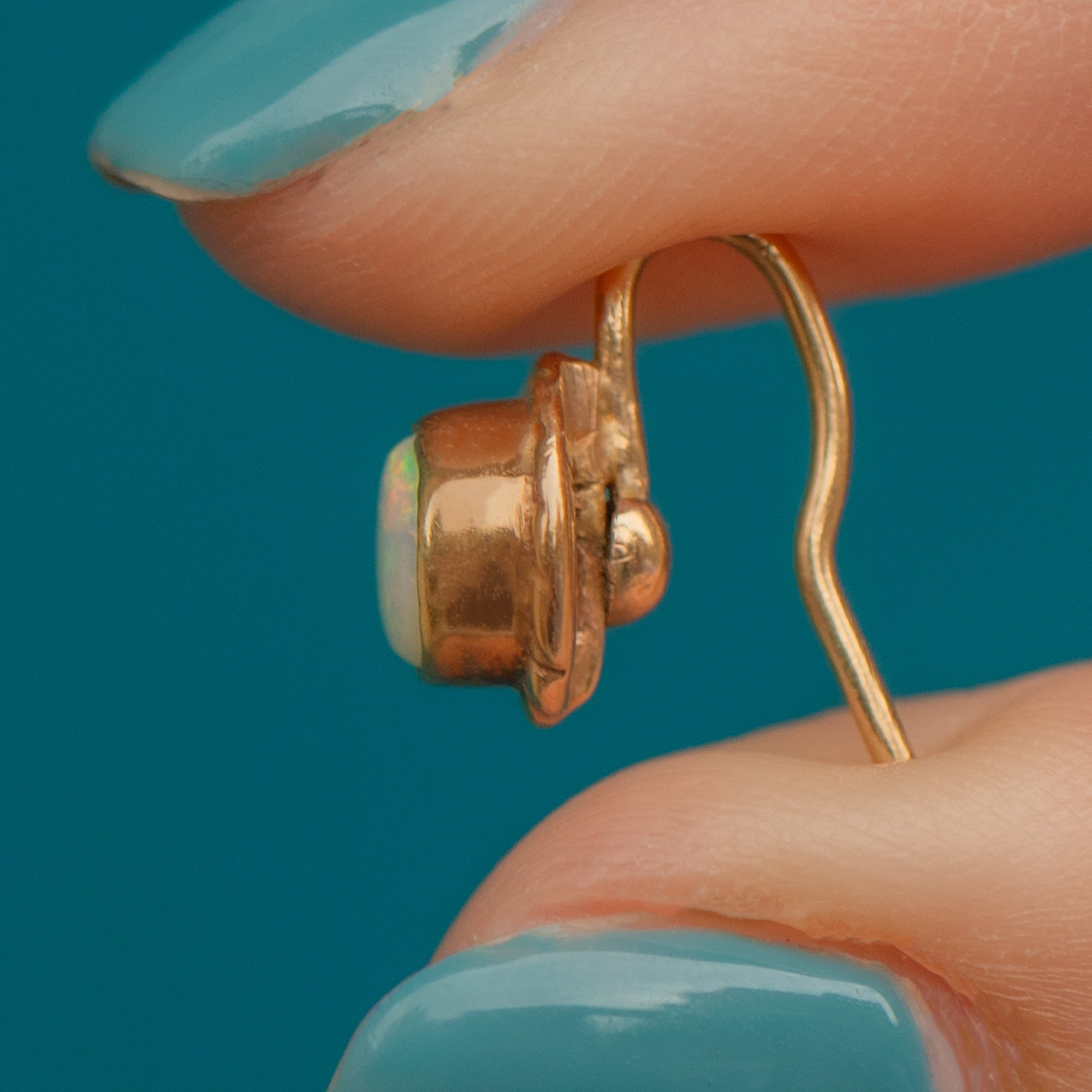 EXCELLENT. These antique 9ct Gold Opal earrings are in excellent condition. Both Opals are secure in their bezel settings, free from any chips or surface wear. The Gold has a rich, buttery tone with no damage to note. With secure fitting ear hooks, you can wear these Opal earrings in confidence and style!