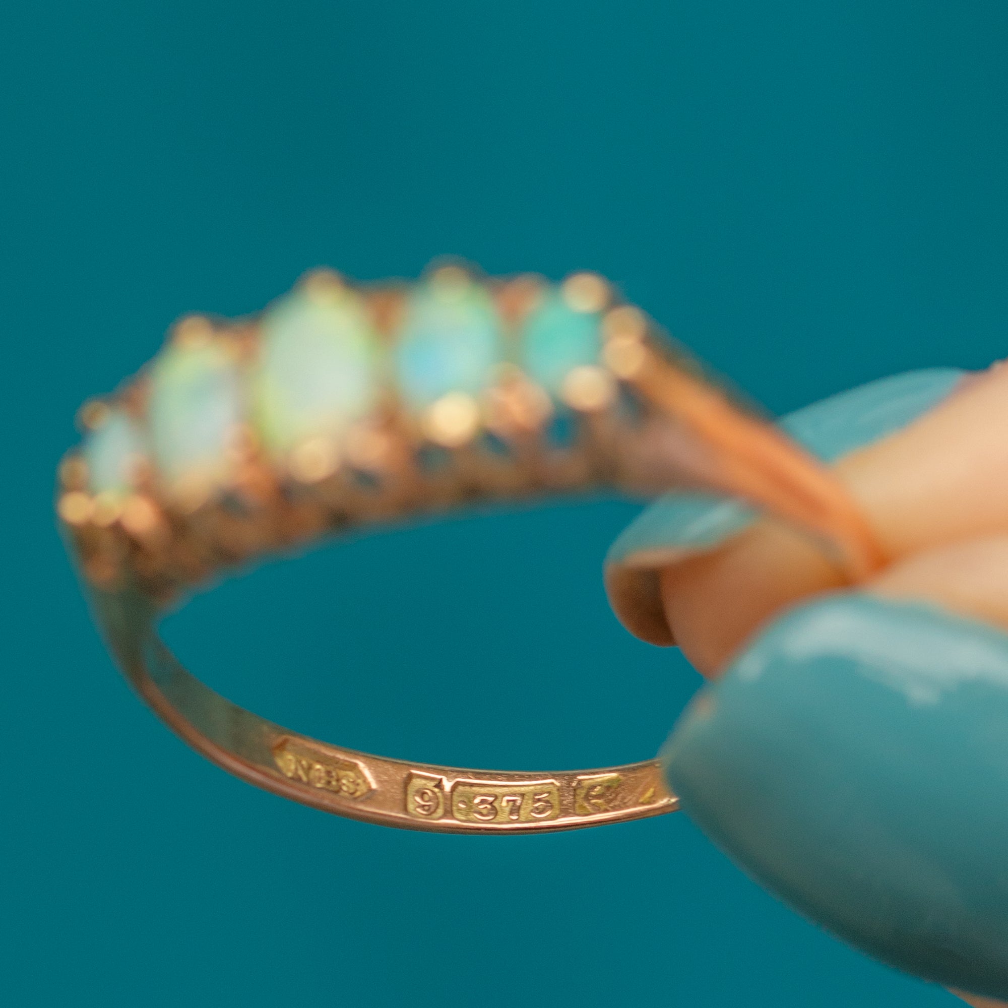 VERY GOOD - This Antique 9ct Gold Opal five stone ring is a beautiful historical jewel offered in very good condition for her age! All of the Opals are natural and lively, free from any chips or cracks, with beautiful minty greens and both pastel and neon pinks! The 9ct Gold setting holding the Opals are still in fantastic working order, and the colour and smoothness of the Gold is second to none! Unfortunately we can't say the exact date as a previous re-size has lost the date letter, however she is clearly stamped solid Gold and is confidently dated as antique circa 1900.