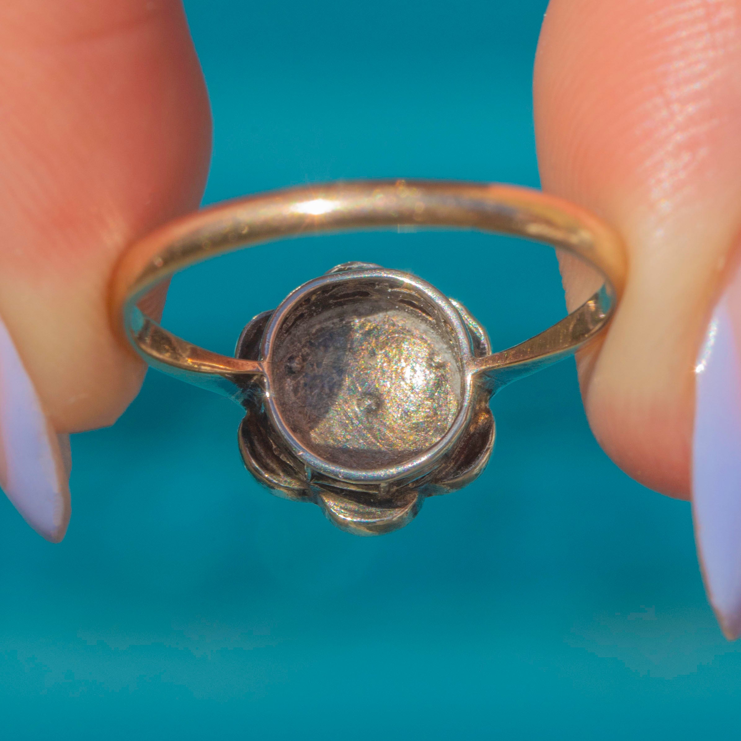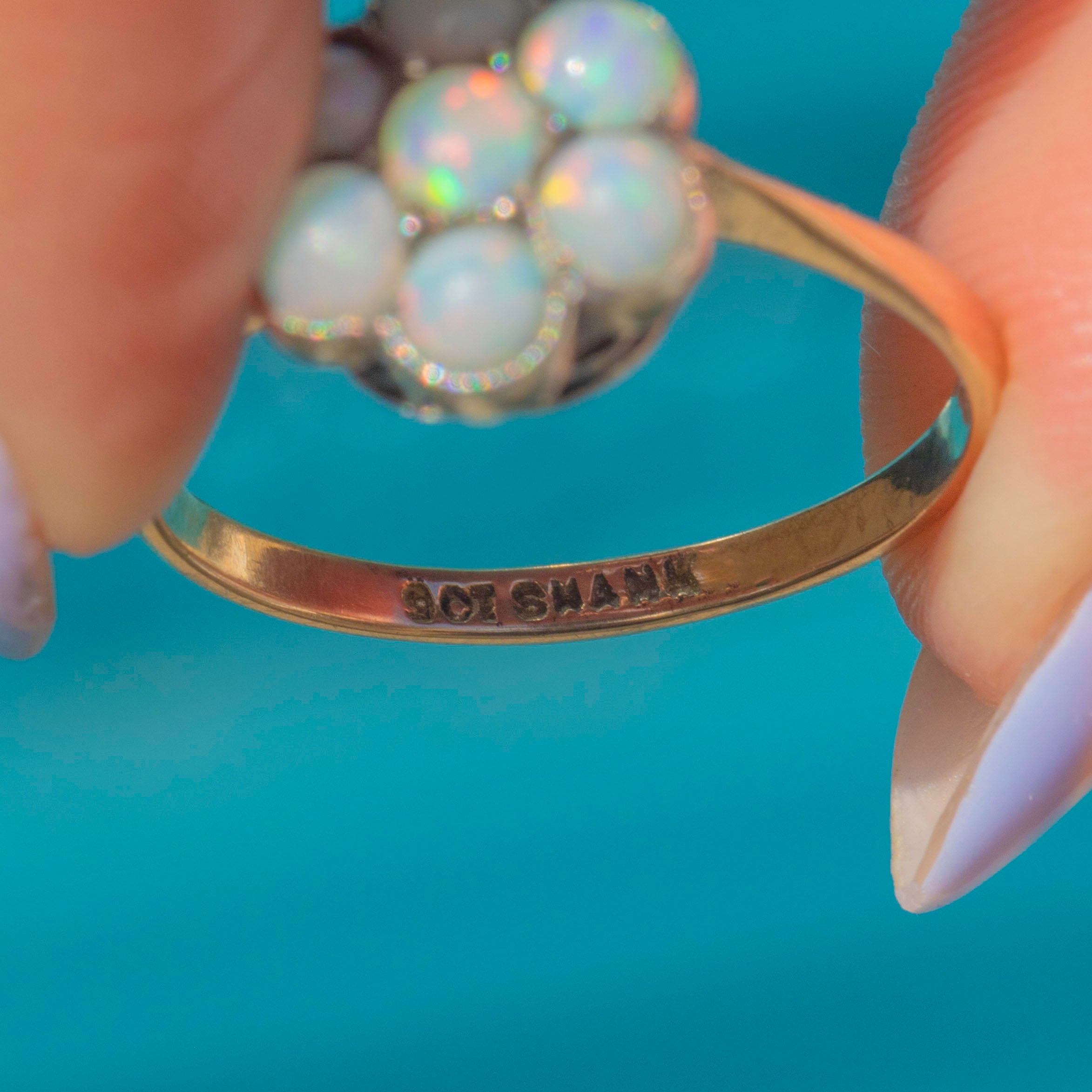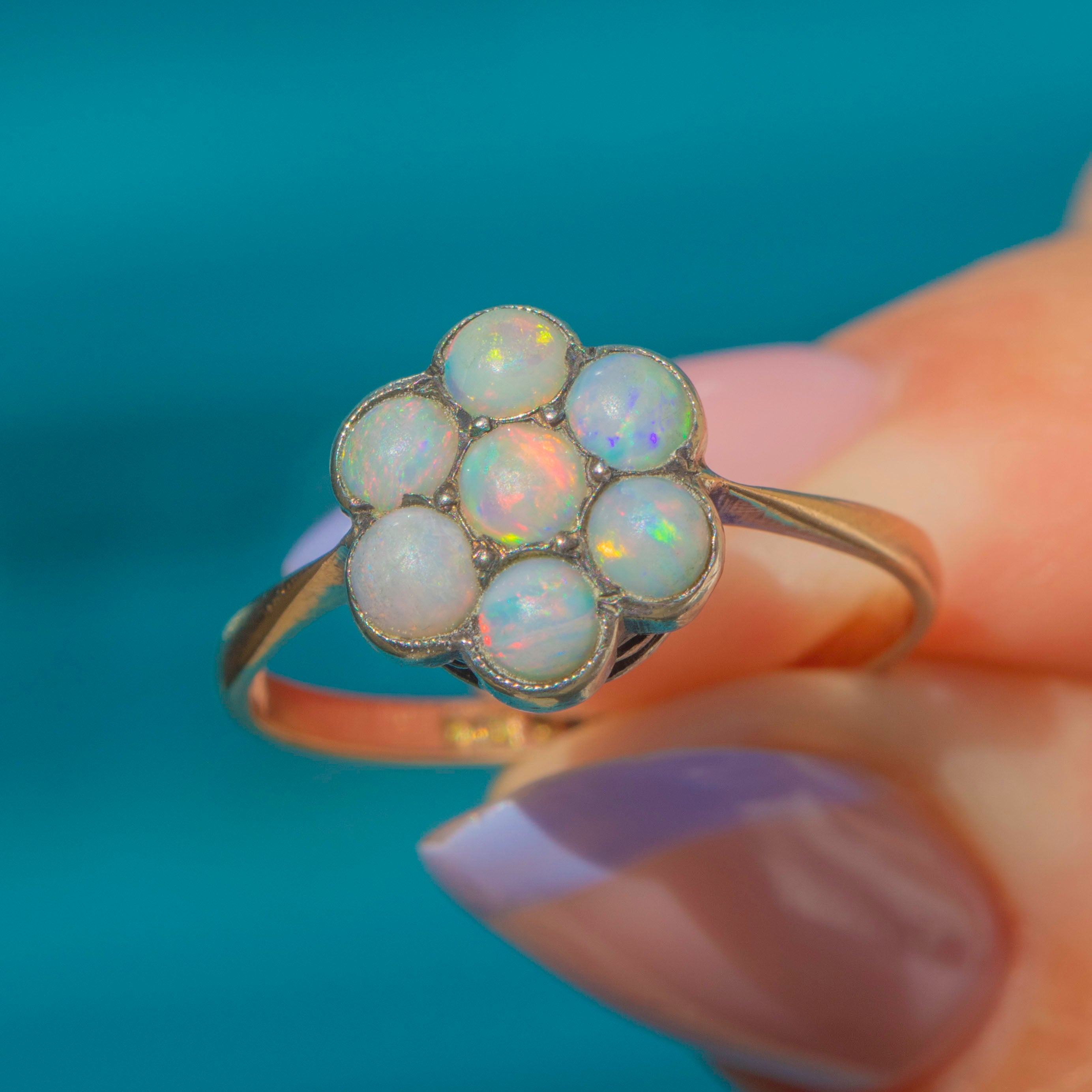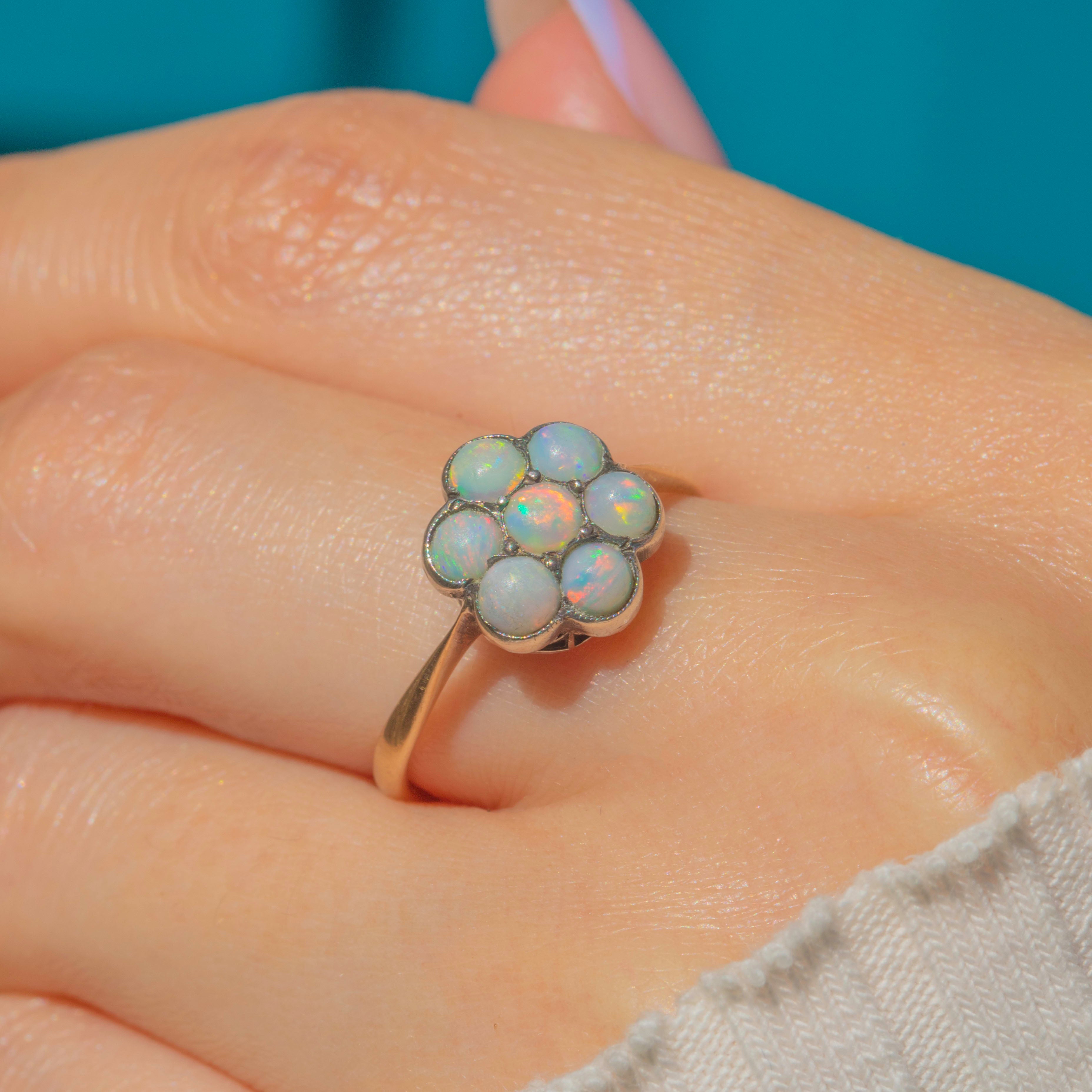 This antique 9ct Gold Opal flower cluster ring is bursting with feminine charm! The floral cluster displays seven Opal cabochons that come to life under the light, boasting vibrant pops of neon orange and blue, with hints of yellow and pink shimmering across their milky cores.