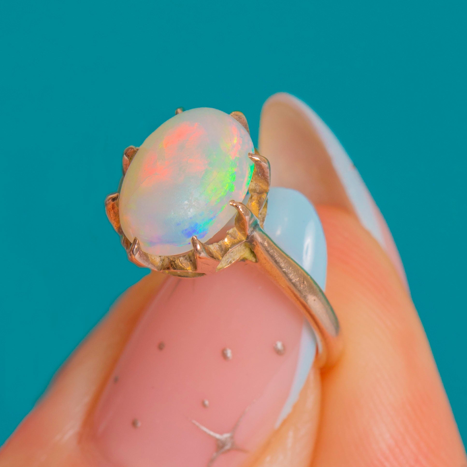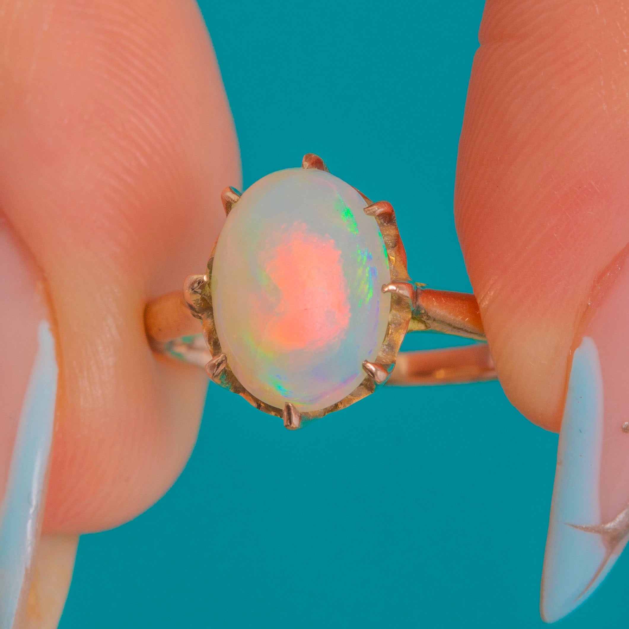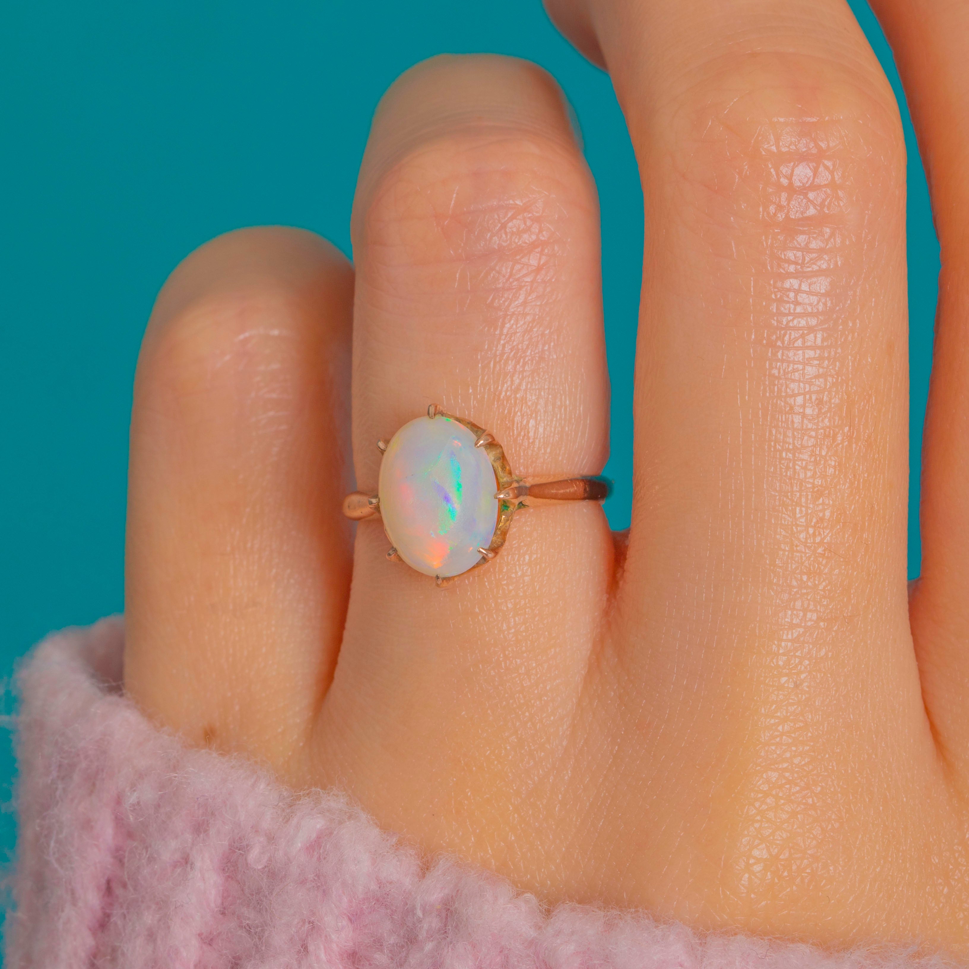 Hand-set multiple claws embrace the Opal securely, while the slim shank keeps the silhouette refined and wearable. A beautiful example of classic Victorian taste, with approximately 1.70cts of mesmerising colour at its heart.