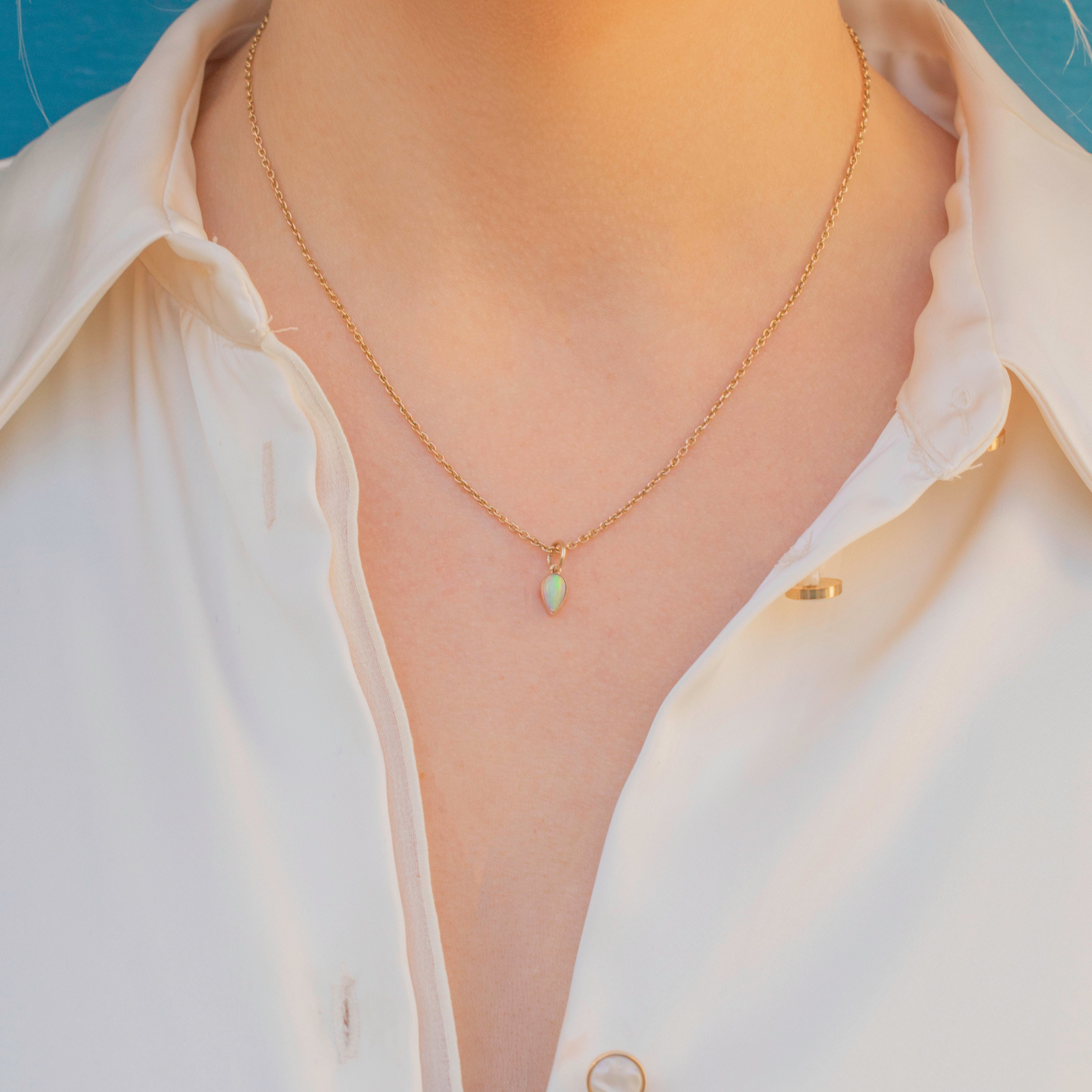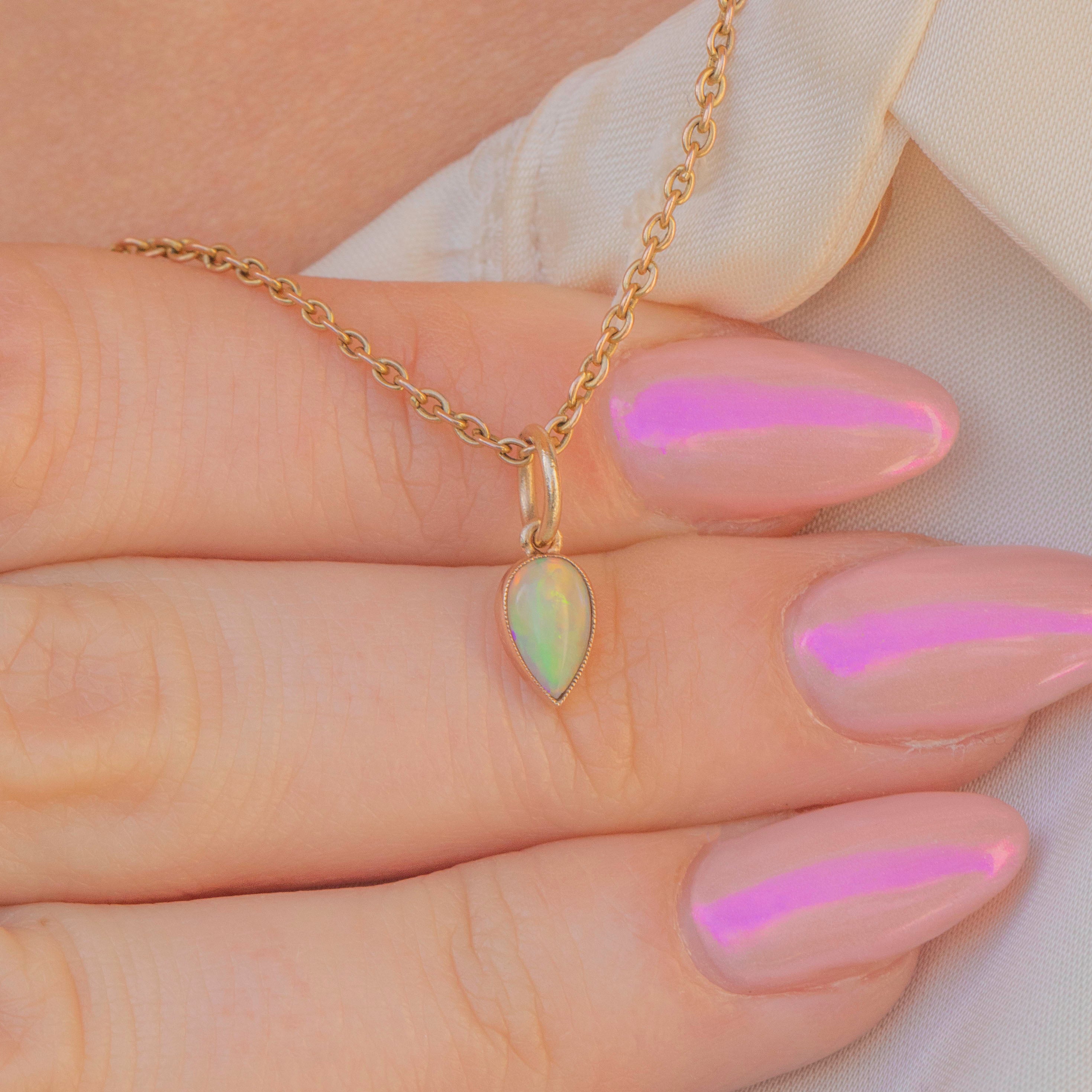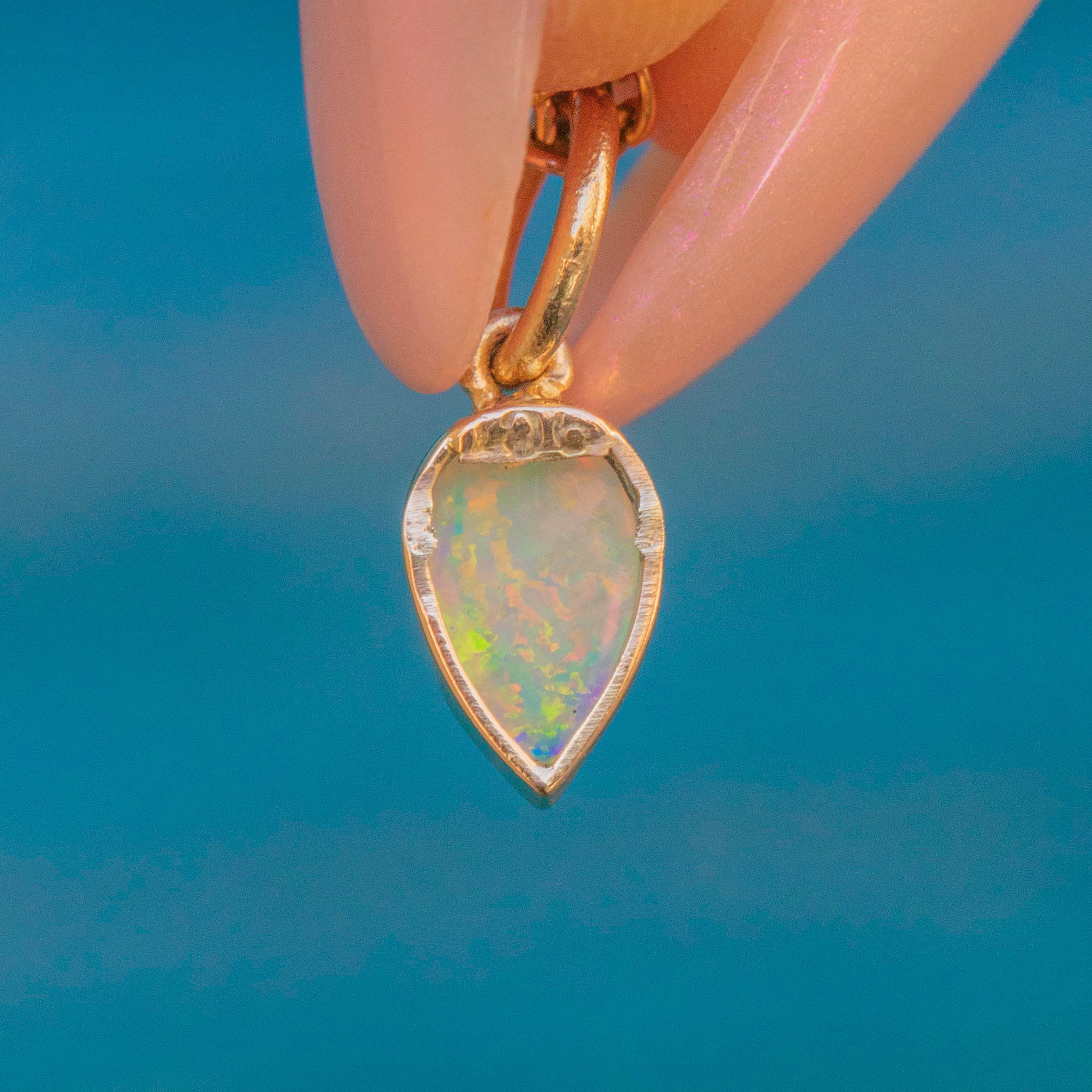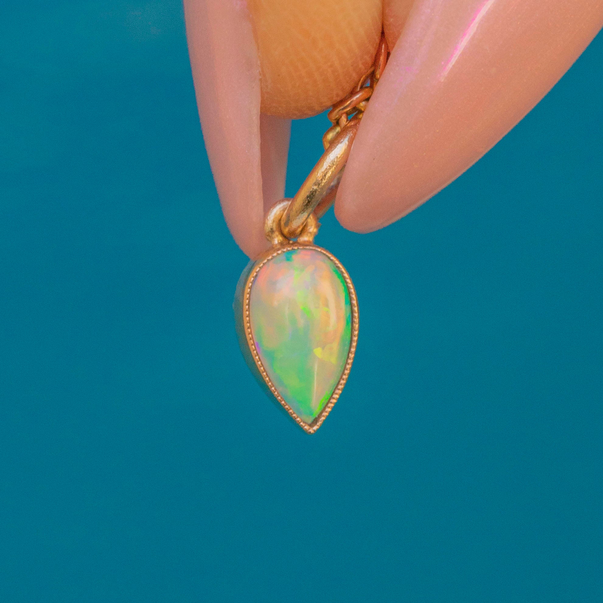 EXCELLENT. This antique 9ct Gold Opal teardrop charm is in excellent condition. The Opal is smoothly domed with no surface wear to note, and is securely held within its bezel setting. Complete with a generously sized jump ring, you can affix this delightful Victorian charm to a chain of your choice with ease!