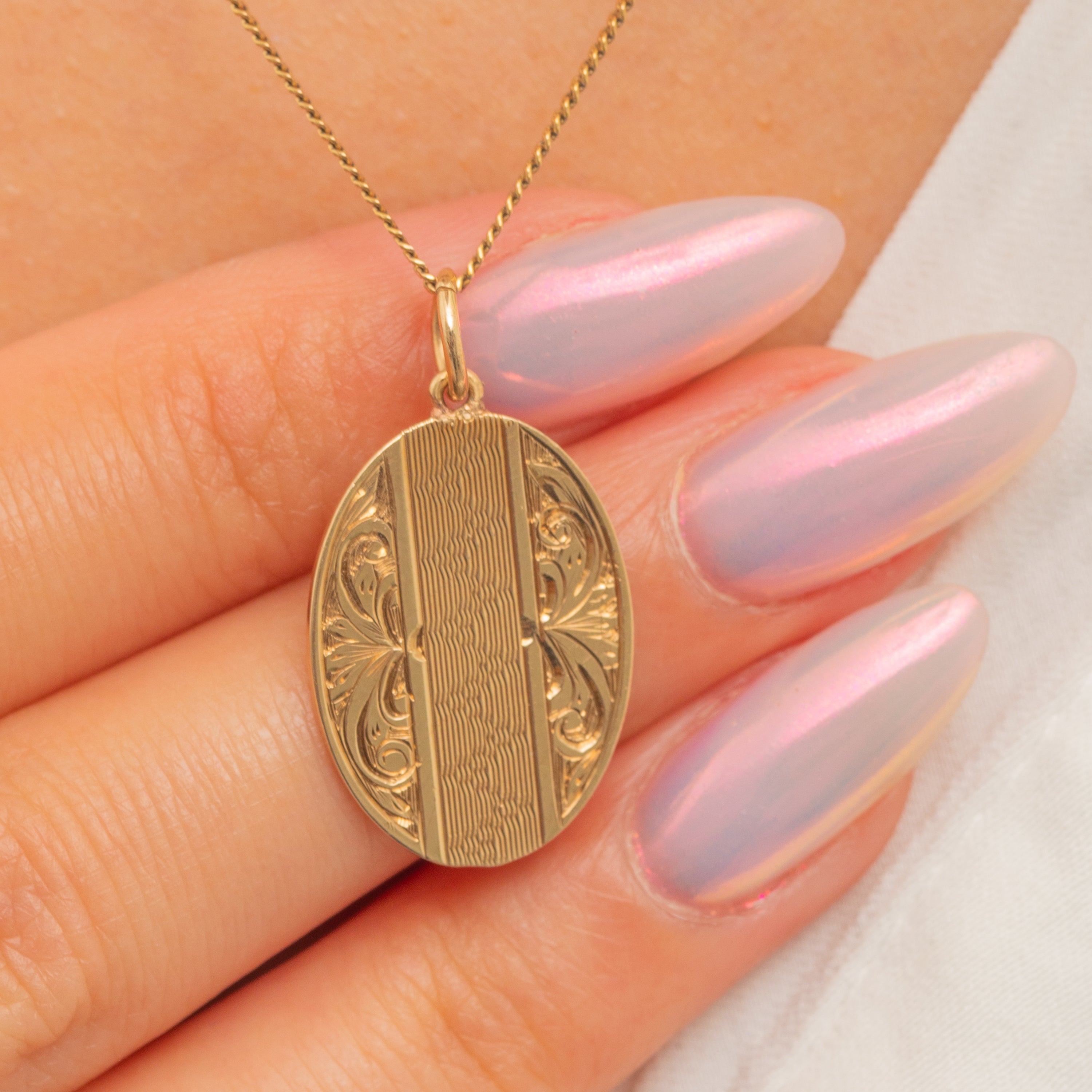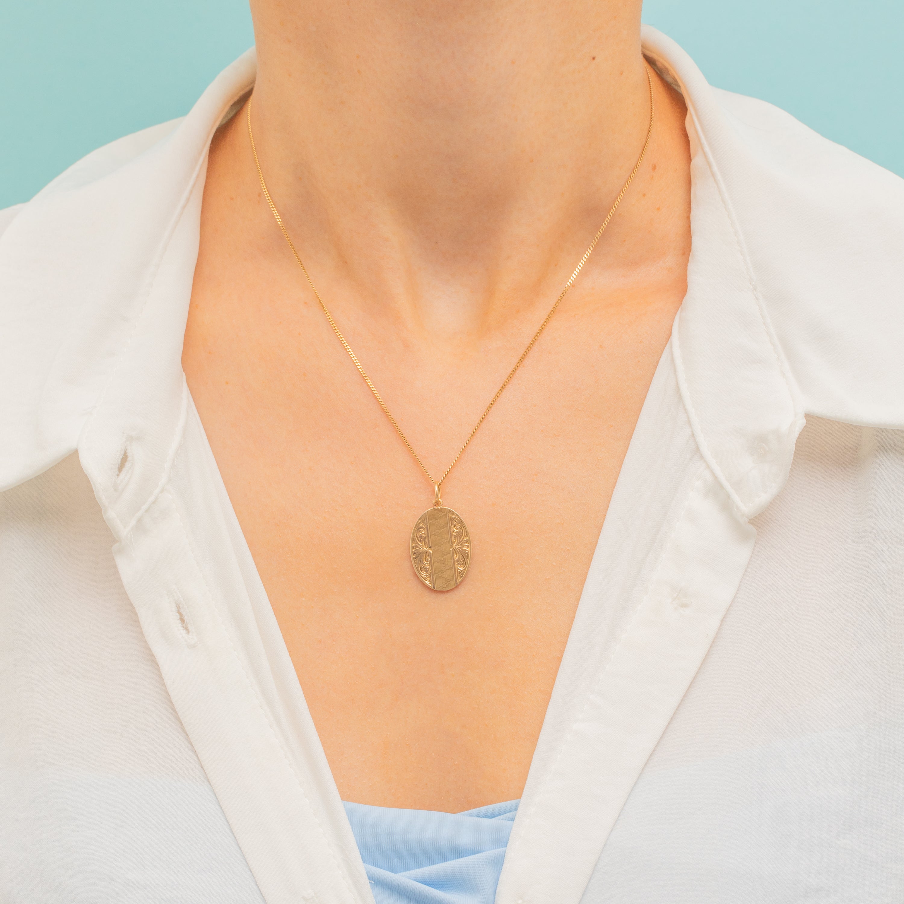 The lightweight and slim size of this antique oval Gold pendant makes her the ideal choice if you're looking for an everyday piece. With the ability to effortlessly integrate into your curated necklace stack or Gold bracelet, her versatile nature makes her a must-have piece!