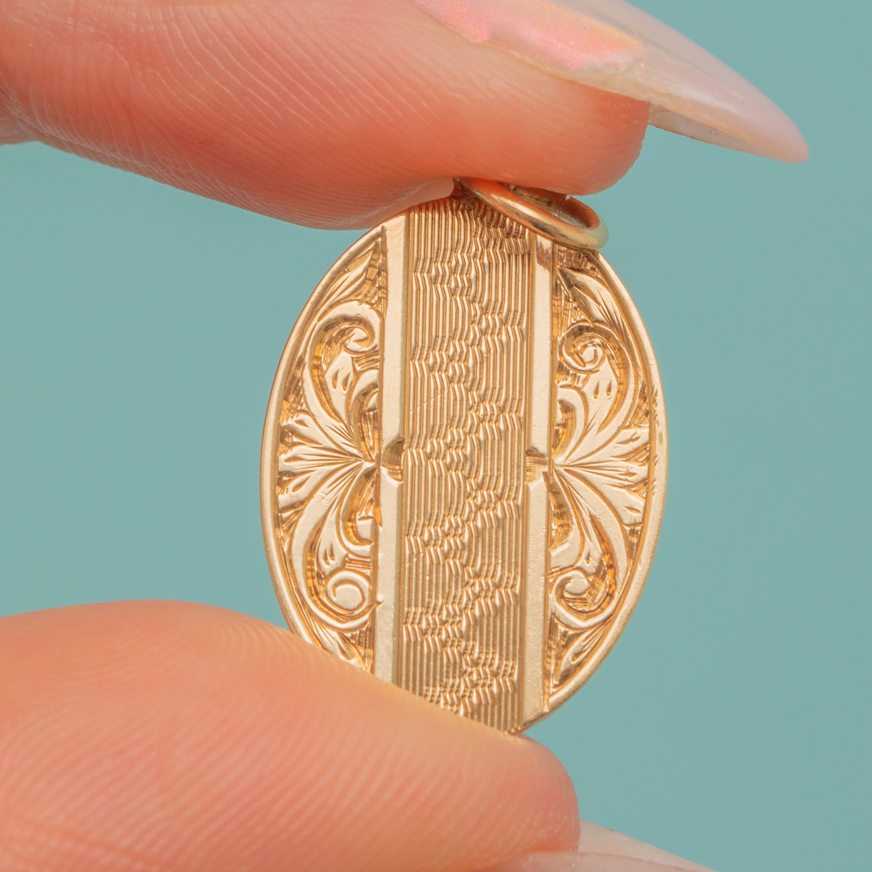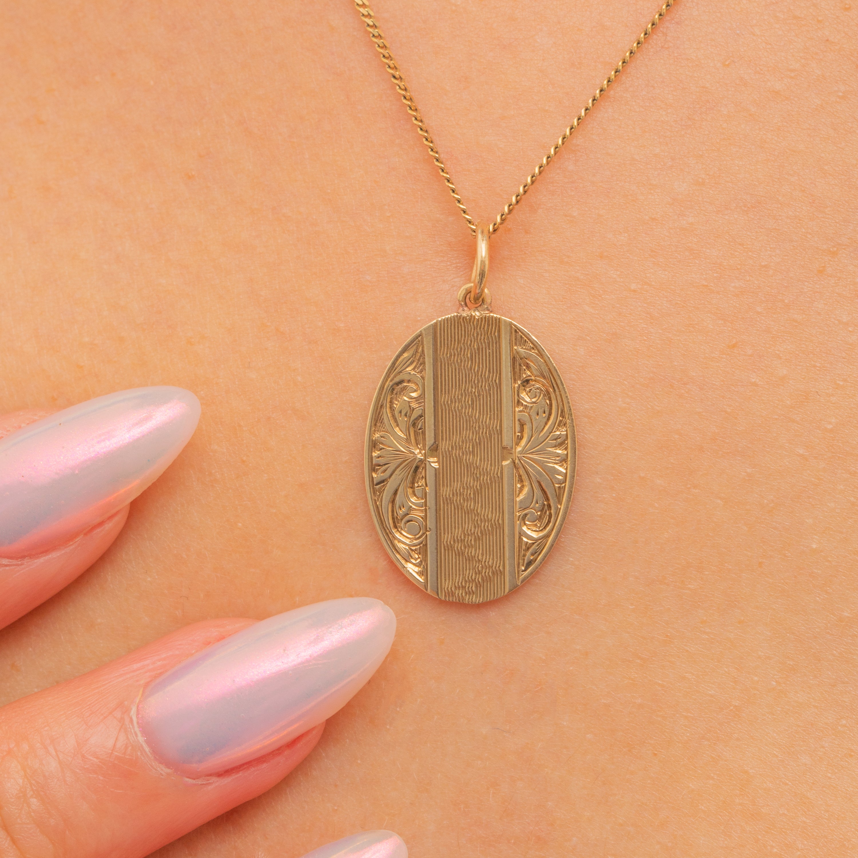 This Art Deco 9ct Gold oval engraved pendant is a slice of sunshine! Crafted from bright and buttery 9ct Gold, her front is adorned with ornate baroque-style engravings and a zig-zag design running through her centre.