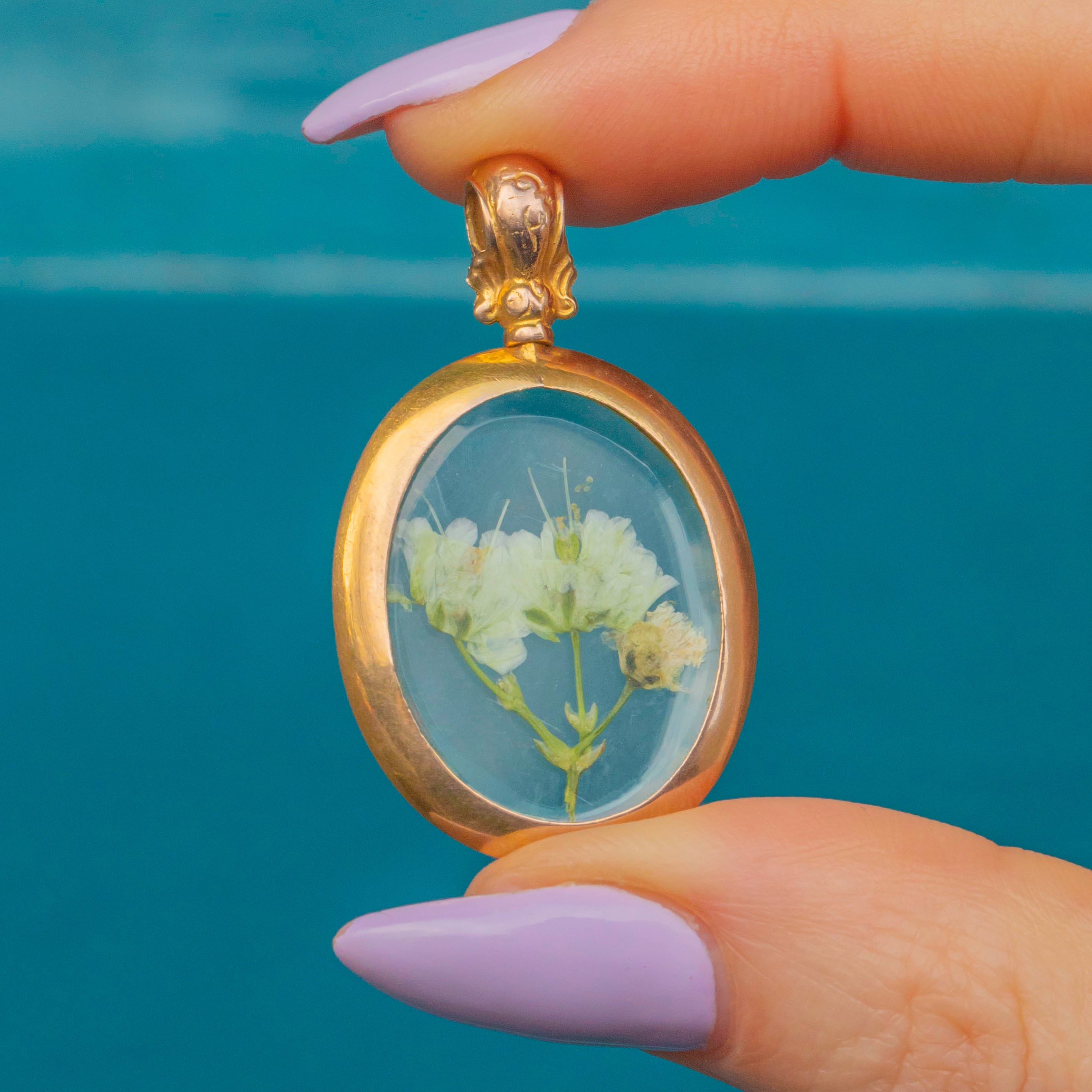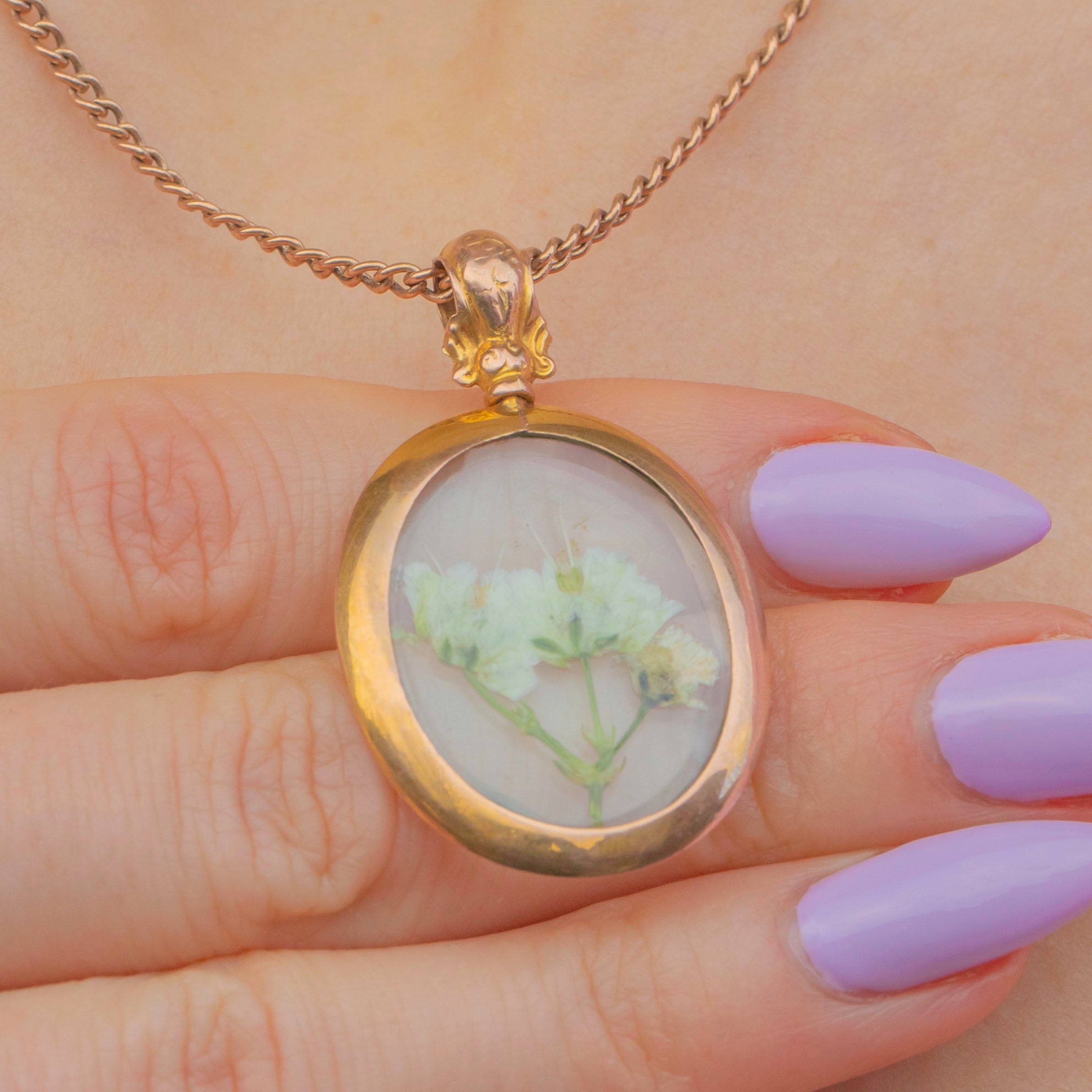 VERY GOOD-EXCELLENT. This antique 9ct Gold oval pressed flower locket is in superb condition. The 9ct Gold is smooth and glossy, with only very mild wear to her surface.  Her glass slightly wobbles inside the locket, however it is secure inside her 9ct Gold case so you don't have to worry, just wear her with care! Delicate and feminine, this floral locket will look divine suspended from a fine Gold chain!