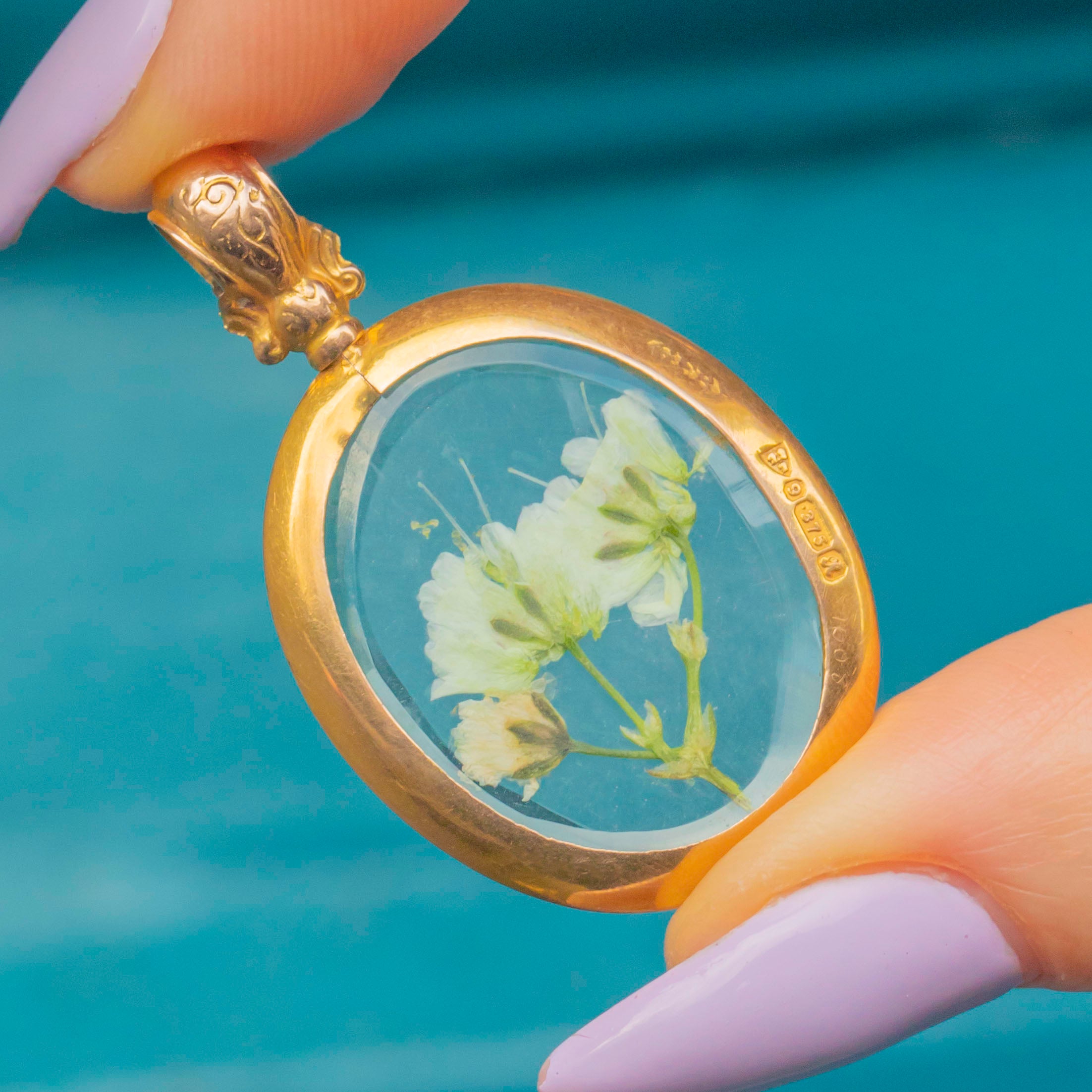 This antique 9ct Gold oval pressed flower locket is divine! With a full set of hallmarks, including the rare Chester Assay, dating to 1917, this 9ct Gold oval locket has kept every inch of her charm.