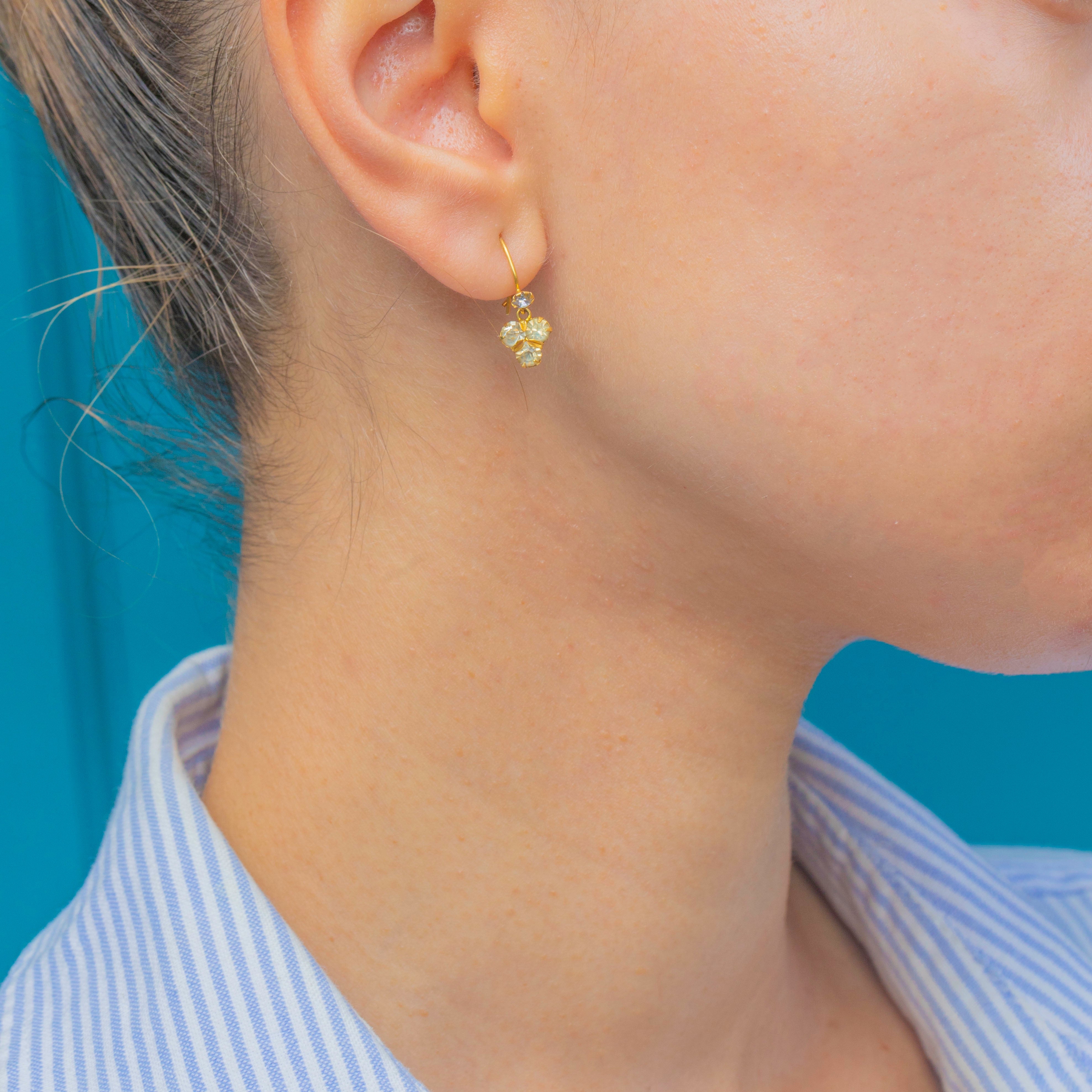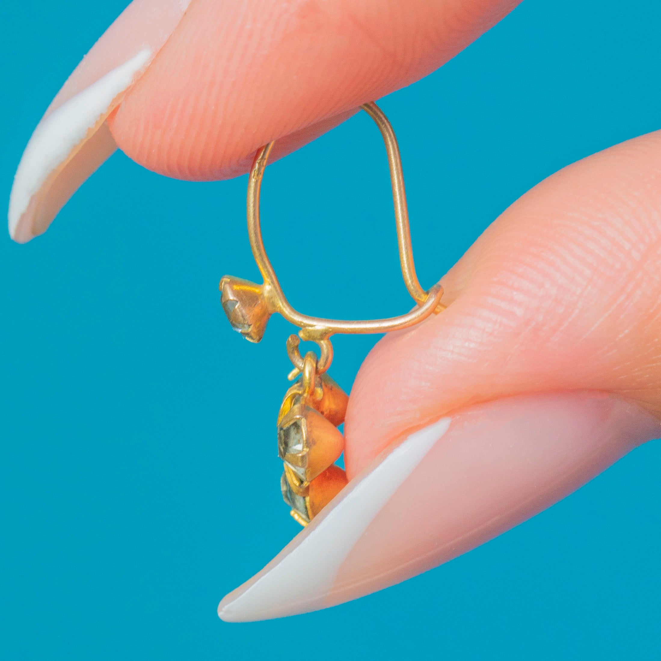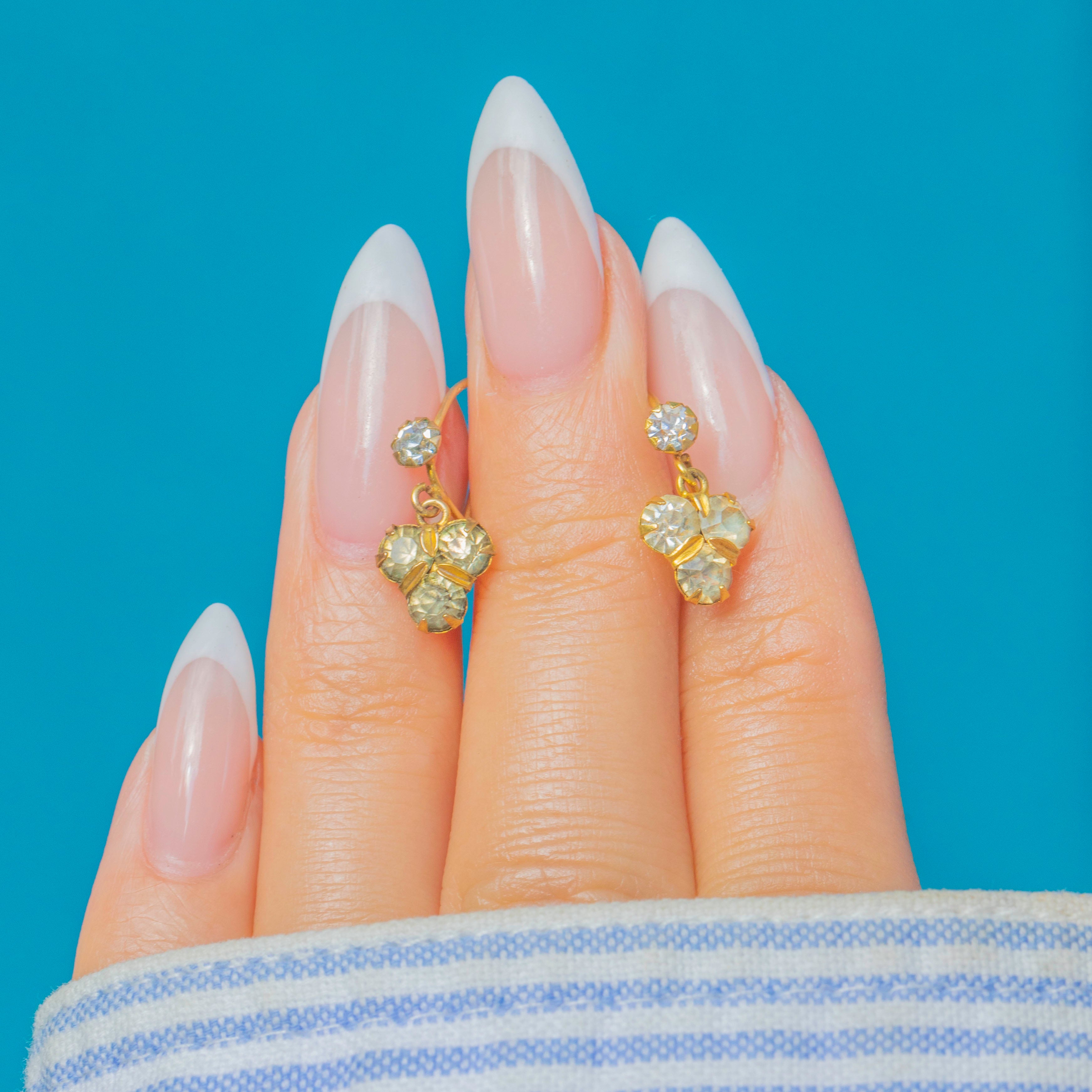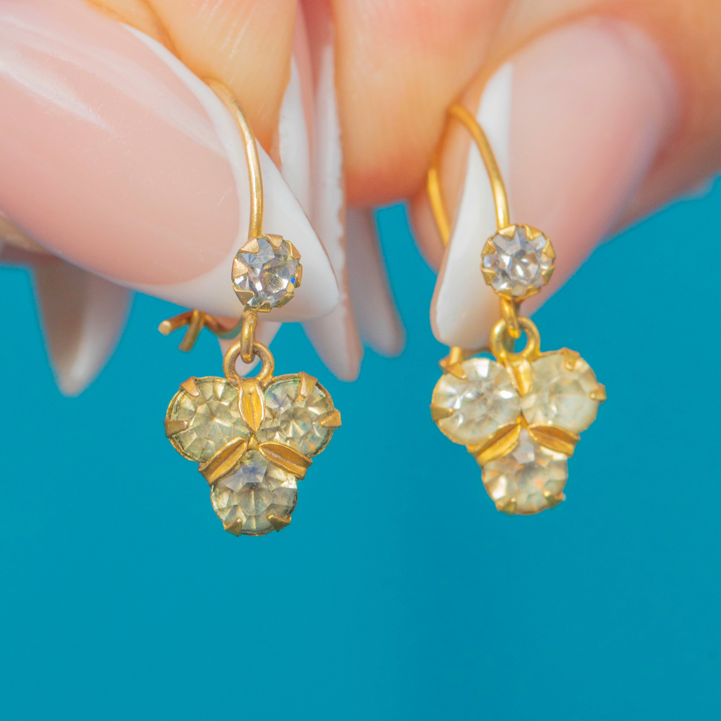 Each earring features a single round Paste above a dainty trefoil drop, the stones cupped in golden claws that give lovely texture and light play. Petite, pretty and so wearable—perfect for a touch of 19th-century luck every day.