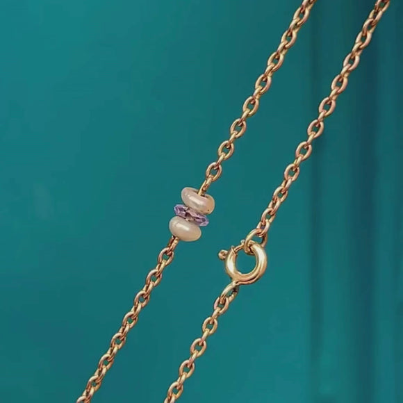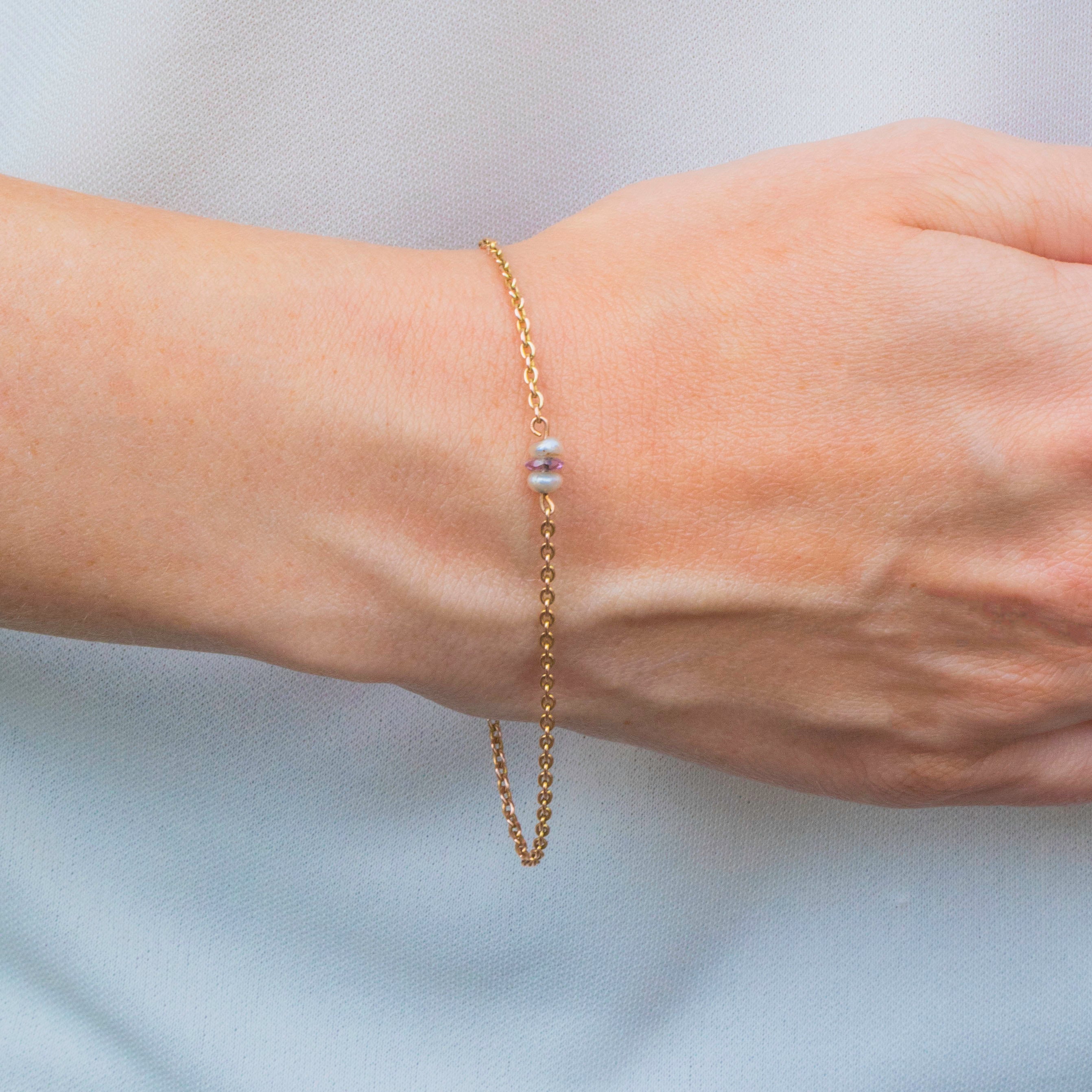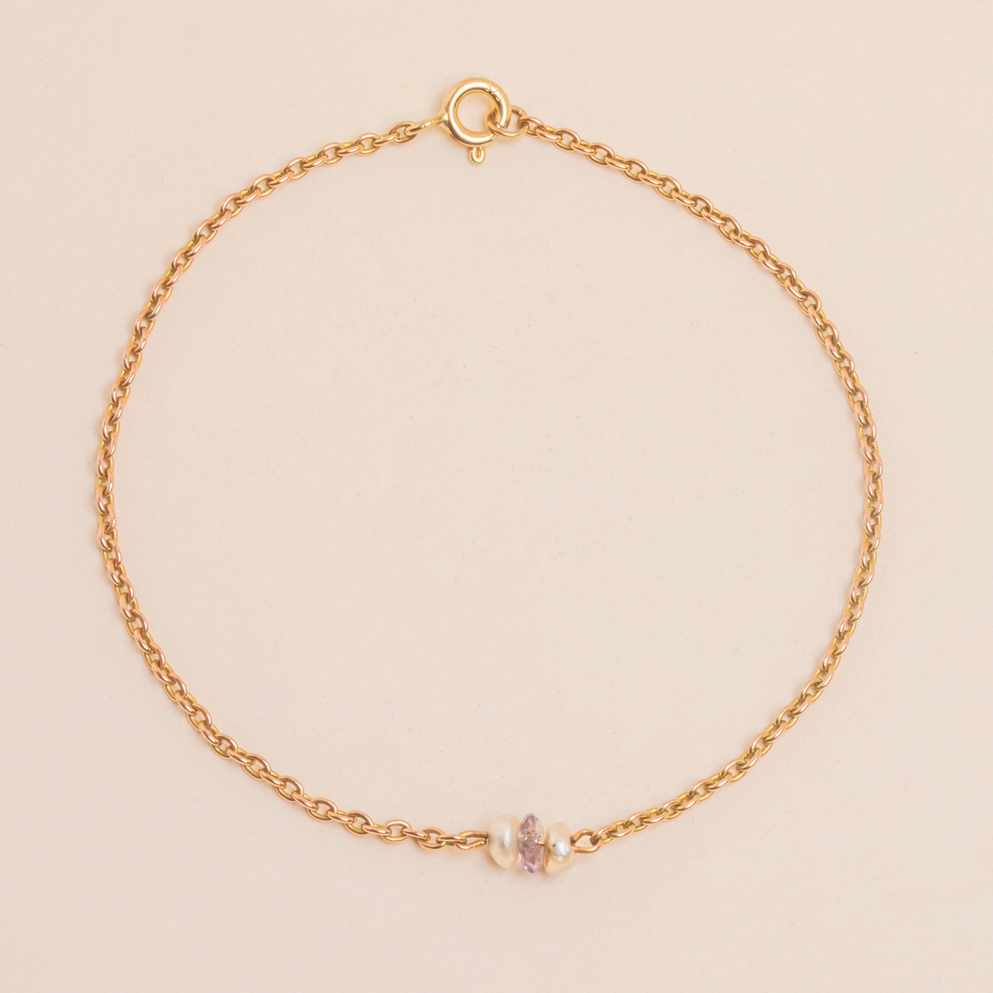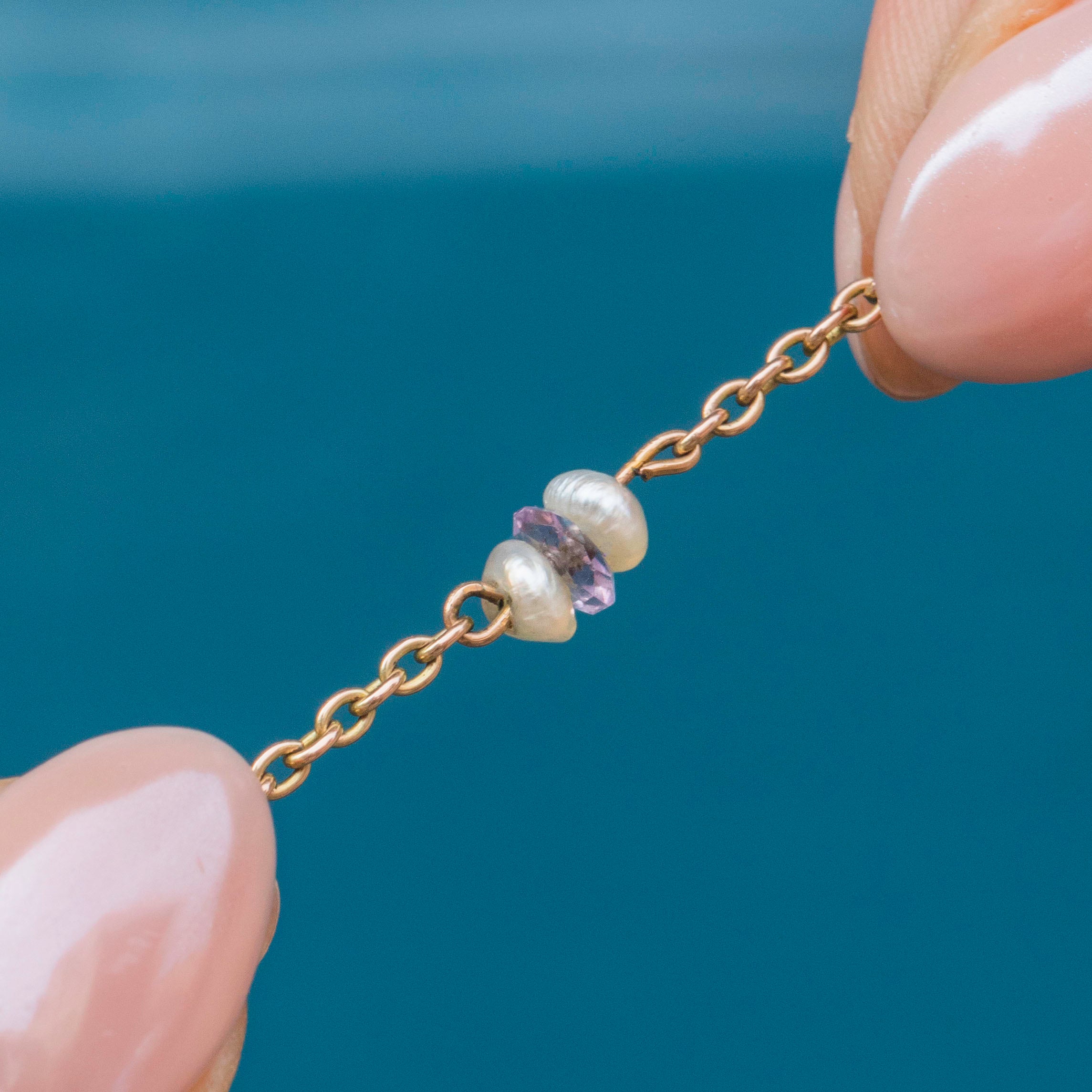 Bring simplicity and splendour to your wrist stack with this antique 9ct Gold Pearl and Amethyst bracelet! Her 7.5 inch length is formed of slender belcher links homing a faceted Amethyst nestled between two shimmering Pearls.