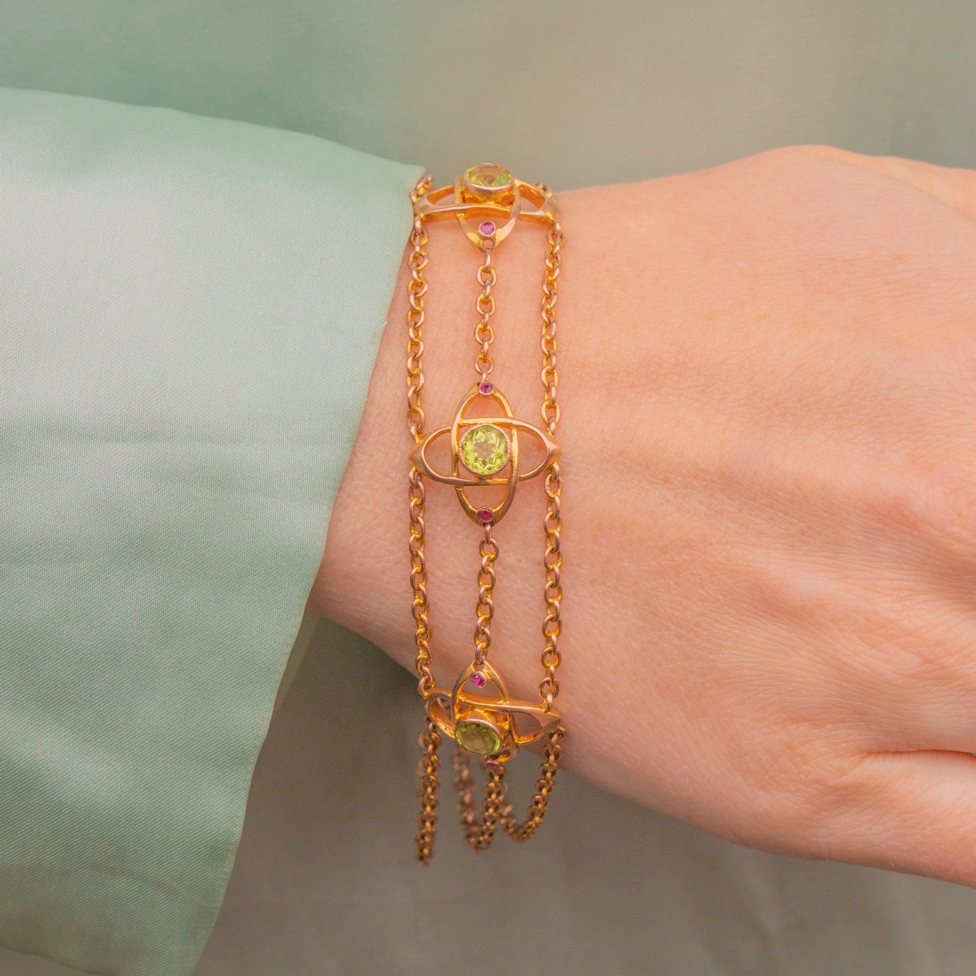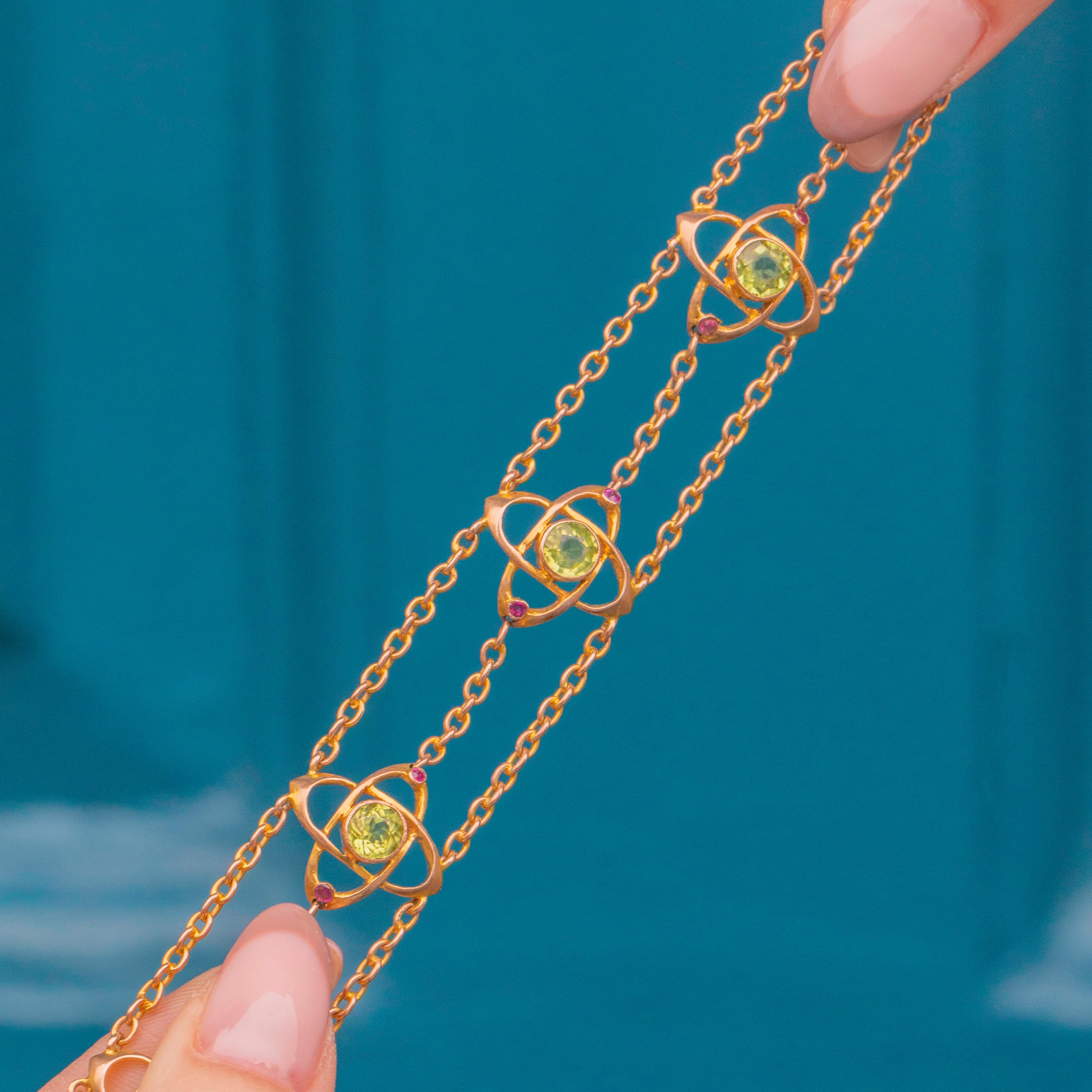EXCELLENT. This antique 9ct Gold Peridot Ruby flower bracelet is in excellent condition. Her Peridots are bright and zingy, with no visible signs of wear. Her Ruby gemstones are also all present and securely set into their Gold settings. The links of the Gold chains are securely connected and have kept their form well. Her Heart padlock secures shut with a satisfying "click", providing secure and confident wear. All in all, she's a dream!