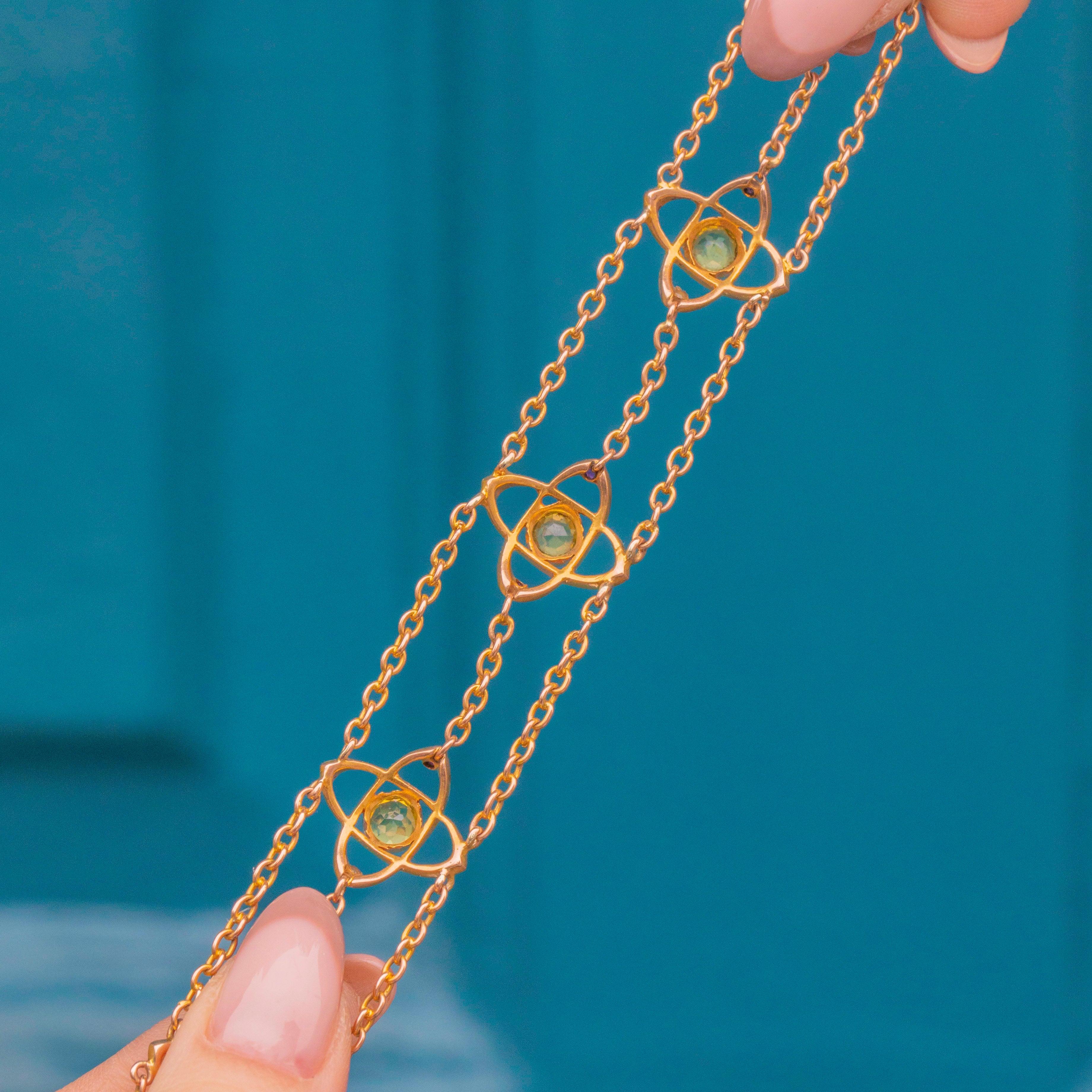 We adore the different layers and textures, adding superb dimensions to this lovely piece of history. The delicate Peridot flowers with Ruby accents are linked together with multiple strands of Gold chain, she's utterly enchanting!