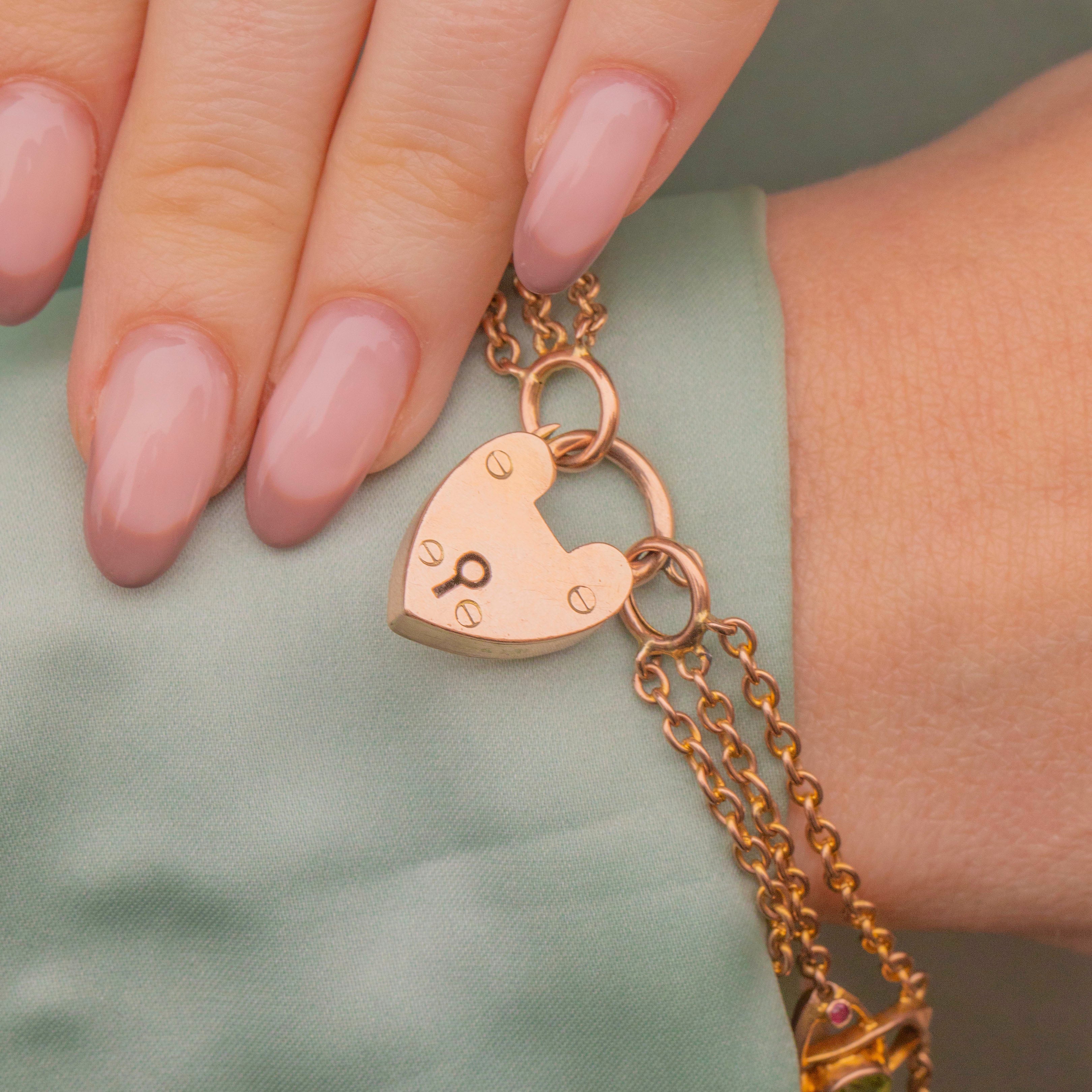 This antique 9ct Gold Peridot Ruby flower bracelet, complete with a sweet heart padlock, has such an elegant and charming demeanour!