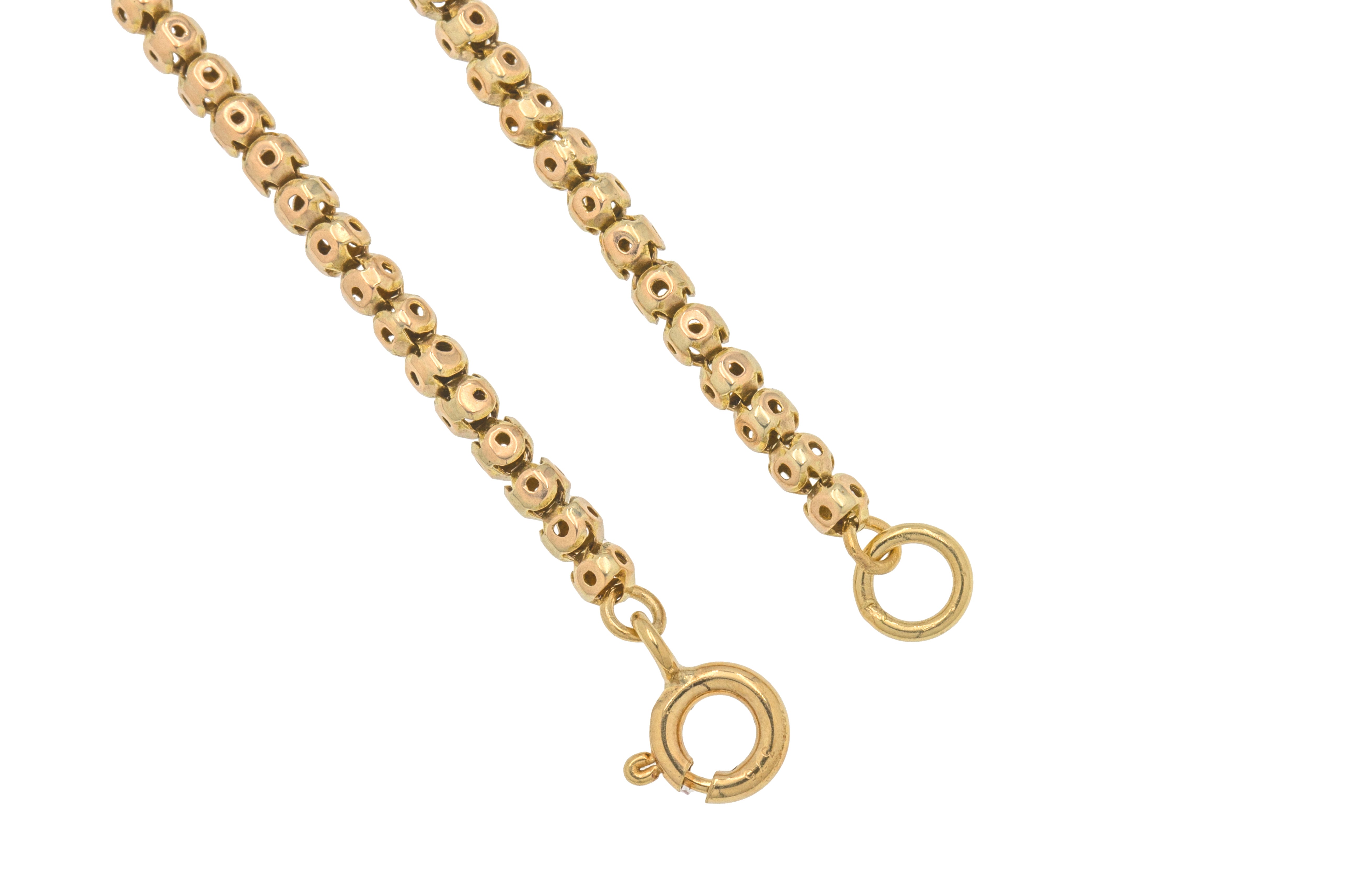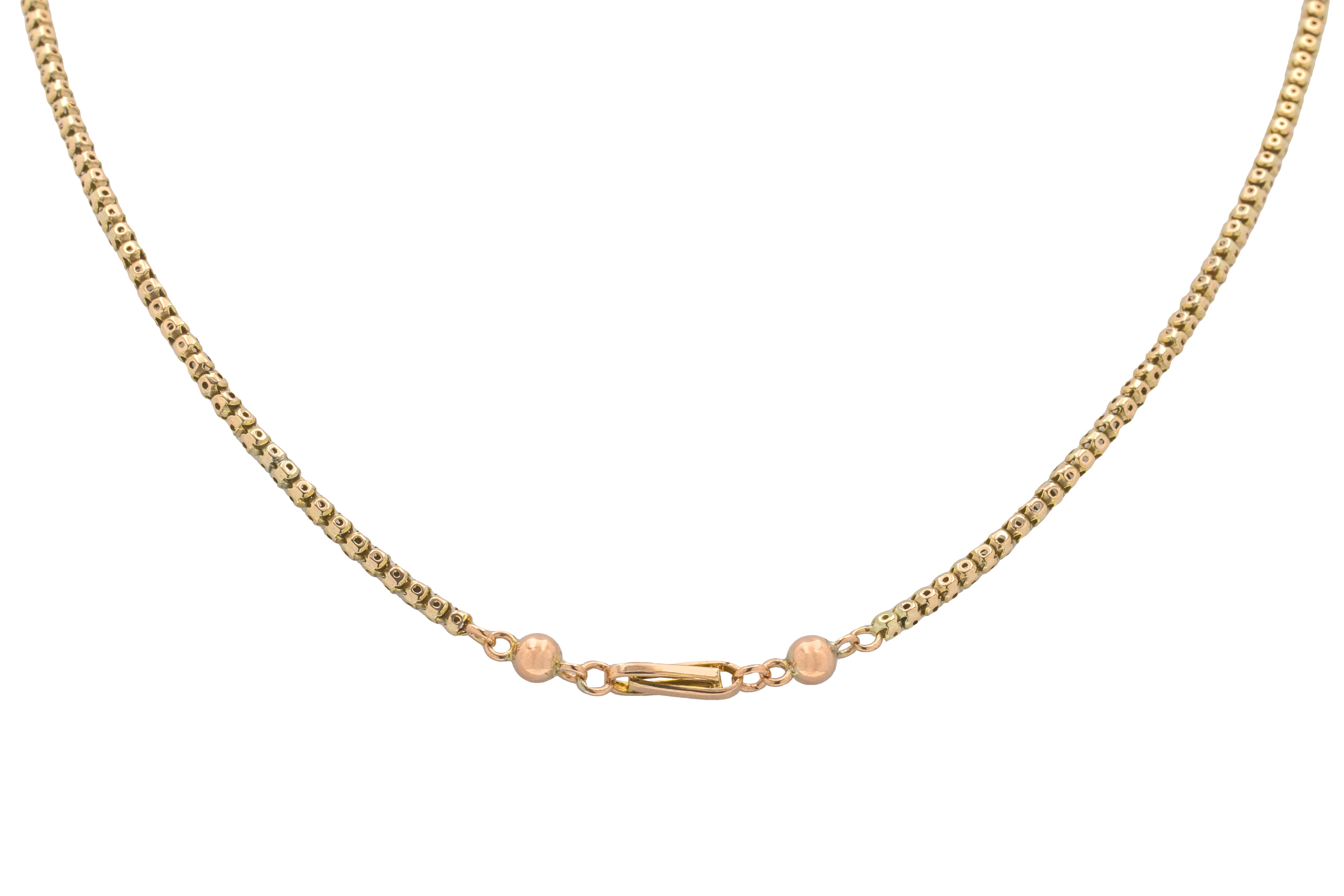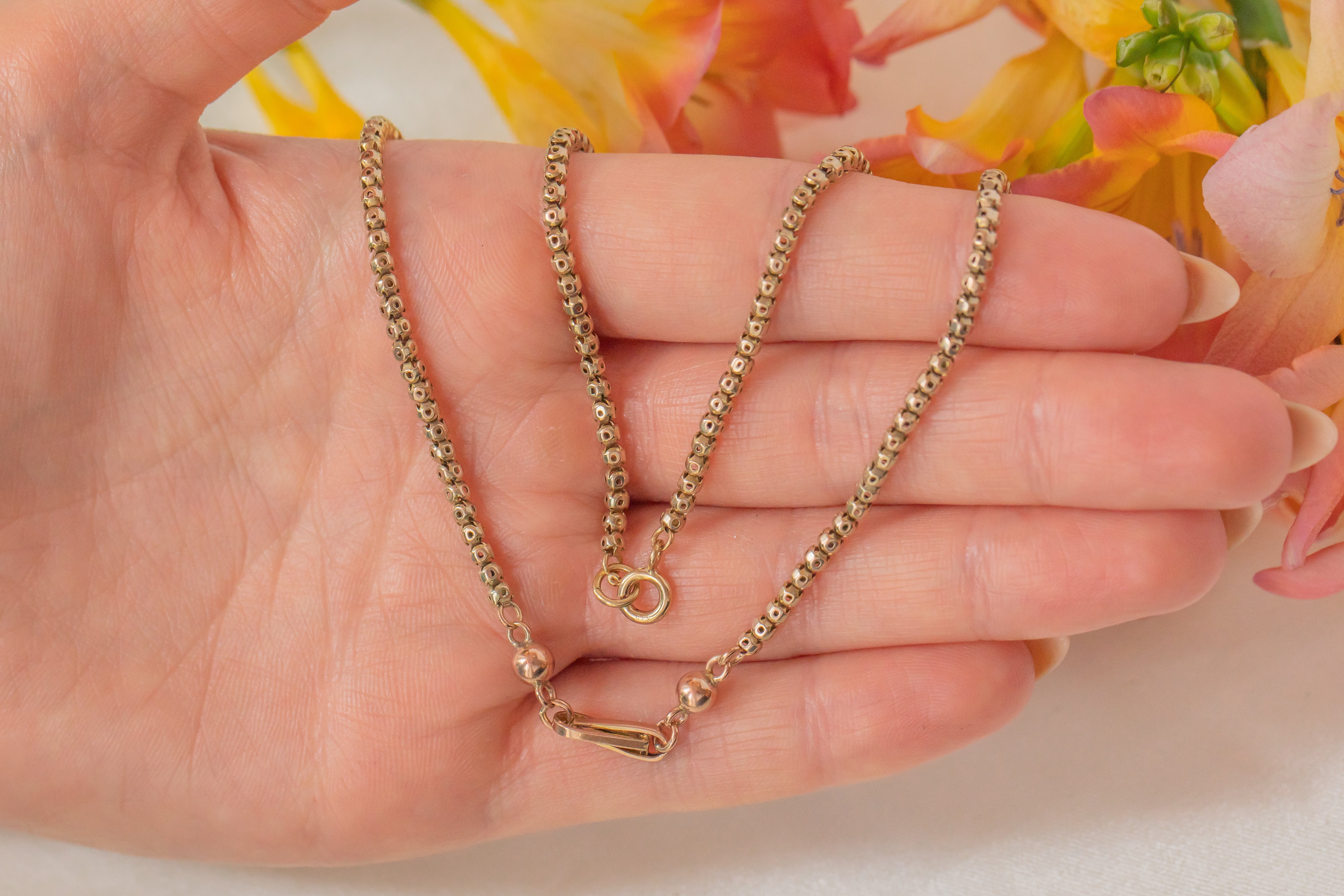 EXCELLENT. This antique 9ct Gold pierced chain is in excellent condition! Each pierced link is uniform and securely interlinked with the central ball and fetter detailing firmly affixed to the chain. The bolt ring is in perfect working condition so you can wear this piece with pride and confidence.