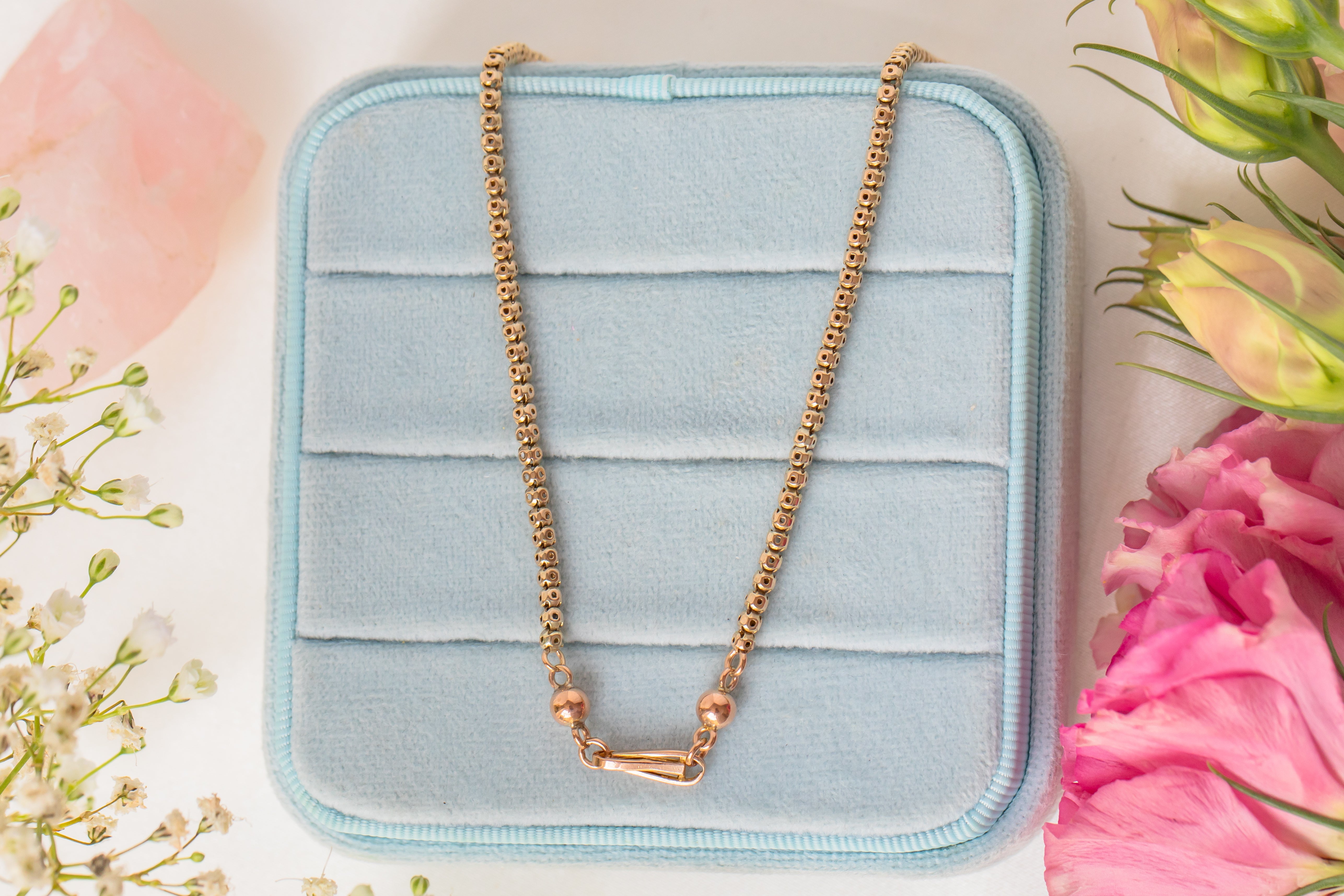 This antique 9ct Gold pierced chain, complete with charming ball and fetter details, is one you don't want to miss! Composed of honey-hued 9ct Gold, each rounded box link is pierced to perfection.