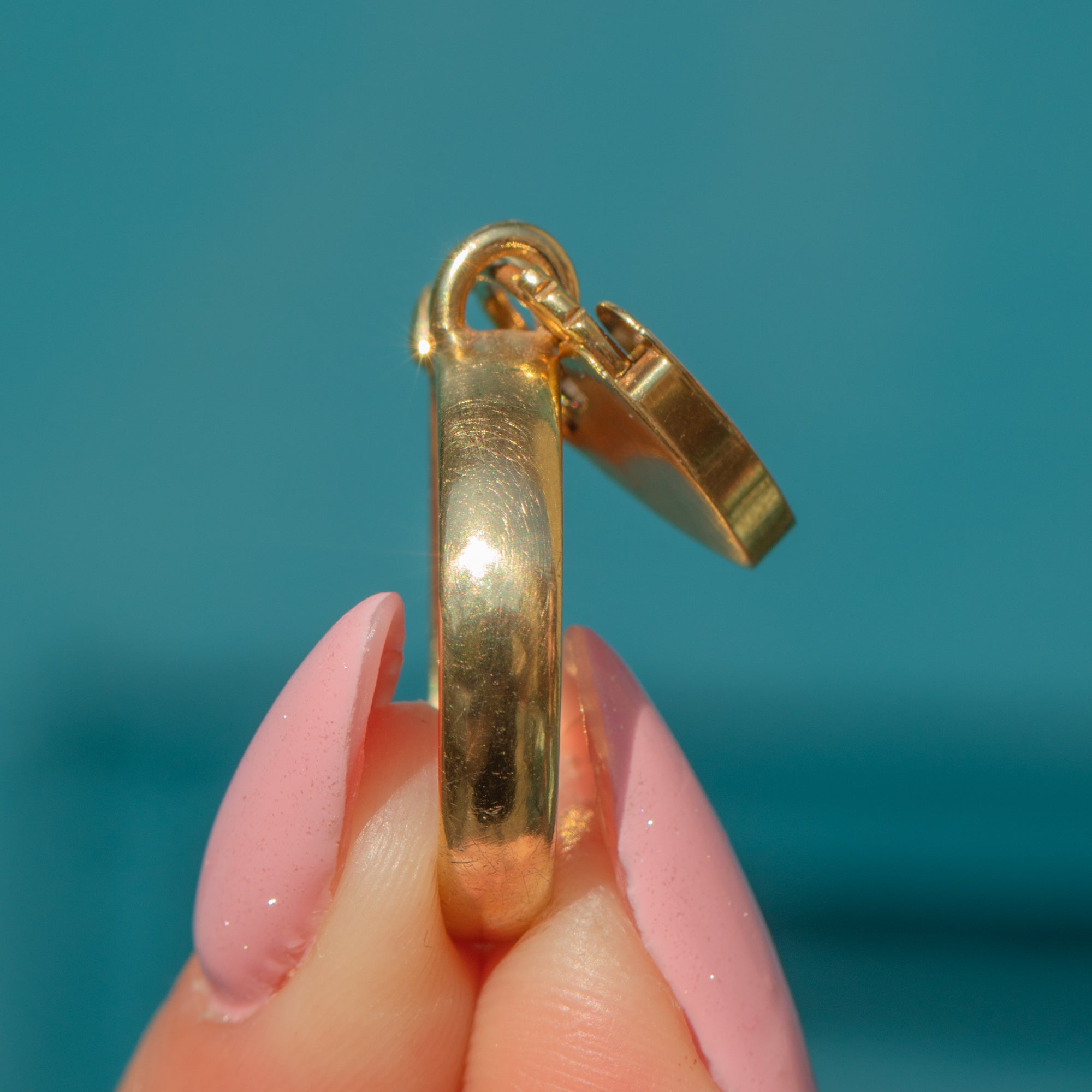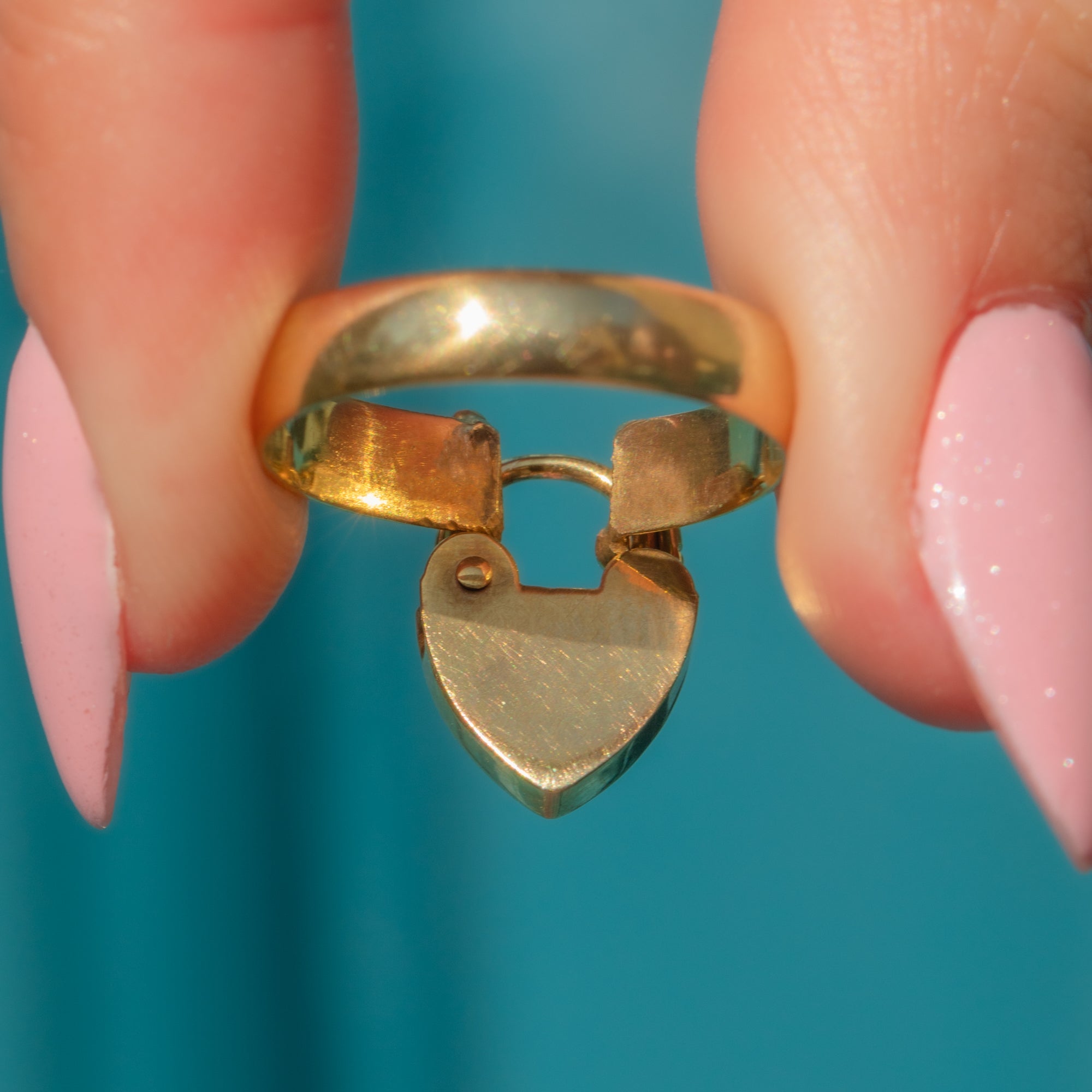VERY GOOD-EXCELLENT: This antique 9ct Gold heart padlock ring is in lovely condition. The Gold is lustrous and buttery, with only some minor age-related surface wear. The attachments suspending the padlock do not match completely, likely due to a replacement from a previous repair, though this simply adds to her unique charm! In great condition, you can enjoy wearing this ring every day with confidence!