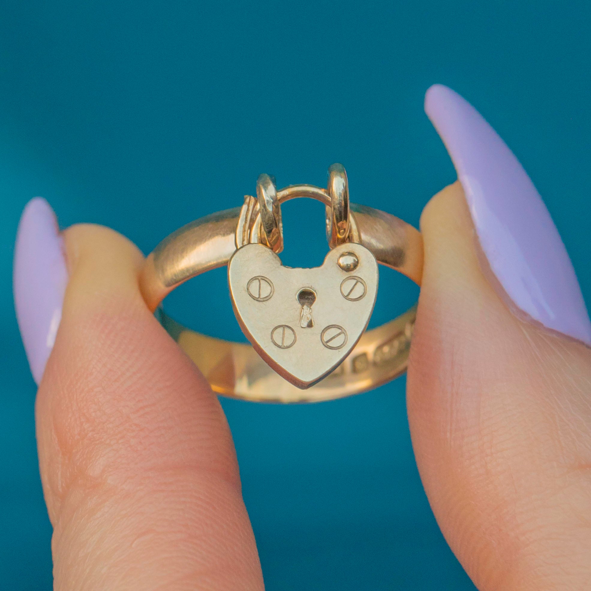 EXCELLENT. This antique 9ct Gold ring is in brilliant condition. She has very minimal signs of wear, and her hallmarks have remained crisp allowing us to date her to 1890. With her heart padlock securely attached and little else to note, you can wear her with confidence!