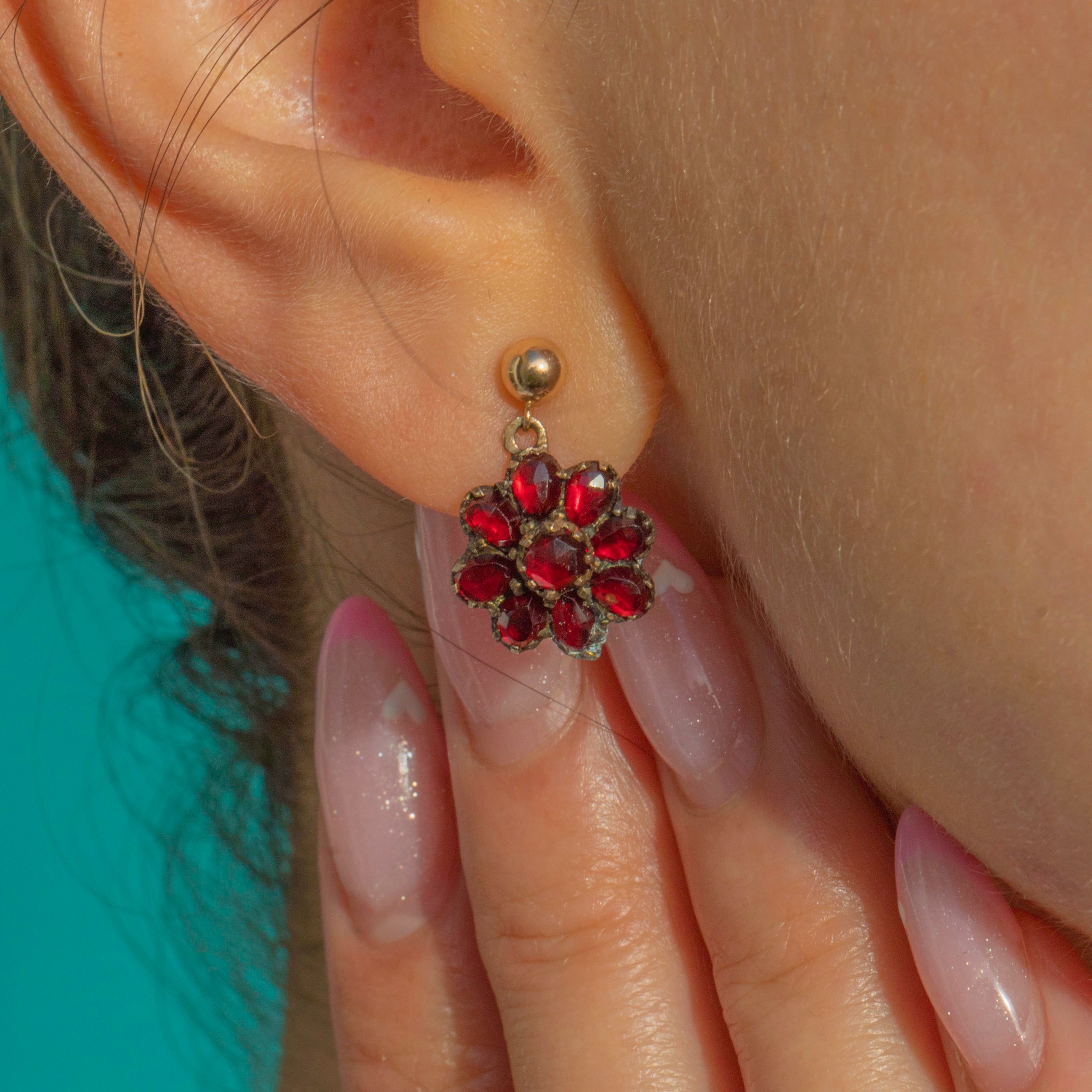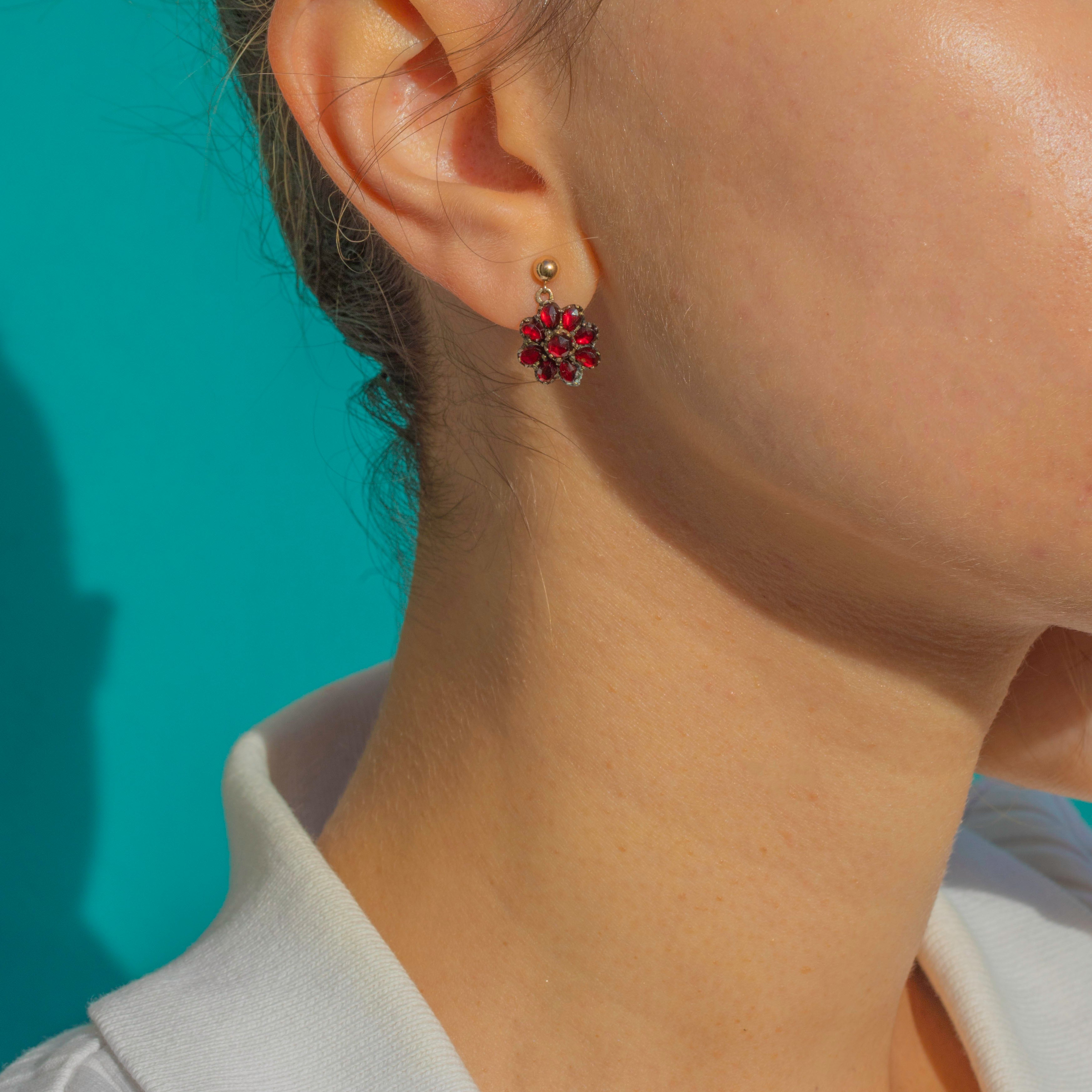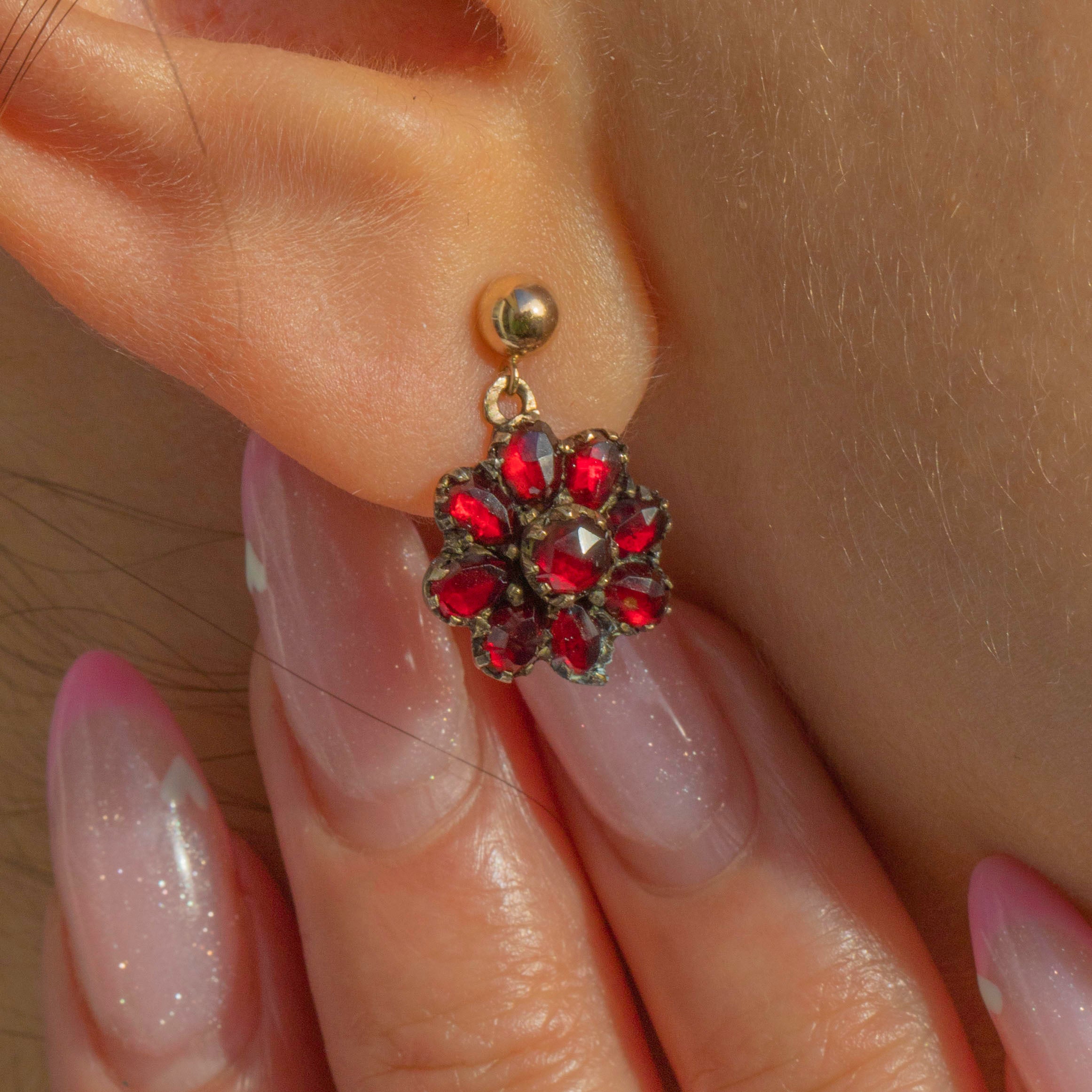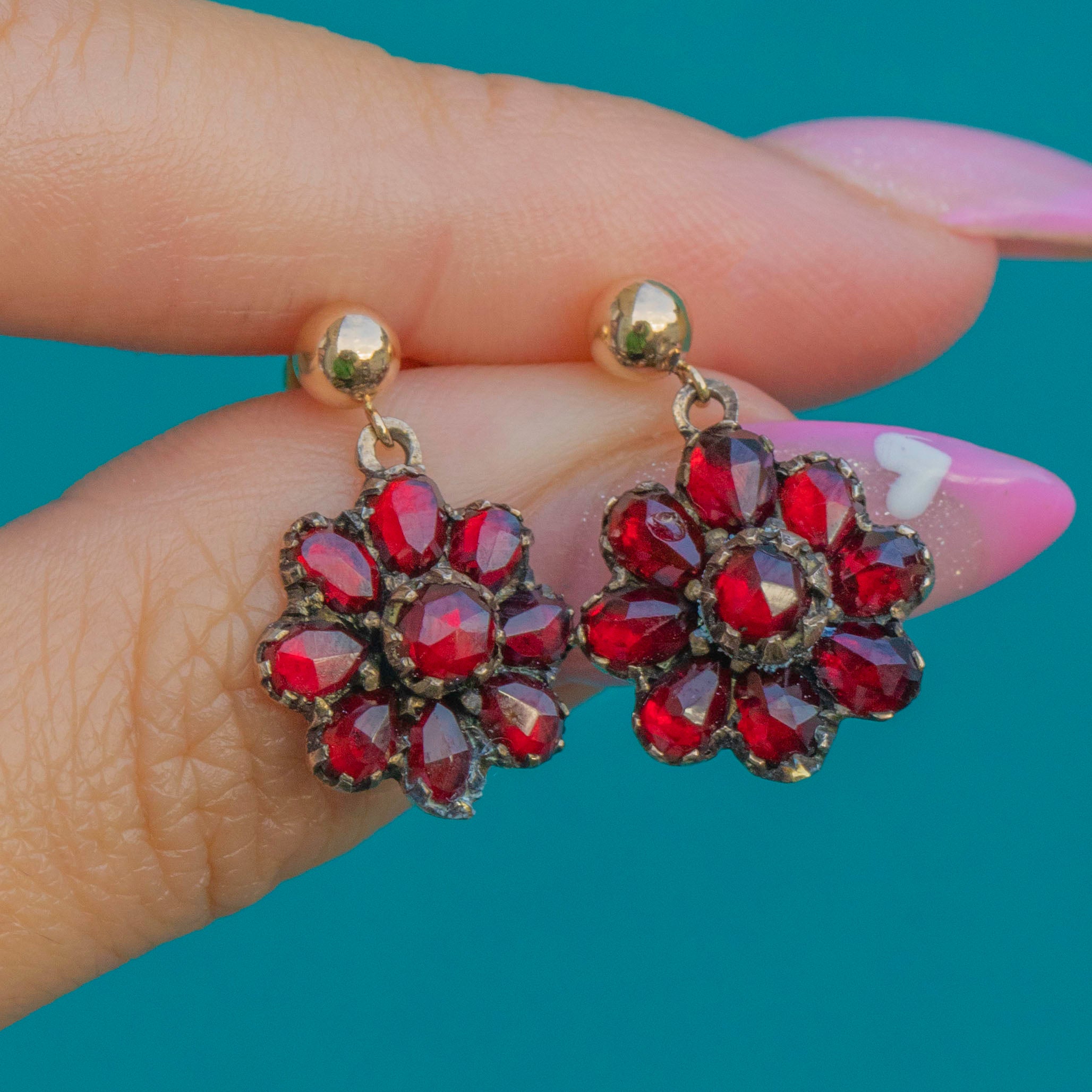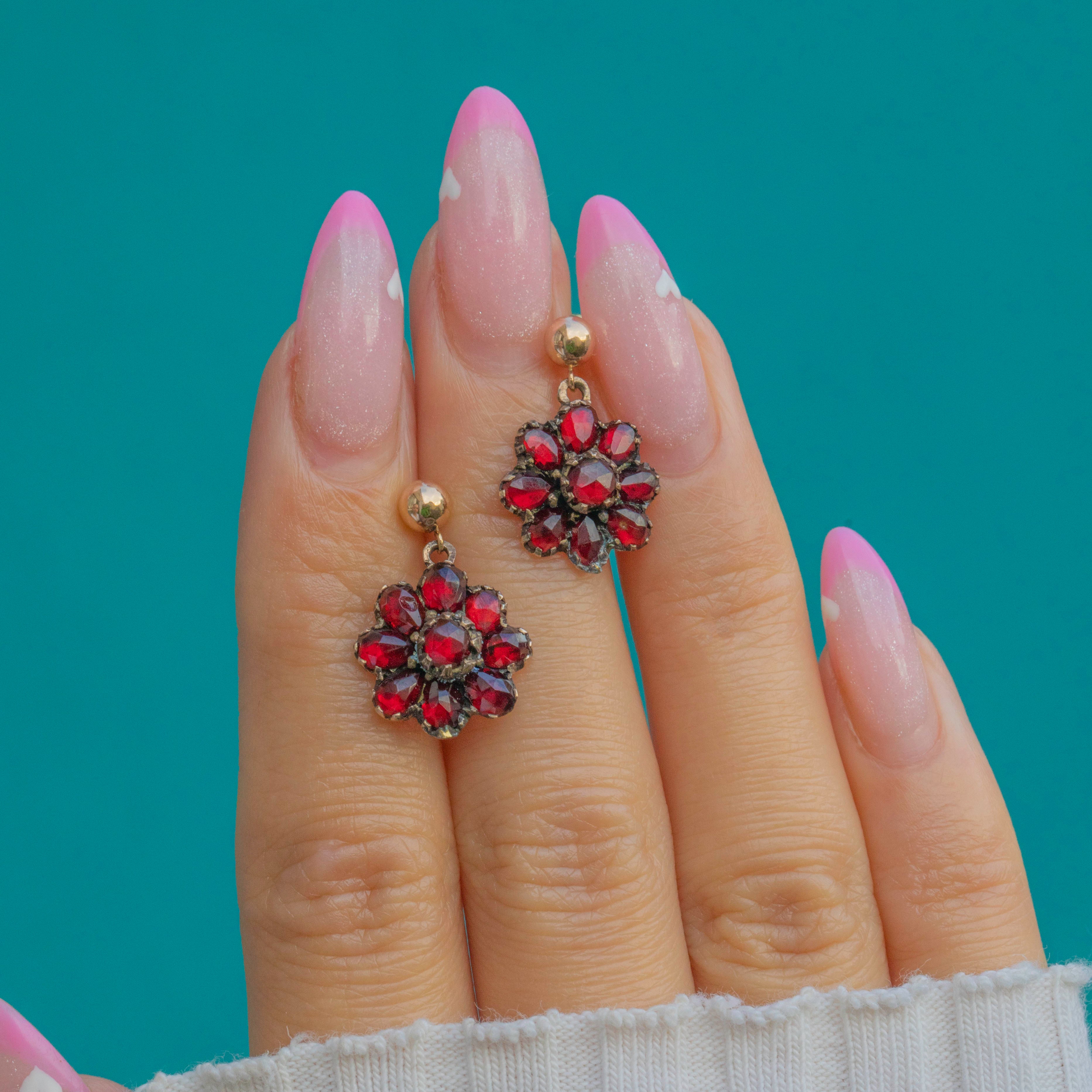 These beautiful Victorian earrings are formed into charming floral clusters, each petal studded with a richly hued rose-cut Garnet set in Garnet Gold. The Garnets display deep red hues with flashes of raspberry and wine, perfectly complemented by the warm antique Gold. Their size and ball-top fittings make them a striking and wearable pair, elegant, romantic, and full of period character.