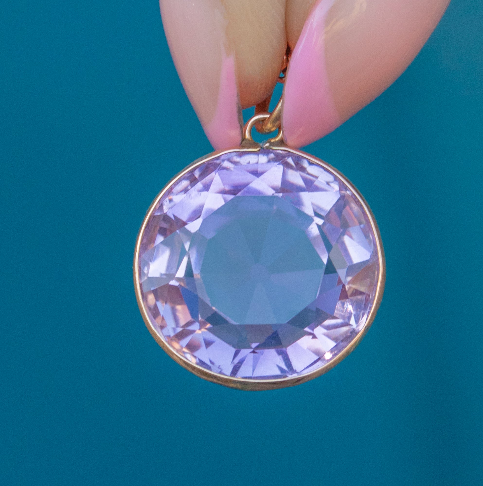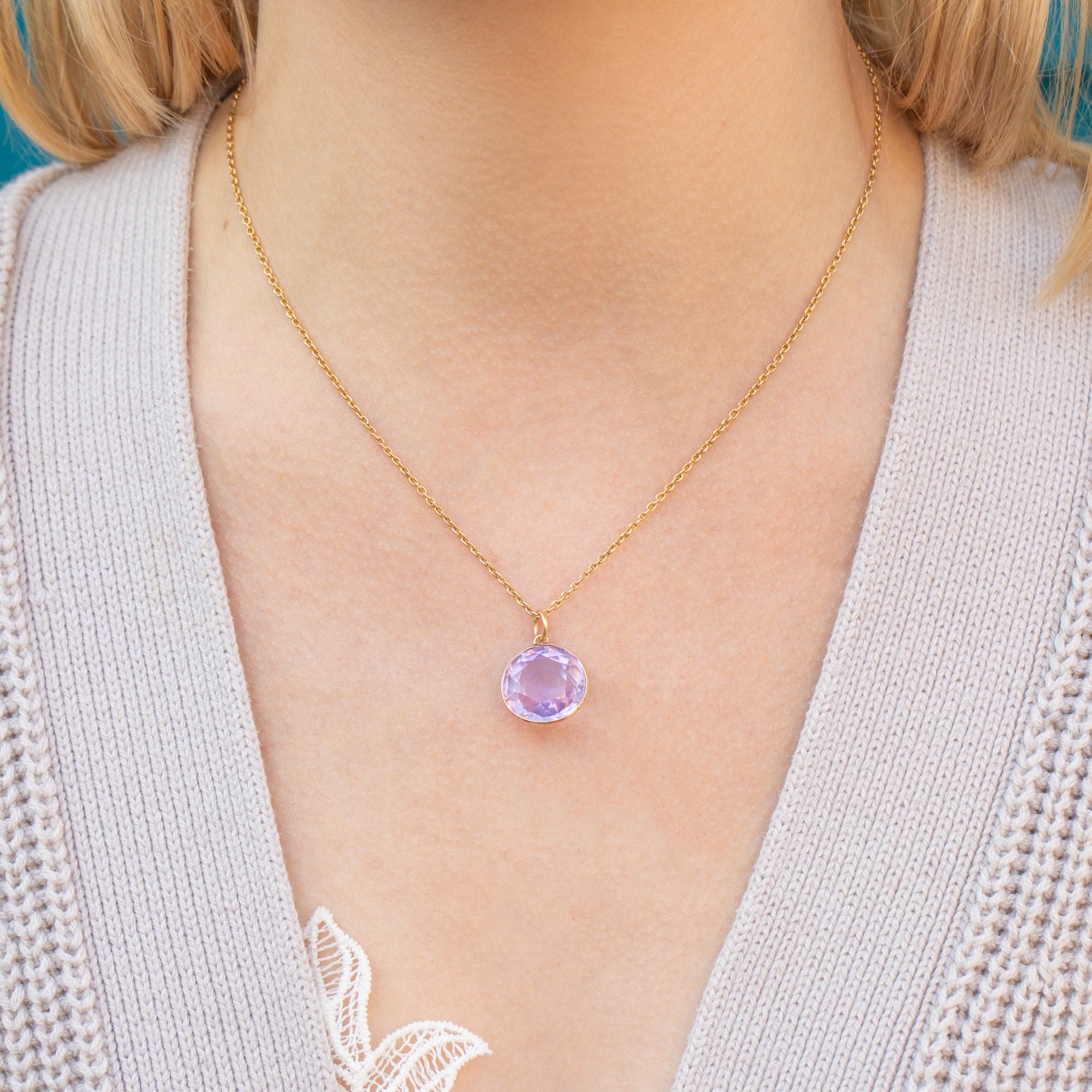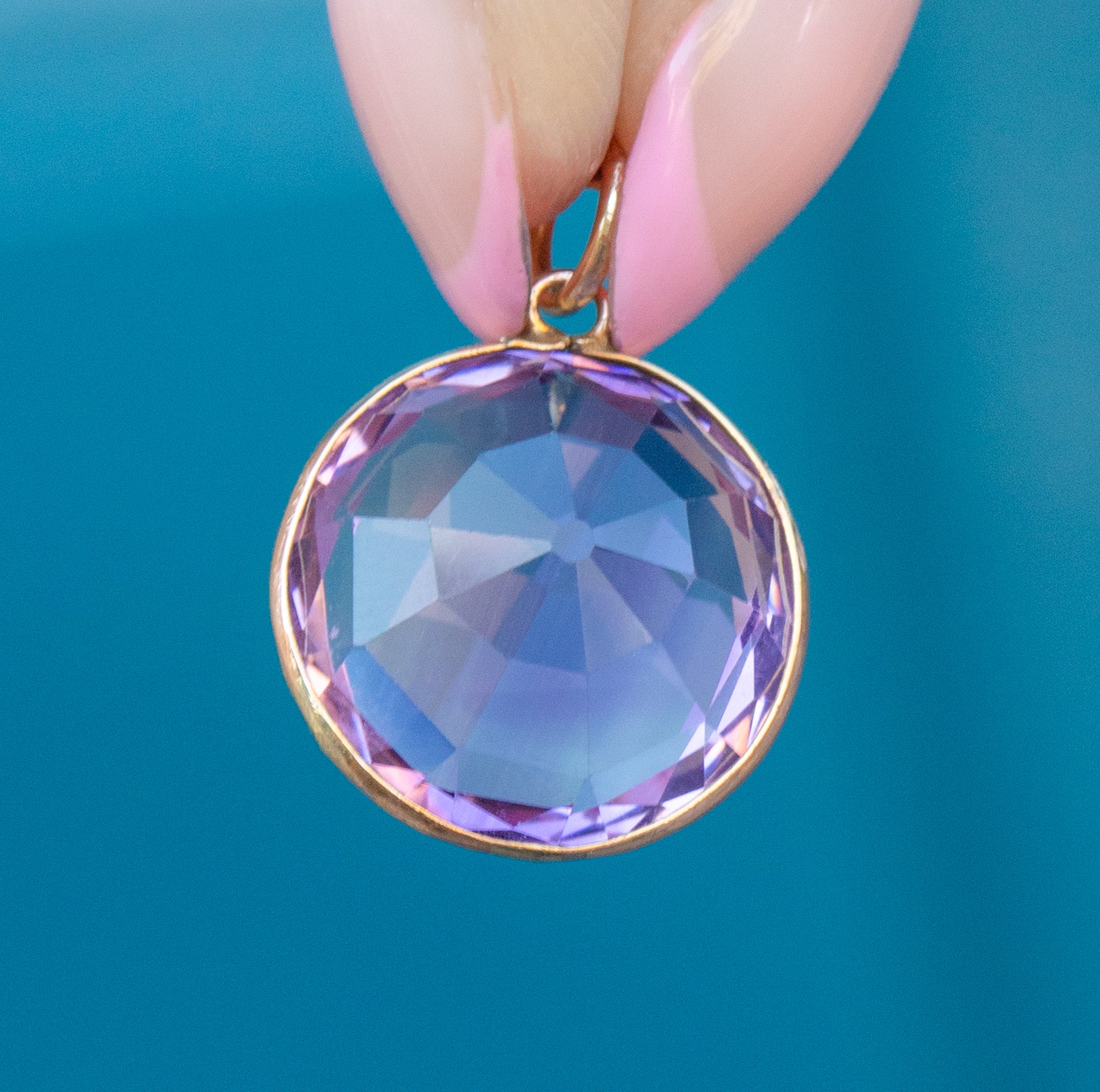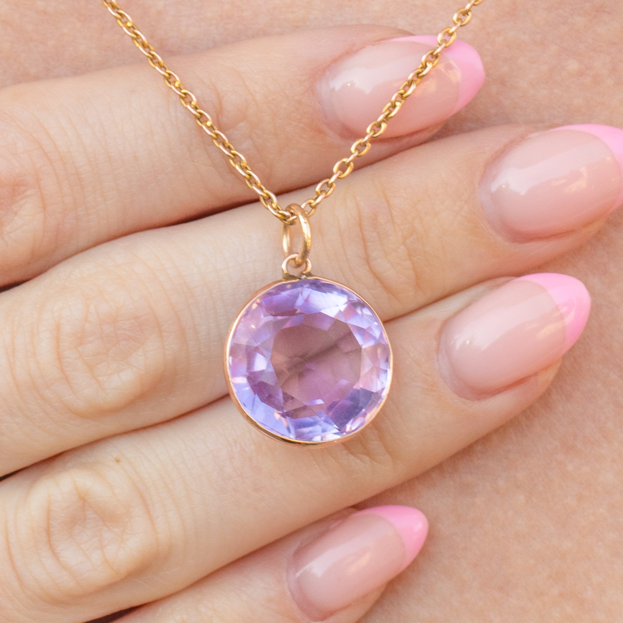 This antique 9ct Gold round Amethyst pendant will add a touch of Victorian elegance to any attire. Boasting a 7.55ct lilac-hued Ameythst with crisp facets, this Victorian pendant catches the sunlight magnificently, like a purple drop of heaven!