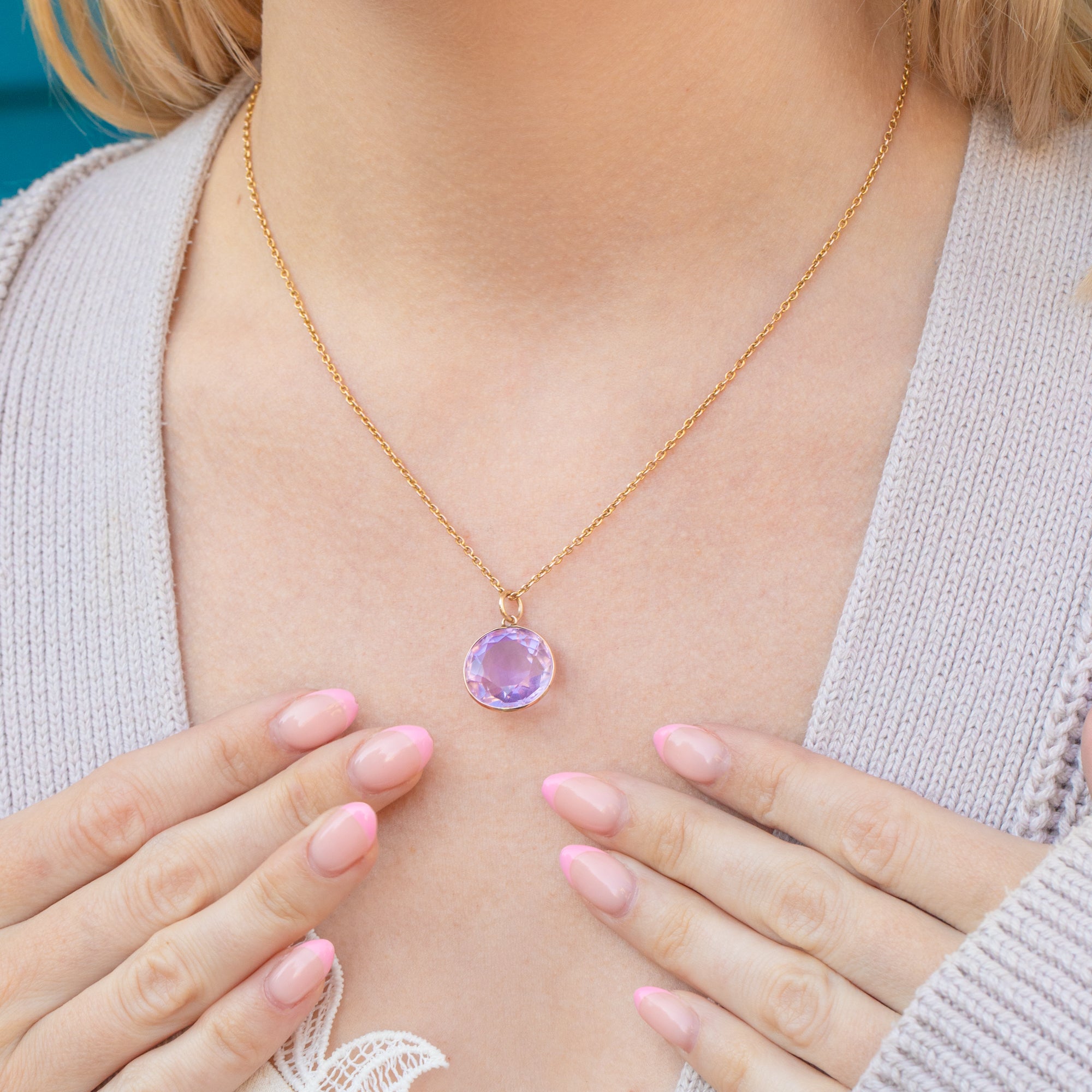 Crafted from 9ct Gold buttery, that perfectly complements her round-faceted Amethyst, every crevice radiates sophistication and allure. All you have to do is affix her to a chic antique gold chain and show her off to the world!