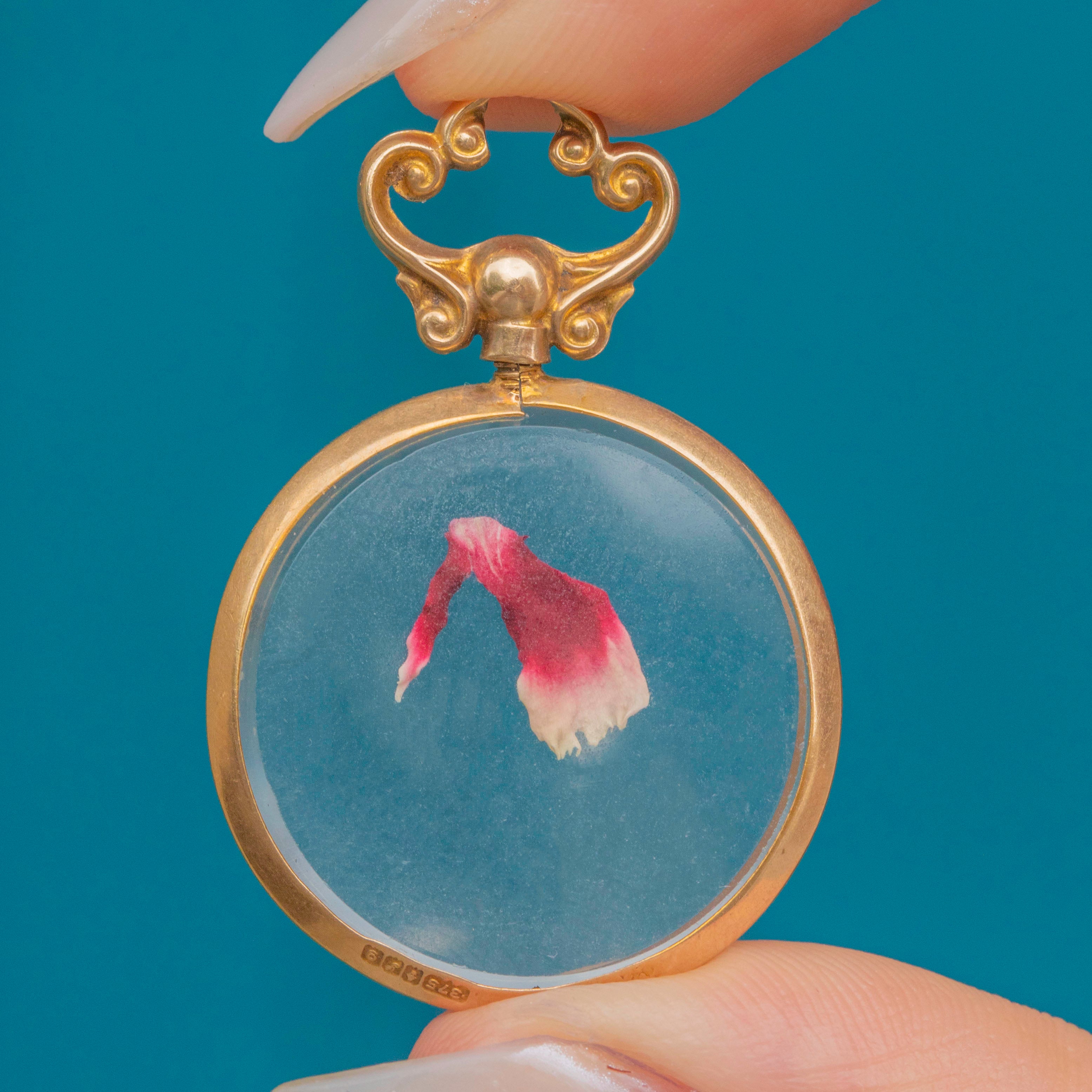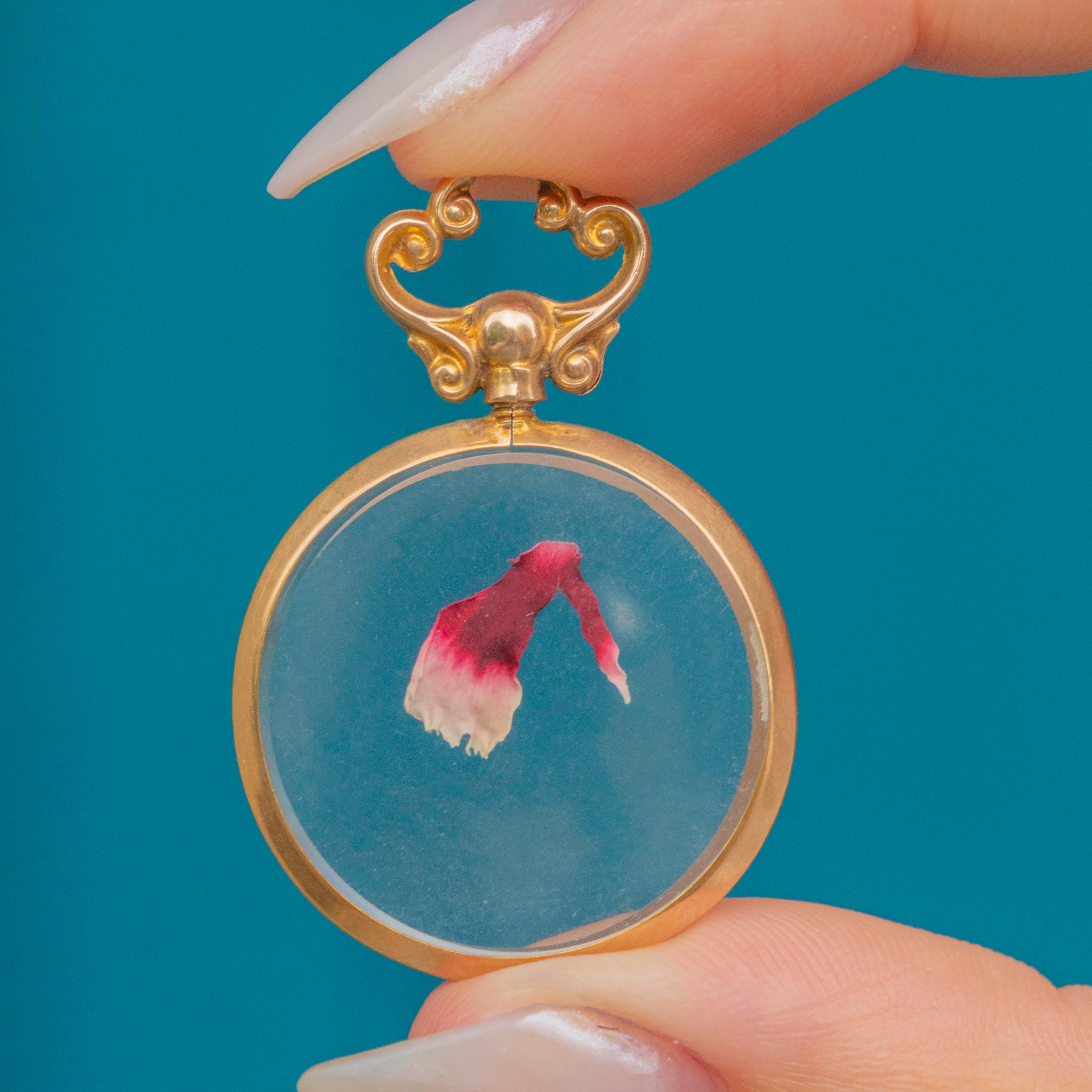 Antique 9ct Gold Round Locket with Pressed Flower Petal, c.1915