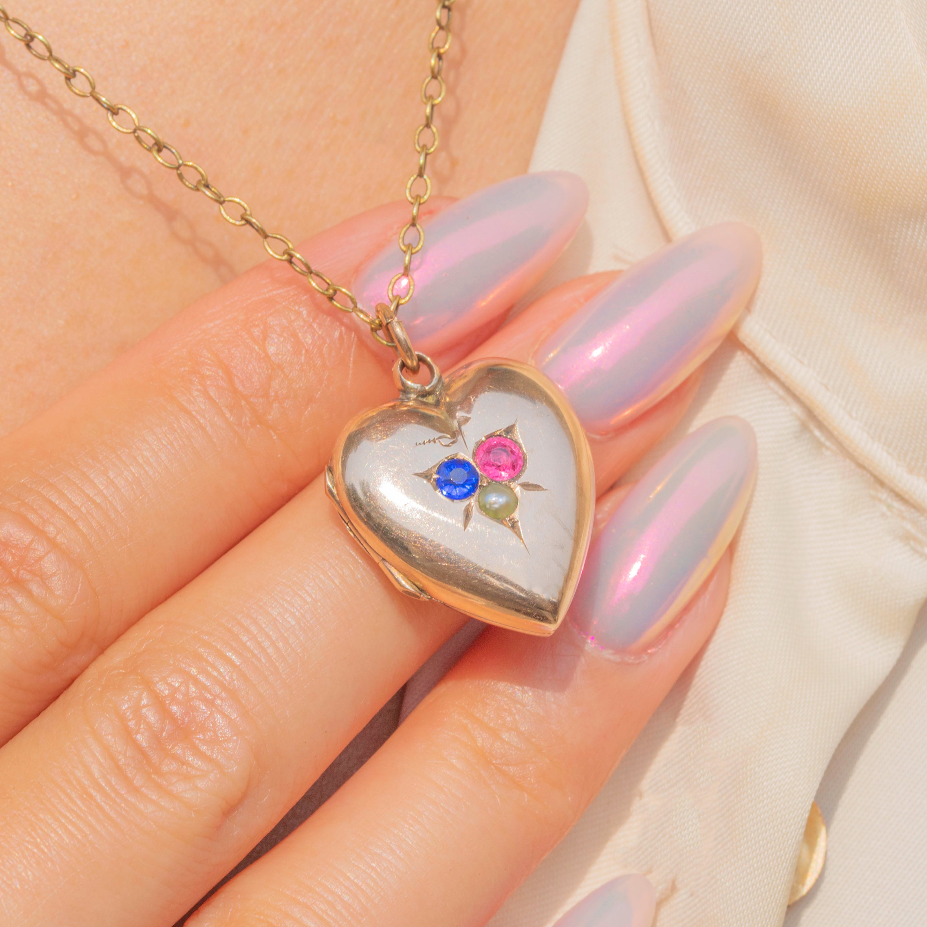 This antique 9ct Gold Ruby Pearl heart locket will capture your affections! Featuring a pretty Seed Pearl, scarlet Ruby and midnight blue Sapphire Paste inlaid into an ivy leaf engraving, this antique locket encapsulates the romantic essence of Victorian designs.