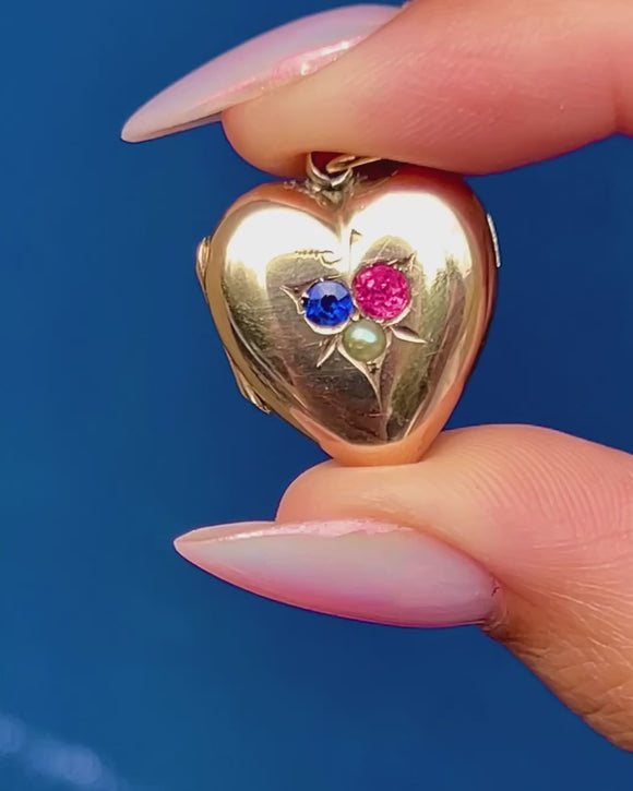 VERY GOOD: This antique 9ct Gold Ruby Pearl heart locket is in fabulous condition throughout. The 9ct Gold has accrued a delightful Gold sheen from age with the most minor wear commensurate with age.  All of the gemstones are secure in their settings, and while there is some wear to them, they still sparkle beautifully!