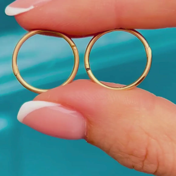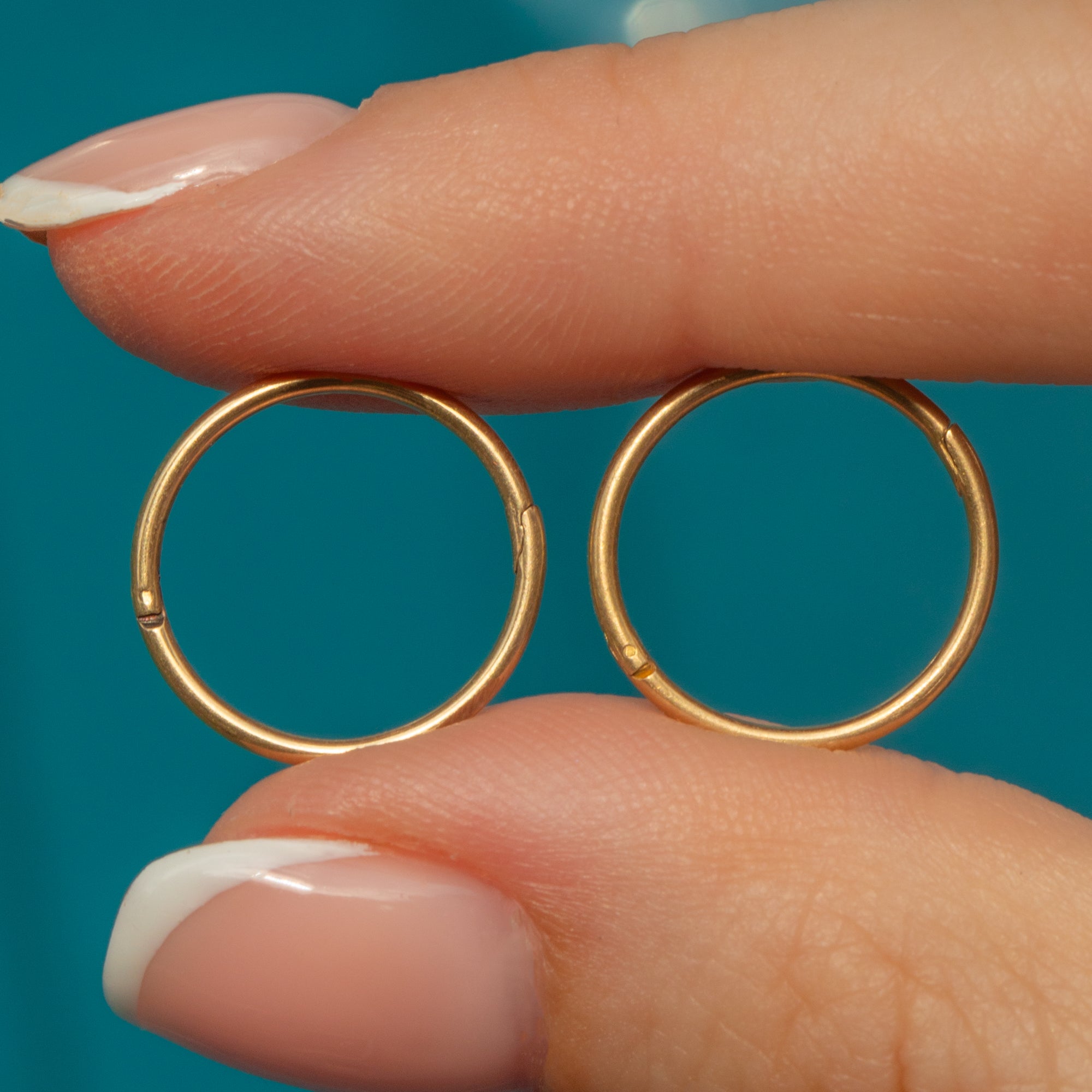 VERY GOOD-EXCELLENT. We are pleased to present these antique 9ct Gold sleeper hoops in very good to excellent condition! They have a glossy Gold hue throughout and have retained a perfectly round shape. One of the '9ct' stamps has obscured but the other is still legible and we can confirm they both test as 9ct Gold. Due to their delicate design they need to be handled with care but once in the ear they lock in to place securely. There timeless beauty makes them the ultimate addition to your antique jewellery collection!