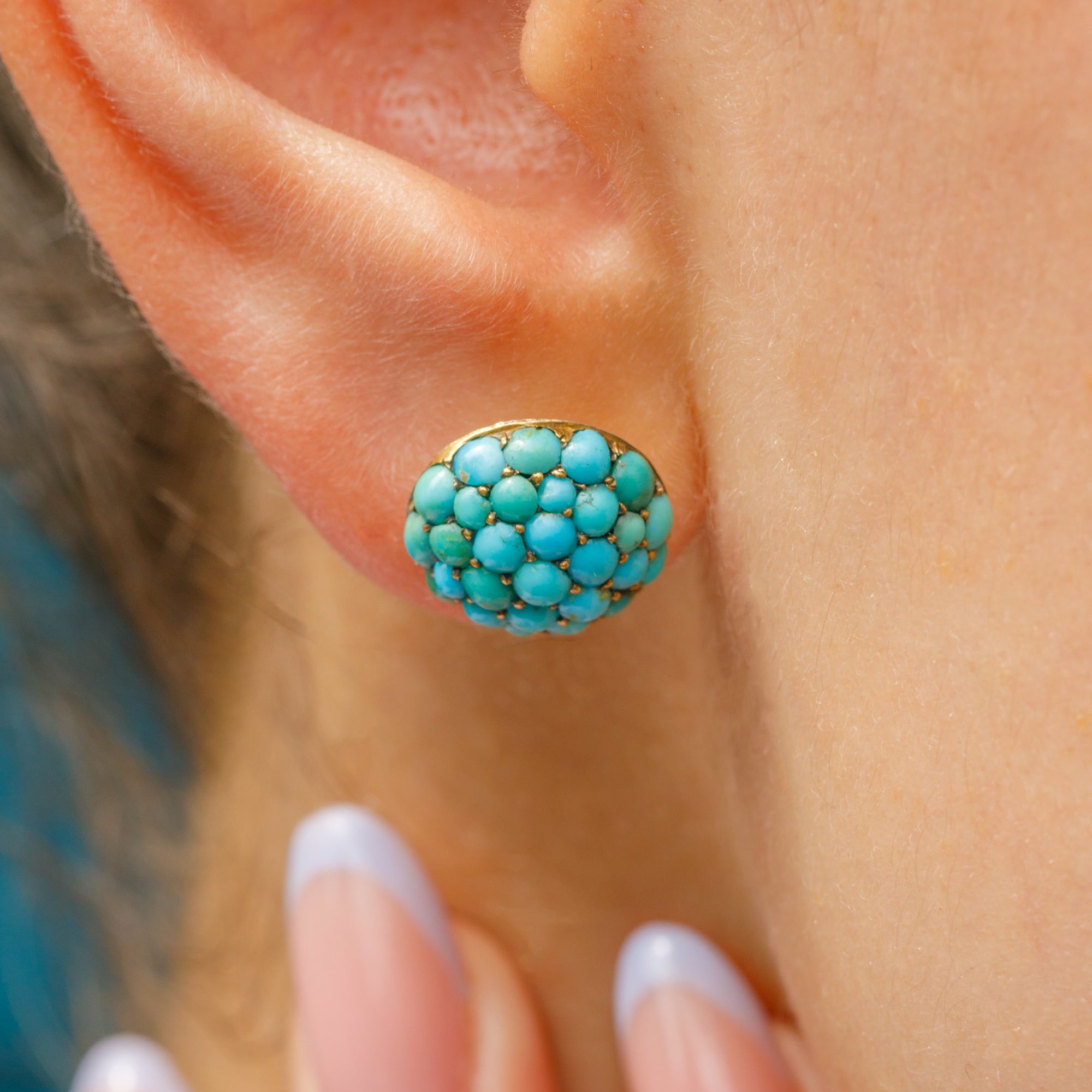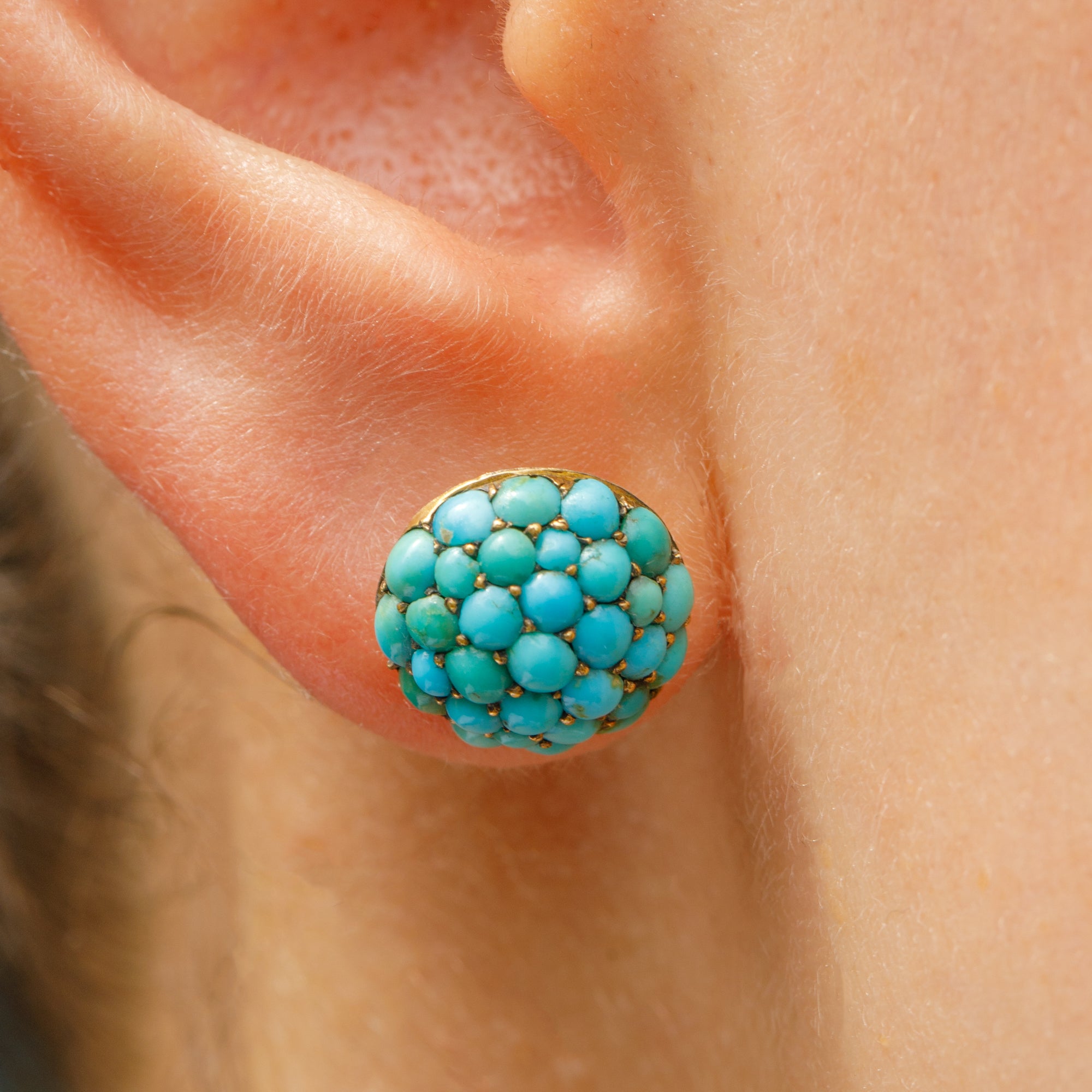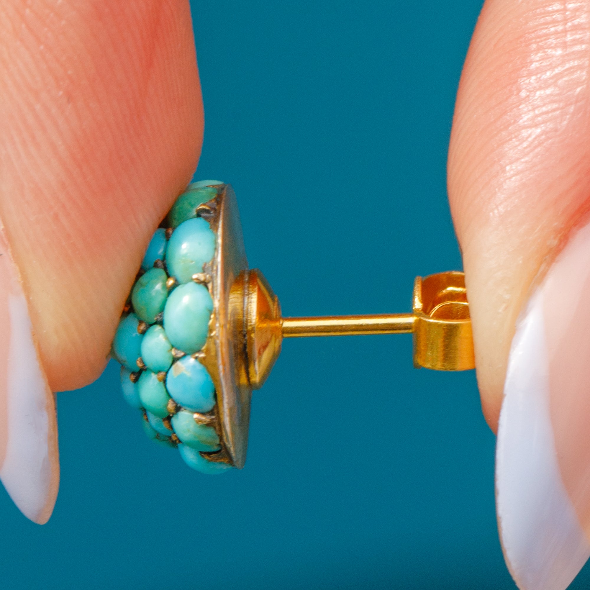 VERY GOOD: These Victorian 9ct Gold Turquoise pavé stud earrings are in very good condition.Each Turquoise is radiant and set securely within their pave settings. There are some notable signs of wear to the Gold backs, with patches of discolouration, though this cannot be seen when wearing and does not affect functionality. With secure butterfly backs, these antique studs can be worn with confidence.