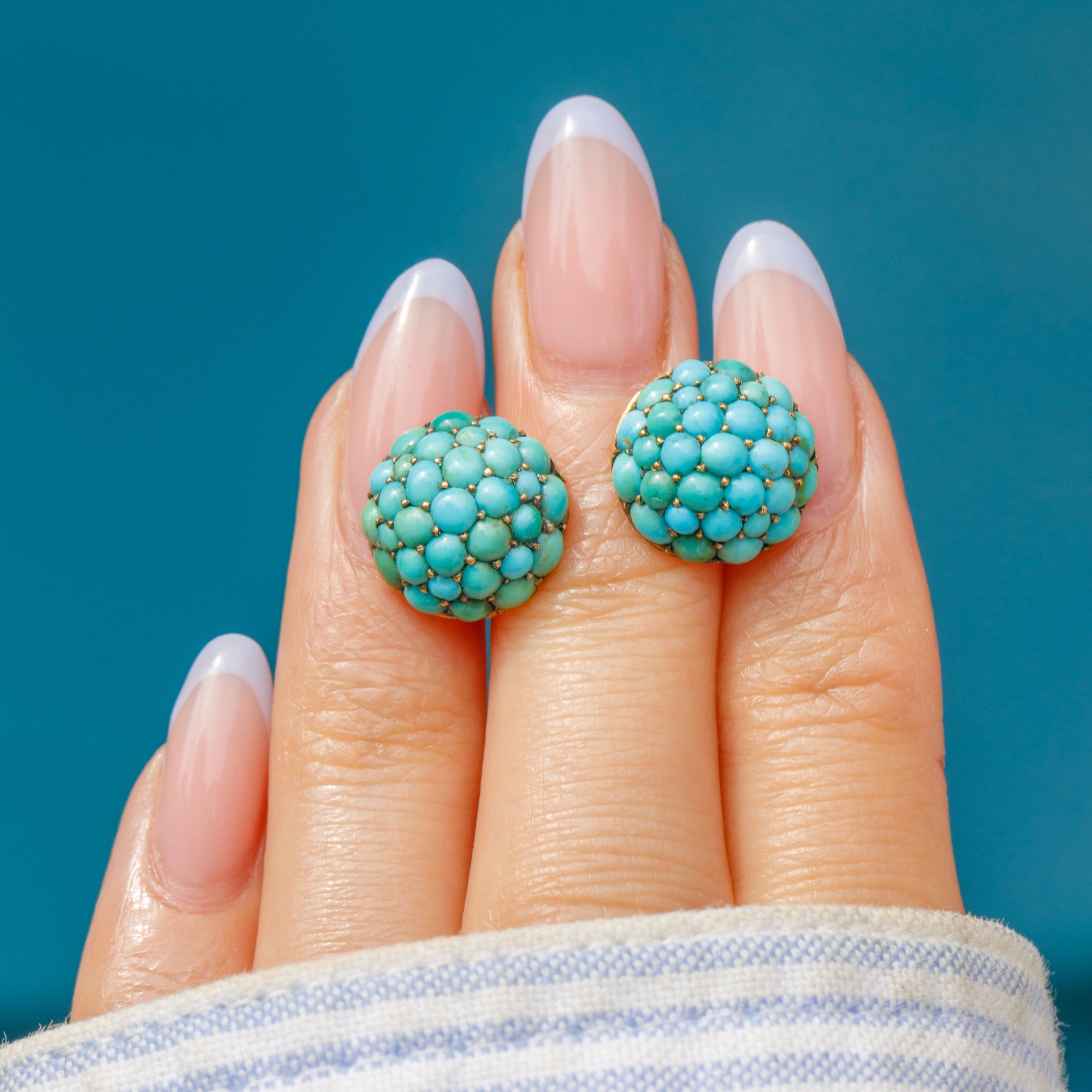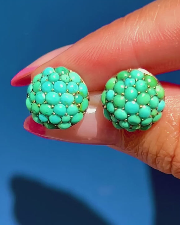 A striking pair of Victorian 9ct Gold Turquoise pavé stud earrings! These studs are embellished with an array of Turquoise stones, each with a distinct azure and green hue, secured in gorgeous pavé settings.