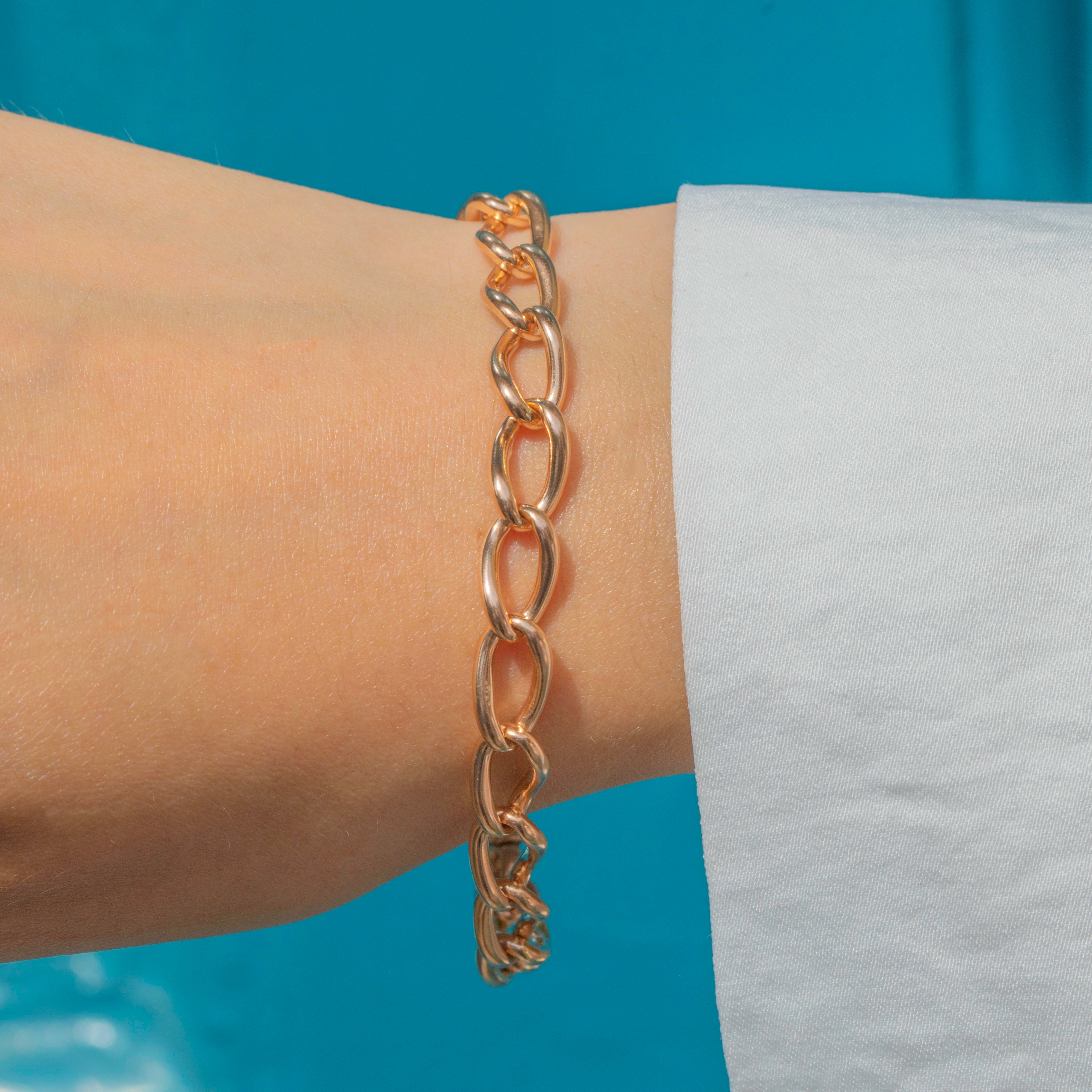 At 7" long, this glossy Gold bracelet is formed from rosy warm twisted curb links, adorning your wrist like liquid Gold. She is complete with an antique dog-clip, a highly sought-after collectible which makes this Victorian bracelet all the more charming.