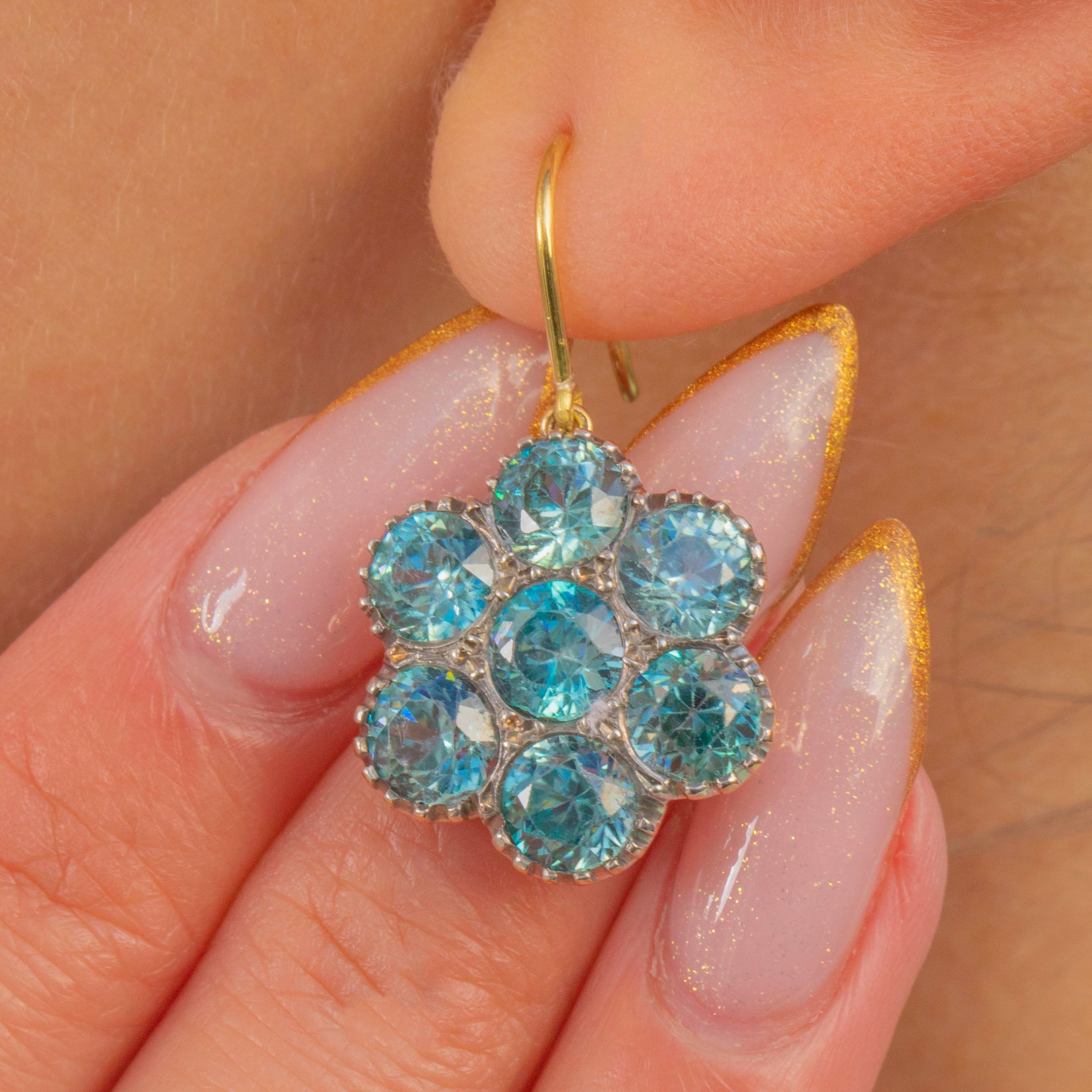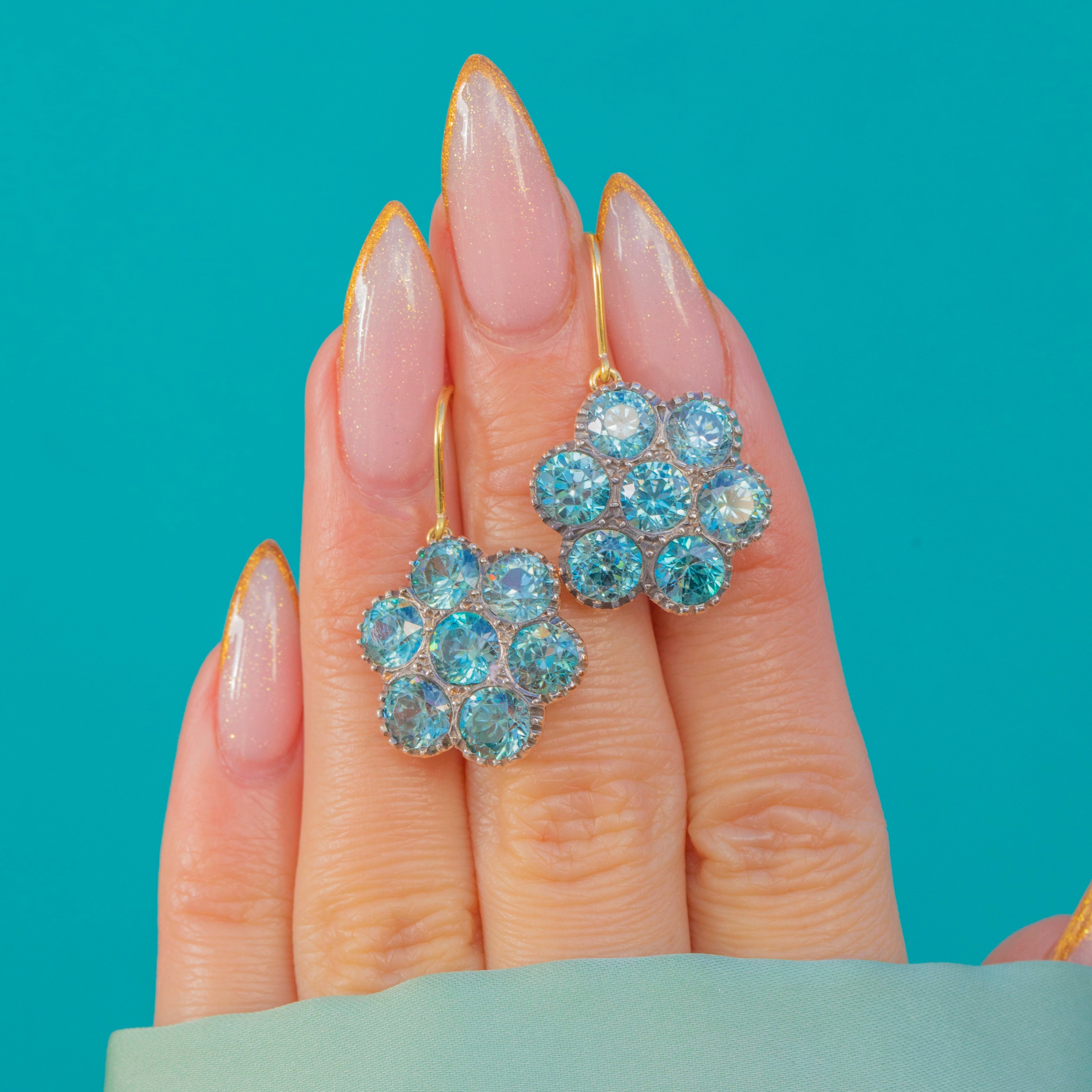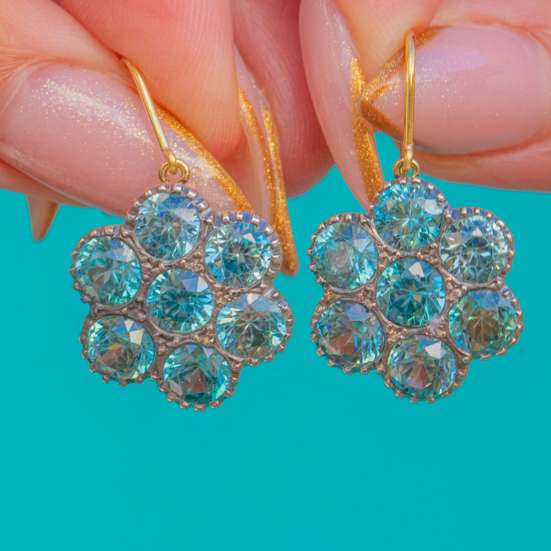 These Victorian Blue Zircon cluster earrings are wonderfully bright and full of fire, showcasing the vivid teal brilliance that only Natural Blue Zircon can give. Each earring forms a rounded floral-style cluster set in 9ct Gold with Sterling Silver settings around the stones, creating a gorgeous antique contrast between the icy sparkle of the Zircons and the warmth of the Gold.