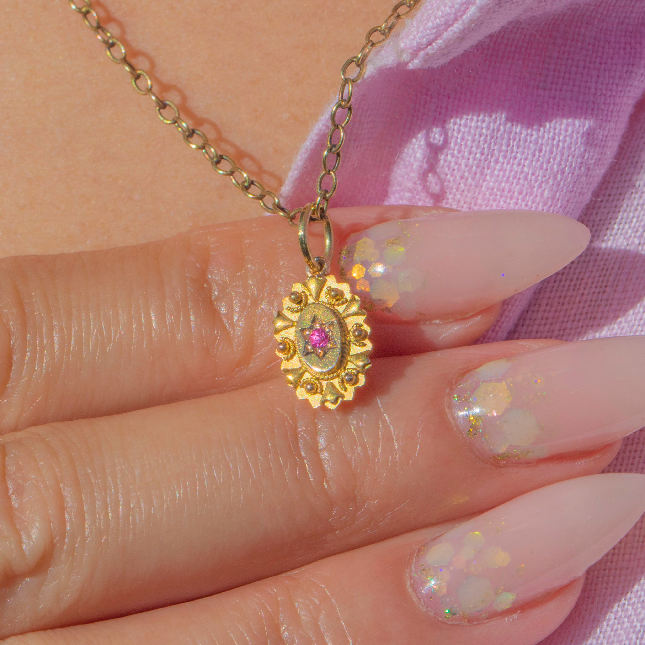 This antique Victorian charm is crafted in solid 15ct Gold, (not gilded or vermeille!) with beautiful Etruscan revival details. At its centre sits a vivid, star-set Ruby, adding a flash of colour against the warm Golden tones.