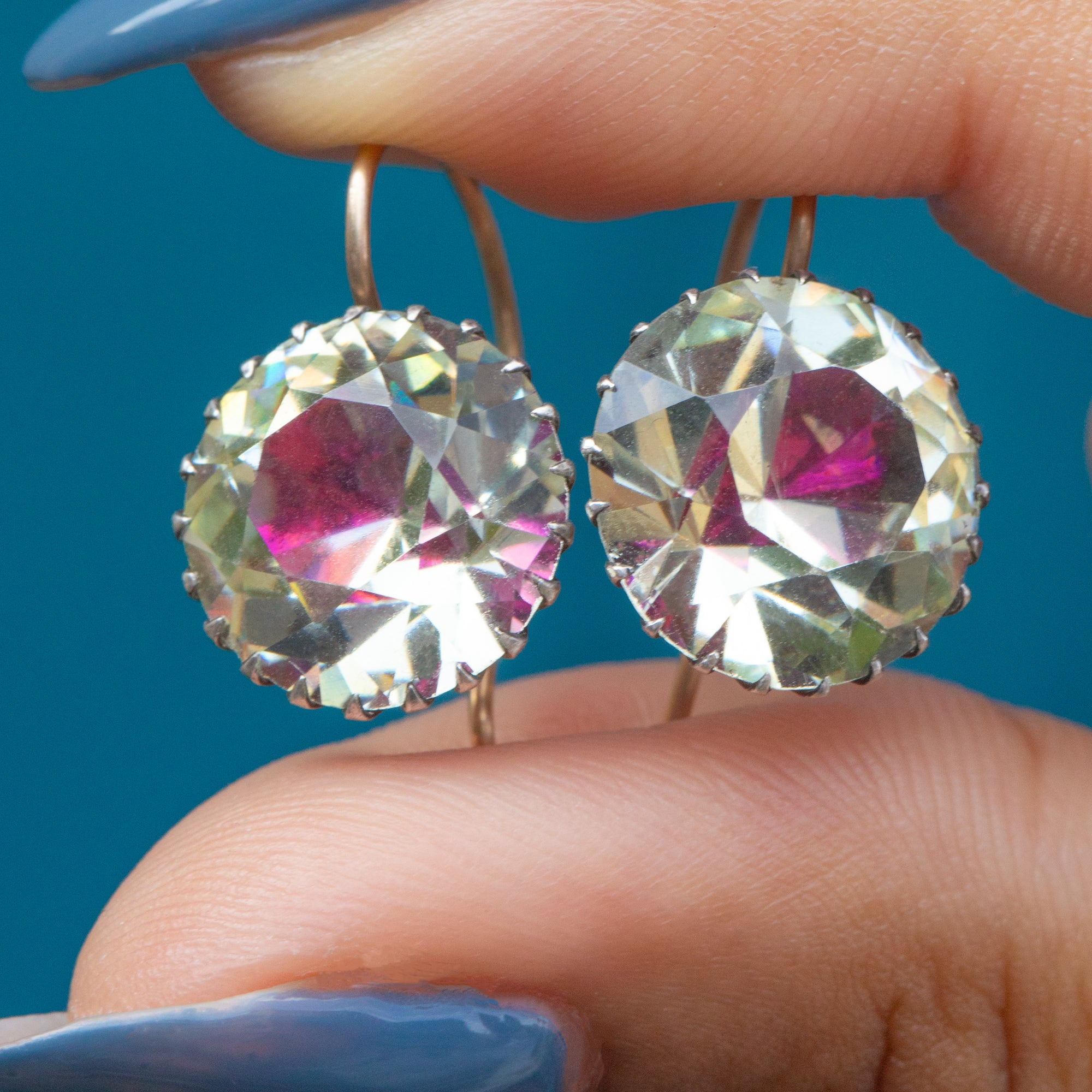 VERY GOOD. These antique foiled pink Paste button drop earrings are in wonderful condition. The Paste gemstones have a beautiful pink hue and the foils have been well preserved. One of the Paste gemstones has minor fleabites to some facets but these are only noticeable under closer inspection. There are some minor dings on the back of the earrings but this cannot be seen when worn. The Silver settings are lustrous and hold the Paste securely in place. The 15ct Gold hooks are robust and generously sized, allowing you to confidently wear these magnificent Victorian Paste earrings comfortably whatever the occasion!