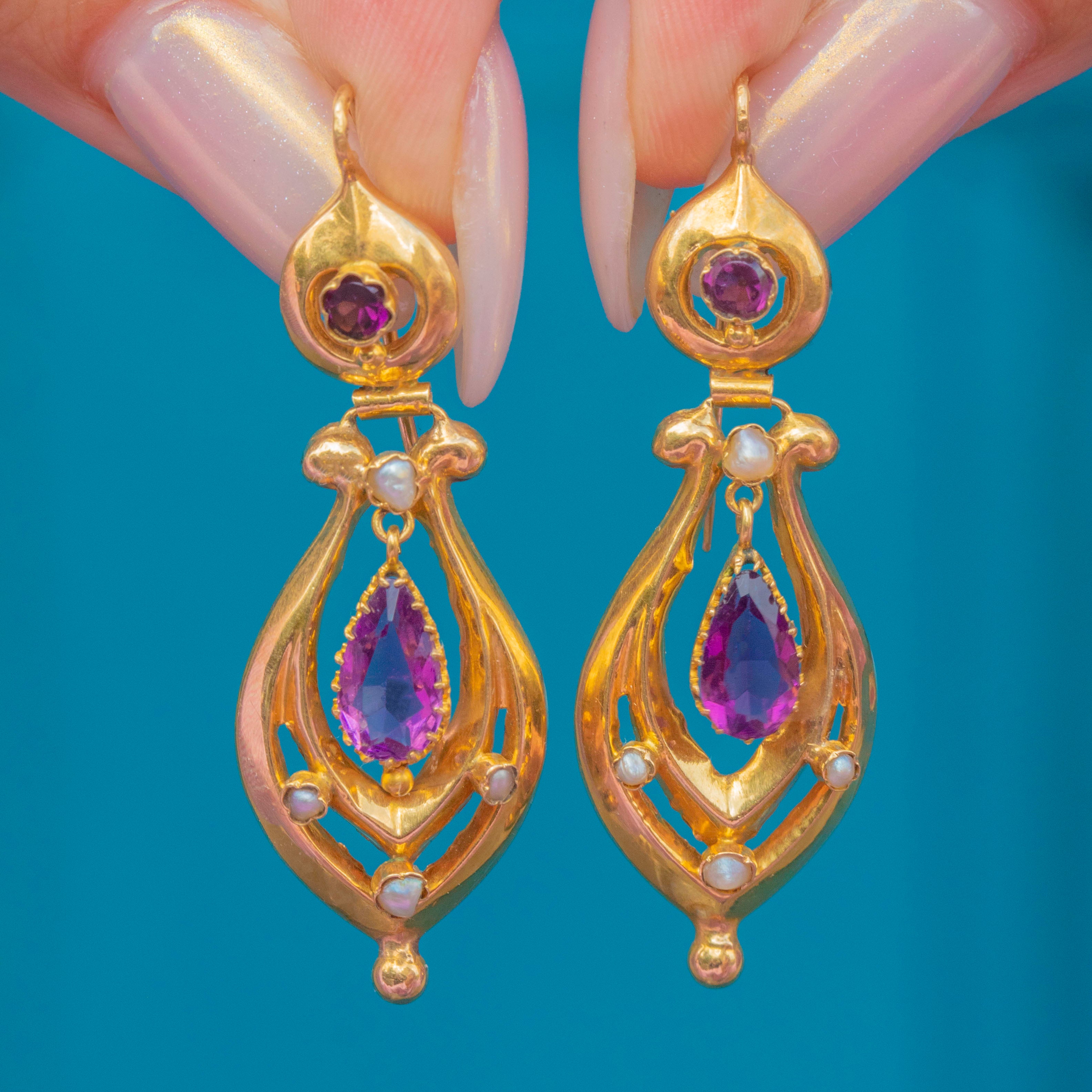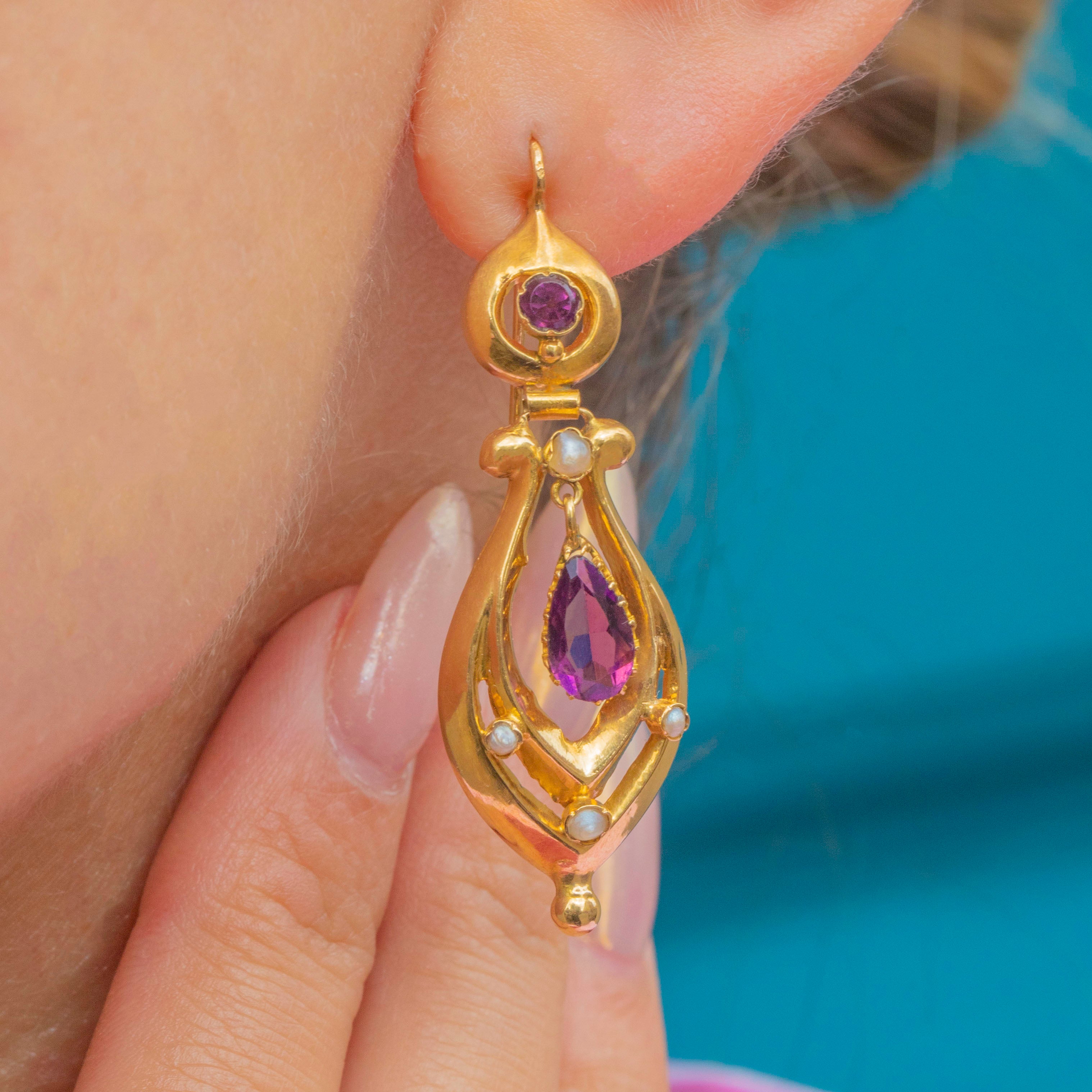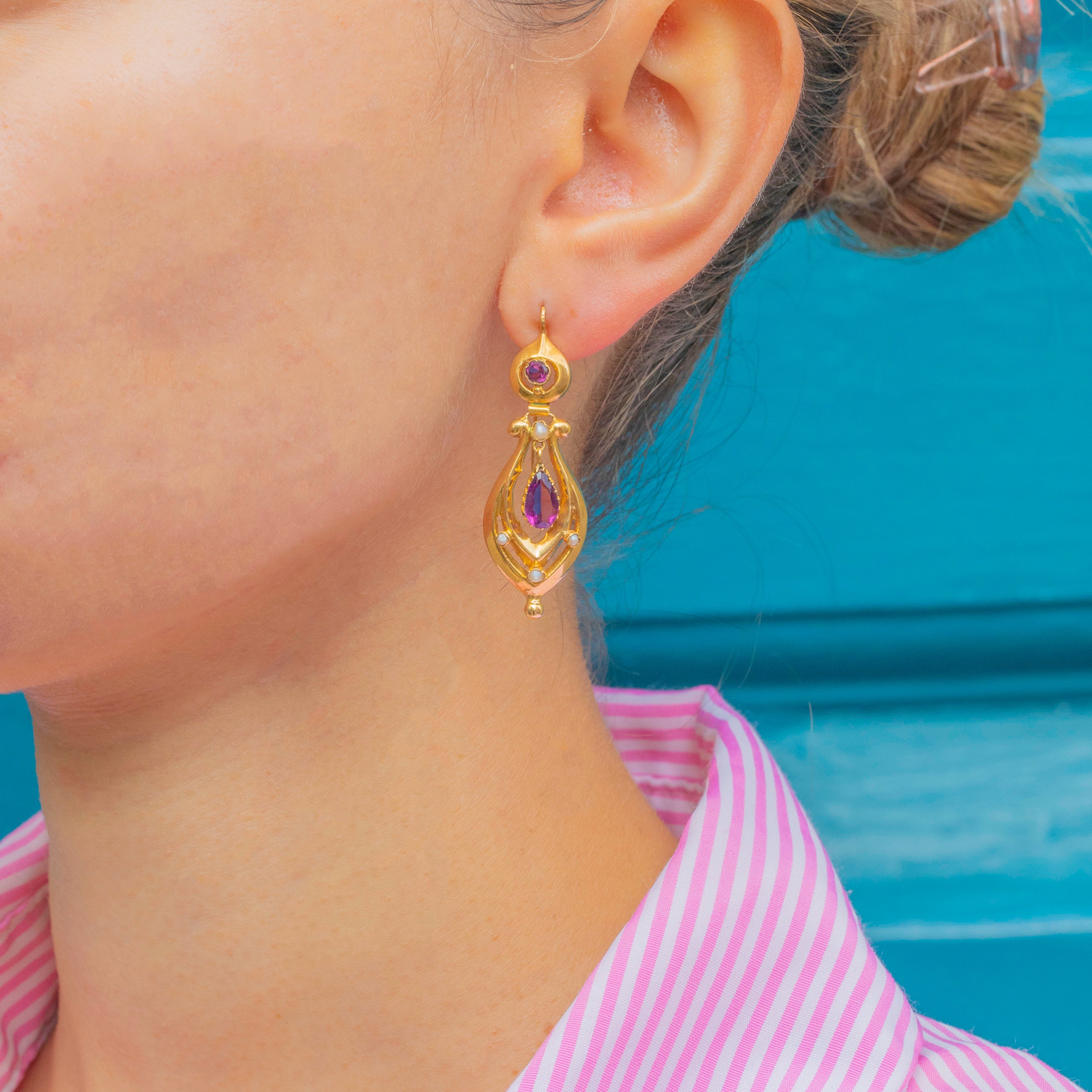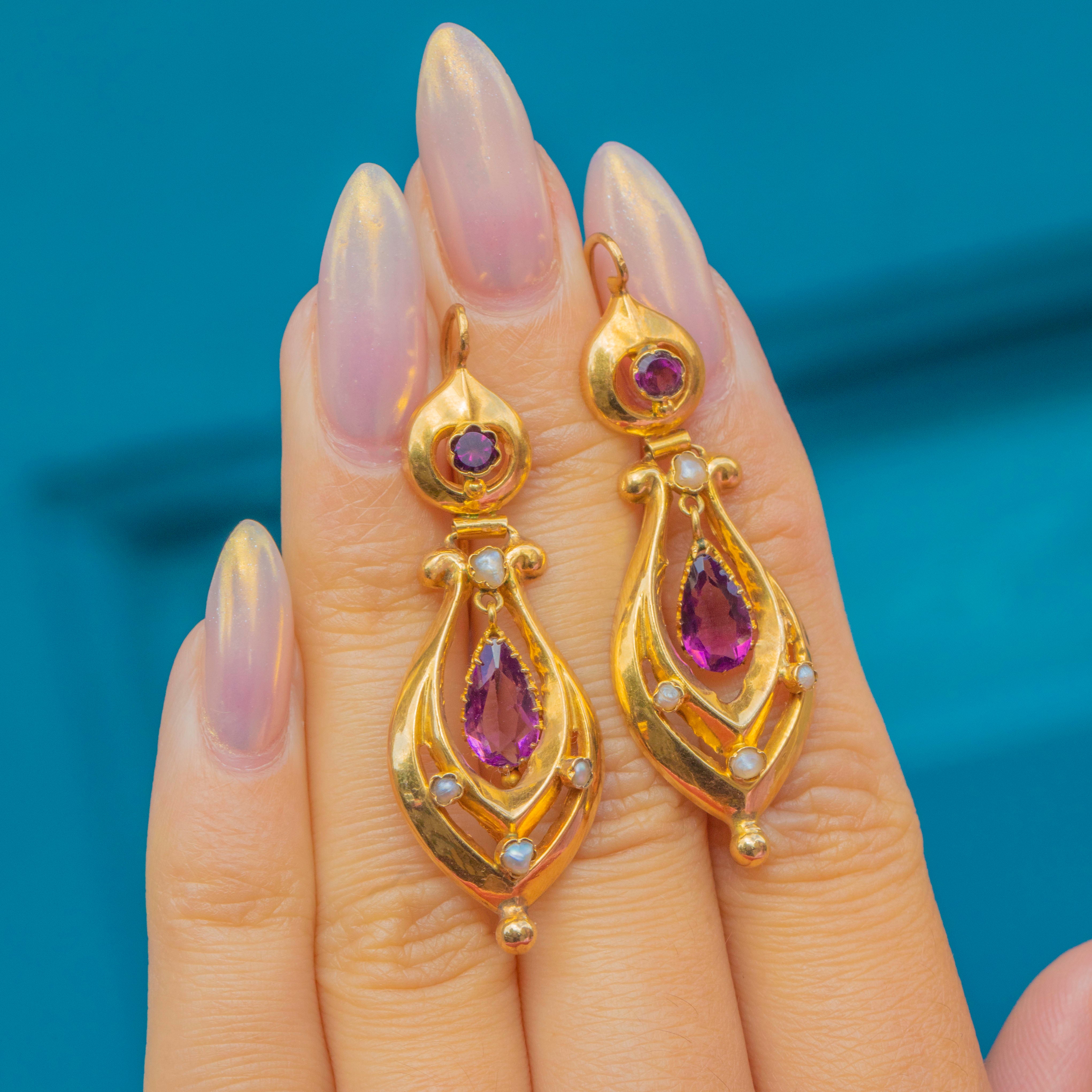 Antique French 18ct Gold Amethyst Pearl Drop Earrings, c.1890