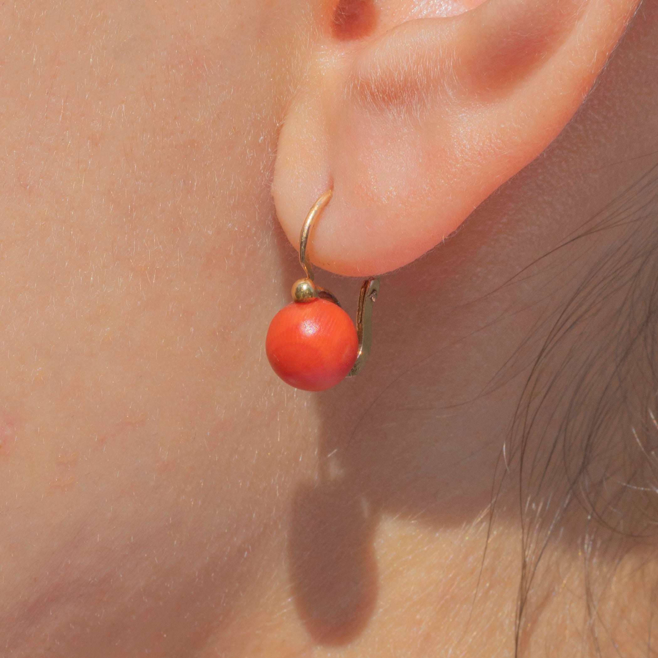 VERY GOOD: These French Coral earrings are in very good antique condition. The Coral orbs are delightfully domed and satisfying to touch. There is a small nick to the surface of one of the Corals, which is only noticeable under close inspection. Complete with 18ct Gold levers, they sit ever so elegantly in the lobe.