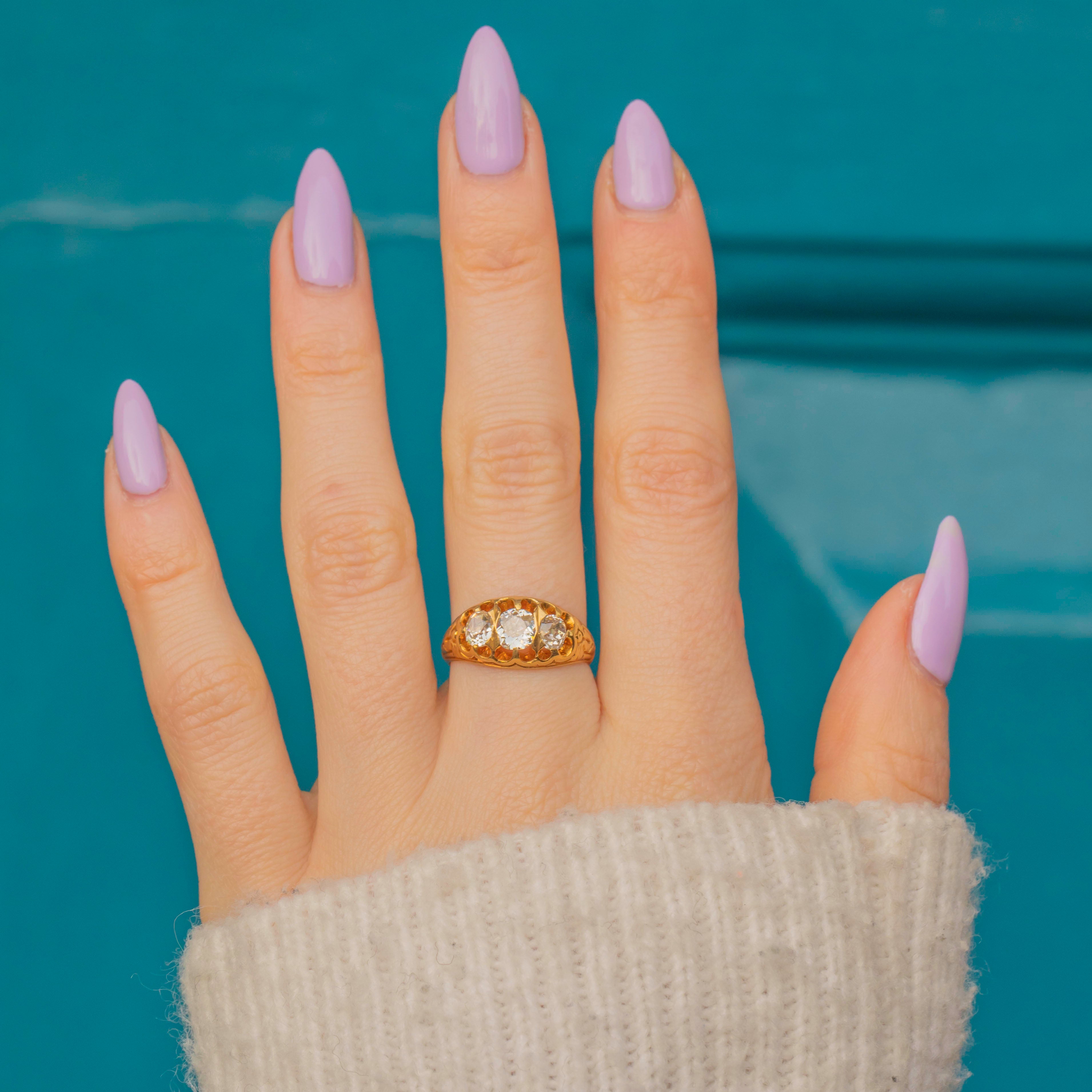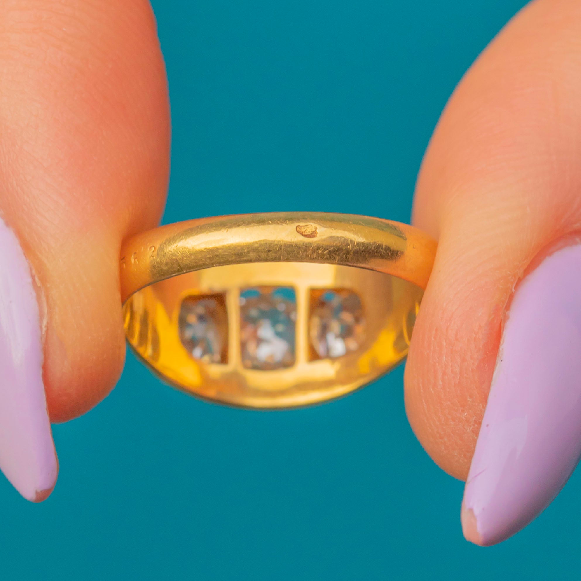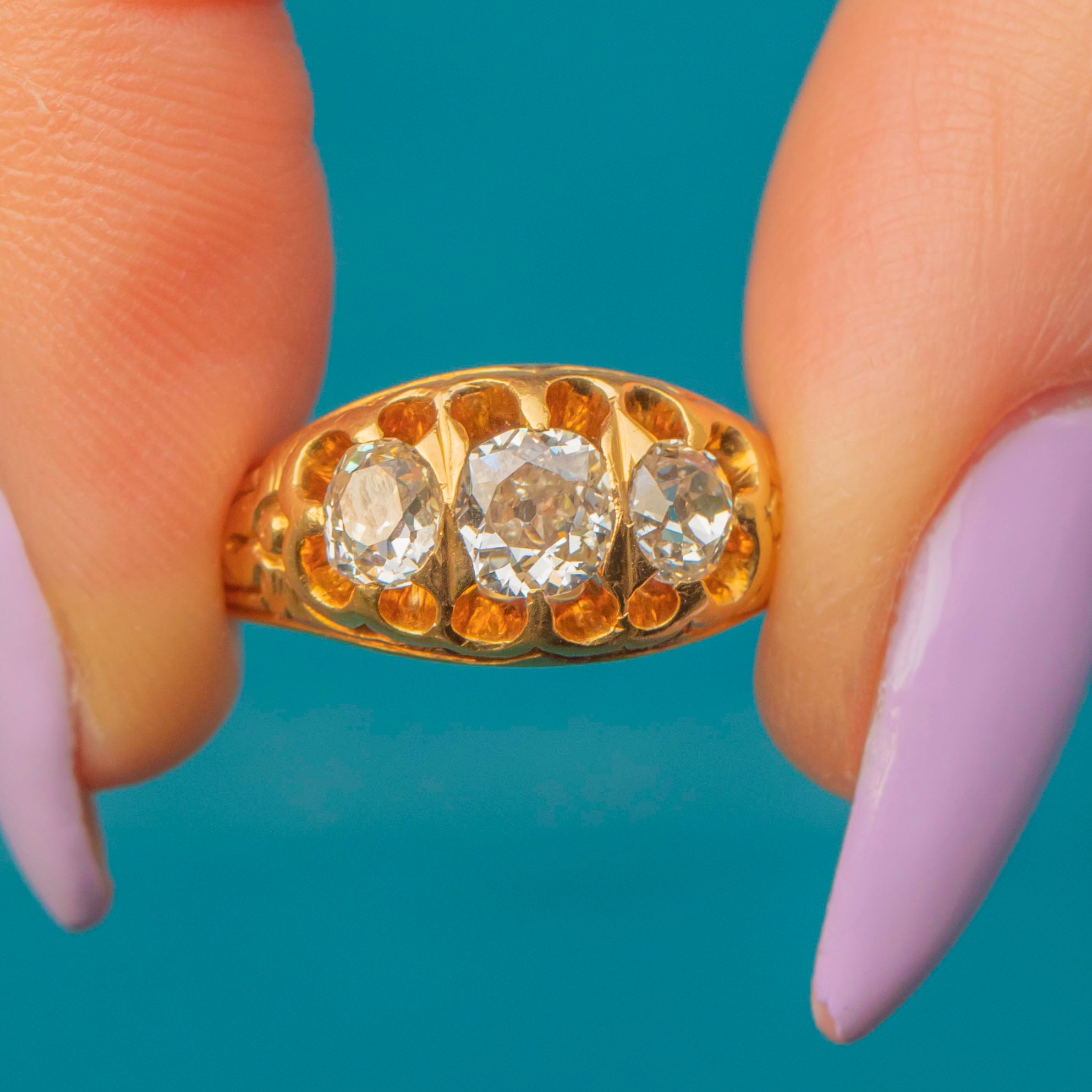 We are obsessed with this antique French 18ct Gold old mine cut Diamond trilogy ring! Boasting 1.00ct of bright, sparkly old-cut Diamonds, this antique trilogy ring is very impressive.